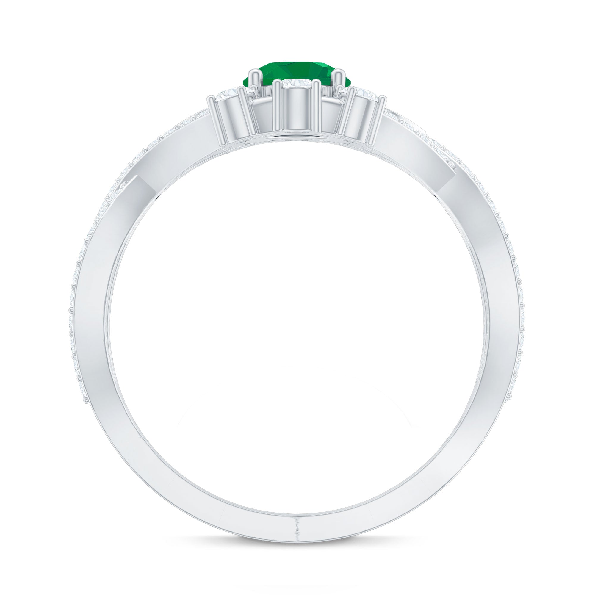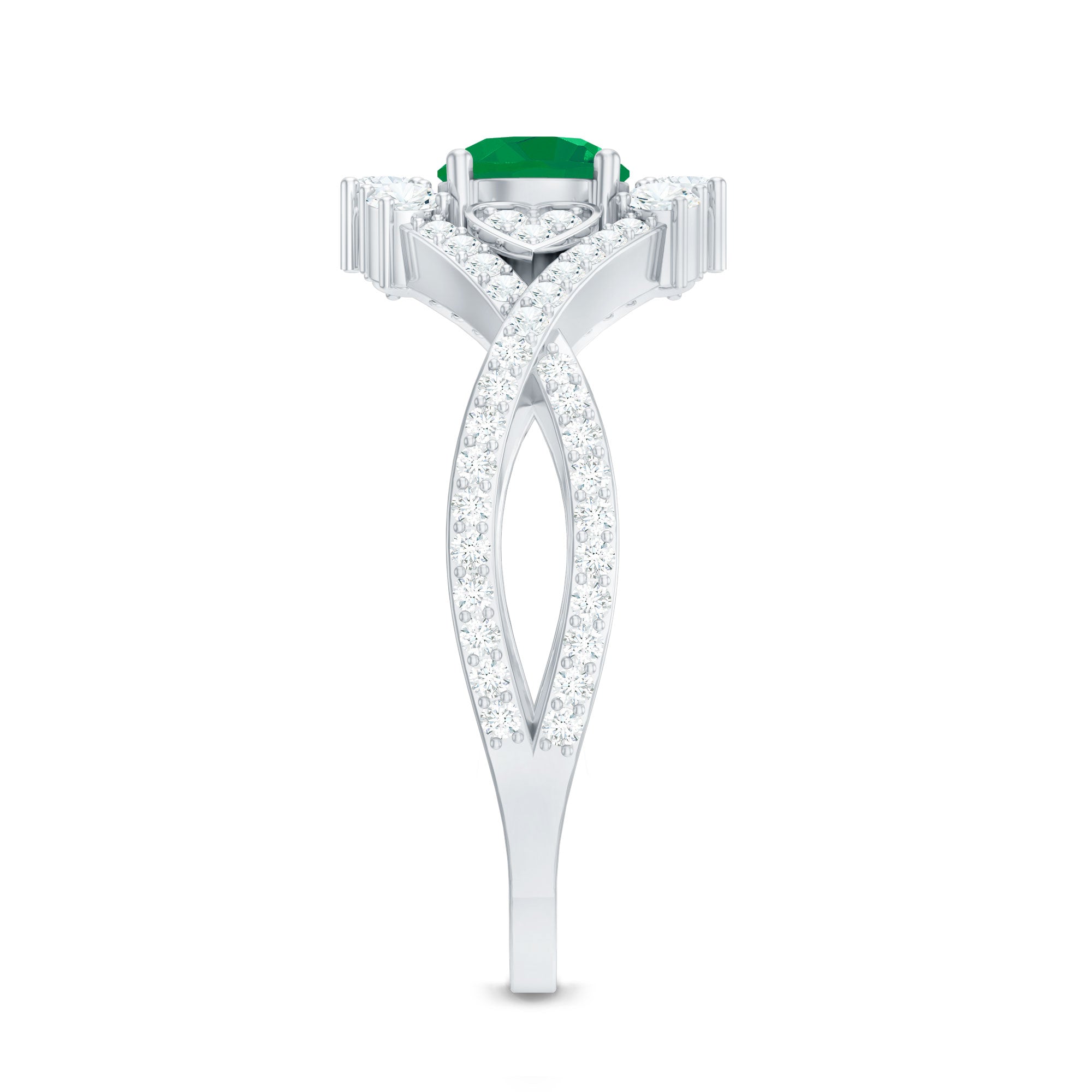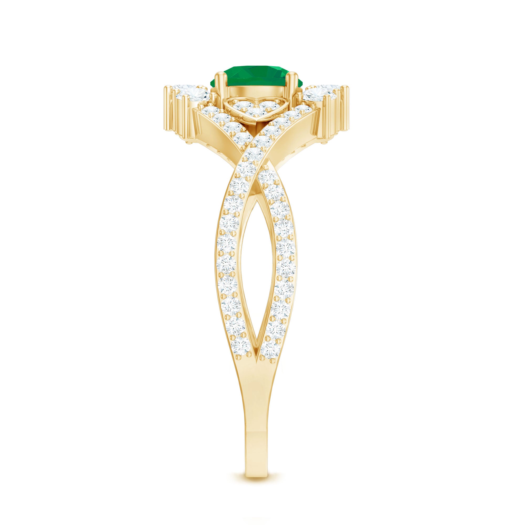 Timeless romance meets modern elegance in this Antique Style Engagement Ring. At its center, a 5 mm Round Shape Emerald captures the eye, its rich green hue radiating life and devotion. Flanking the center stone, a delicate horizontal Heart motif on either side, adorned with sparkling Diamond stones, adds a whisper of vintage charm. The Crossover Shank, studded with Diamond stones, wraps gracefully around the finger, symbolizing two lives intertwined in perfect harmony. Every curve tells a story of love, a design that honors tradition while embracing today’s style. Perfect for engagements or as a meaningful expression of eternal commitment, this Emerald Diamond Engagement Ring transforms every gesture into a celebration of the heart. Presented in a signature jewelry box and available in various sizes, this Crossover Ring is crafted to be treasured, worn and admired for a lifetime. This Vintage Looking Engagement Ring is a symbol of passion and the everlasting beauty of two hearts united.