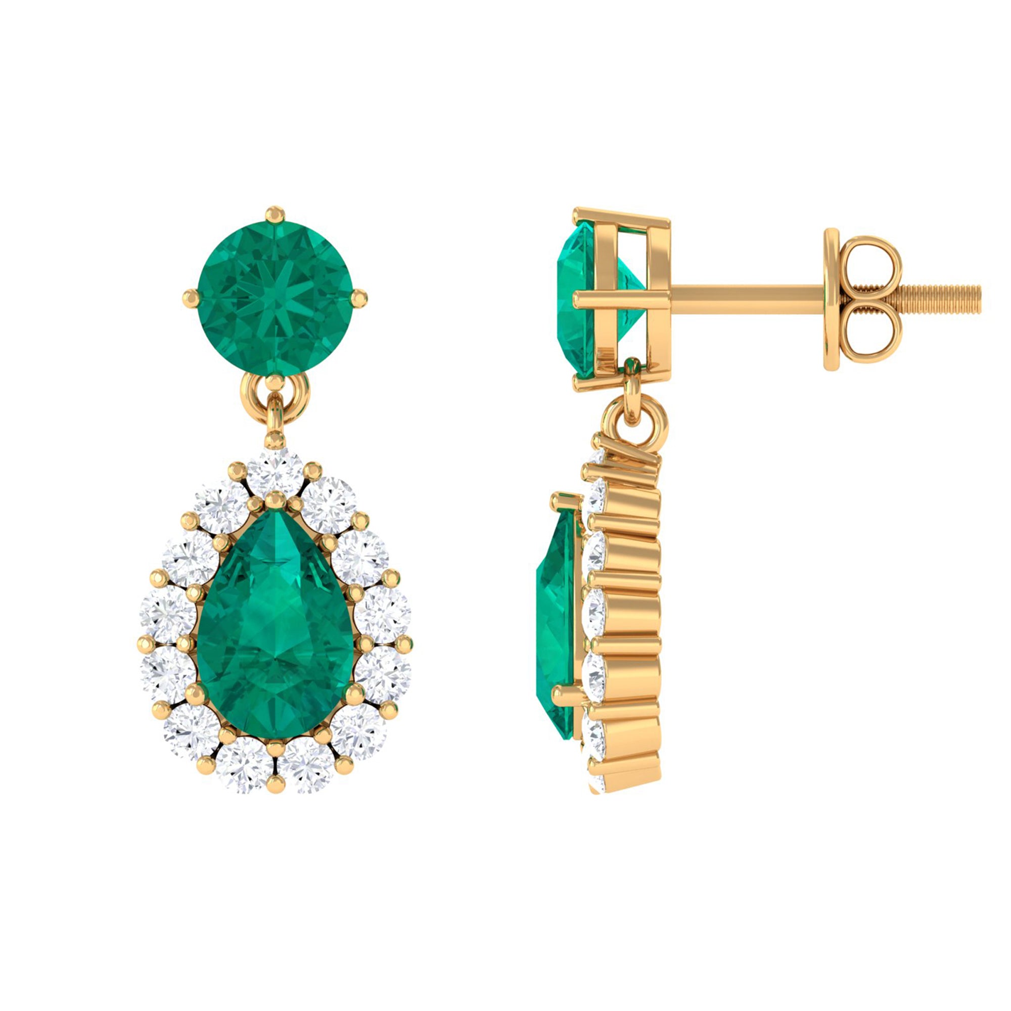 Become the center of attraction on any special occasion with these exquisite Emerald Teardrop Earrings, crafted to bring elegance and vibrant color to every moment. Each earring showcases a 4X6 mm Pear Shape Emerald framed by a sparkling Diamond Halo, creating a luminous glow that instantly catches the eye. Above the Teardrop, a 5 mm Round Shape Emerald adds an extra touch of charm, giving the design a graceful look. The secure Screw Back Closure ensures a comfortable fit, so you can enjoy their beauty from day to night without worry. The timeless design of these Emerald Diamond Earrings blends sophistication with a hint of boldness, making them perfect for weddings, romantic dinners or milestone celebrations. Presented in a beautiful jewelry box, these Emerald Drop Earrings also make a memorable gift for someone special, ideal for birthdays, anniversaries or anyone who loves elegant gemstone jewelry.