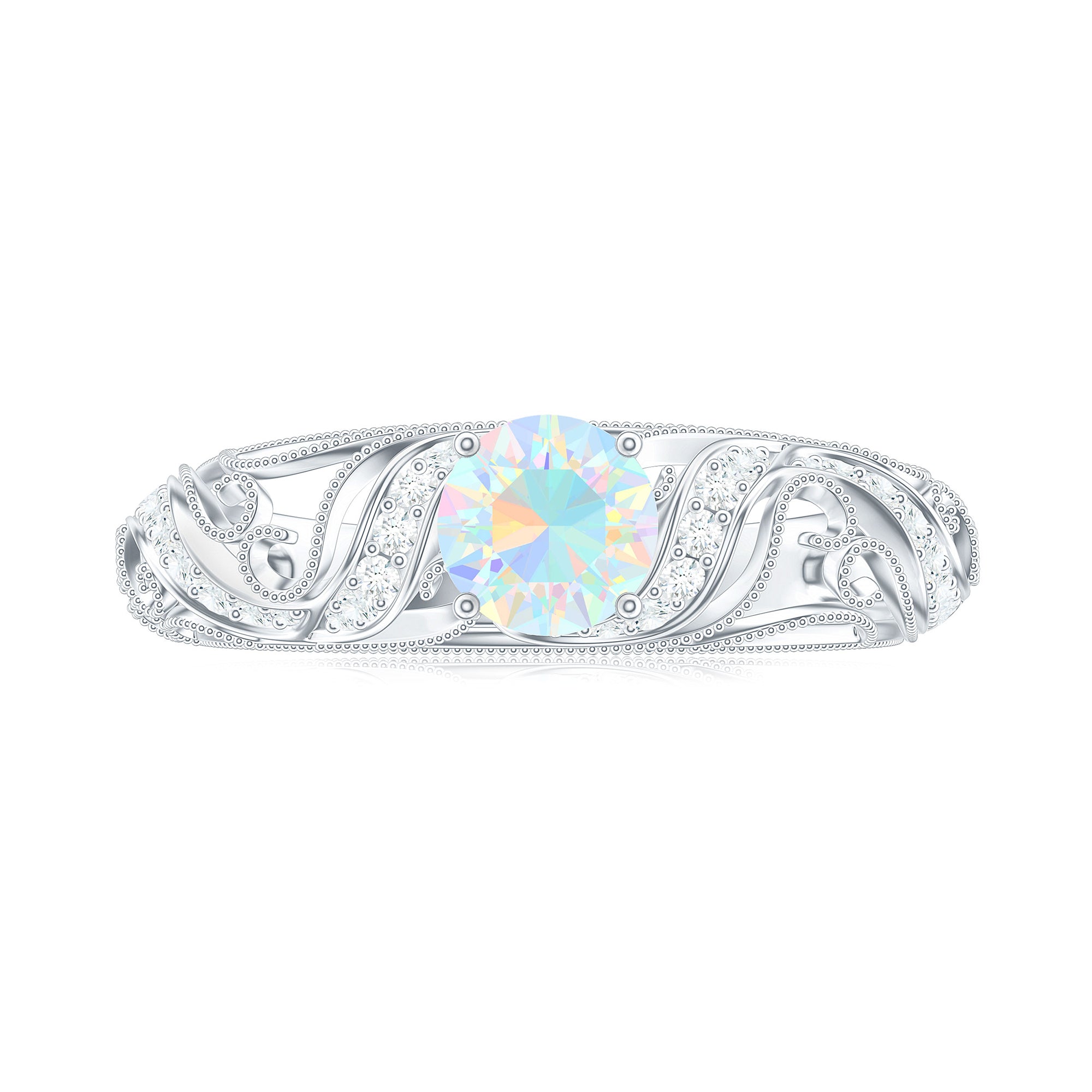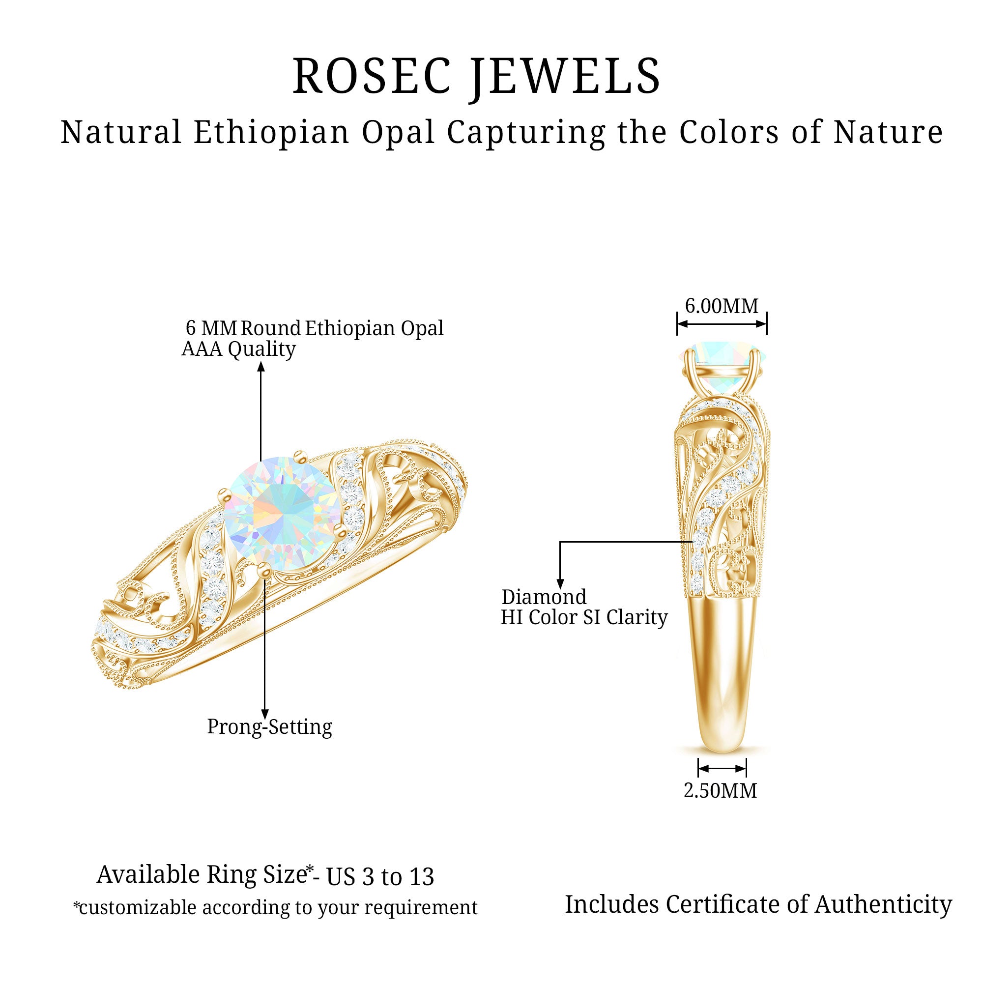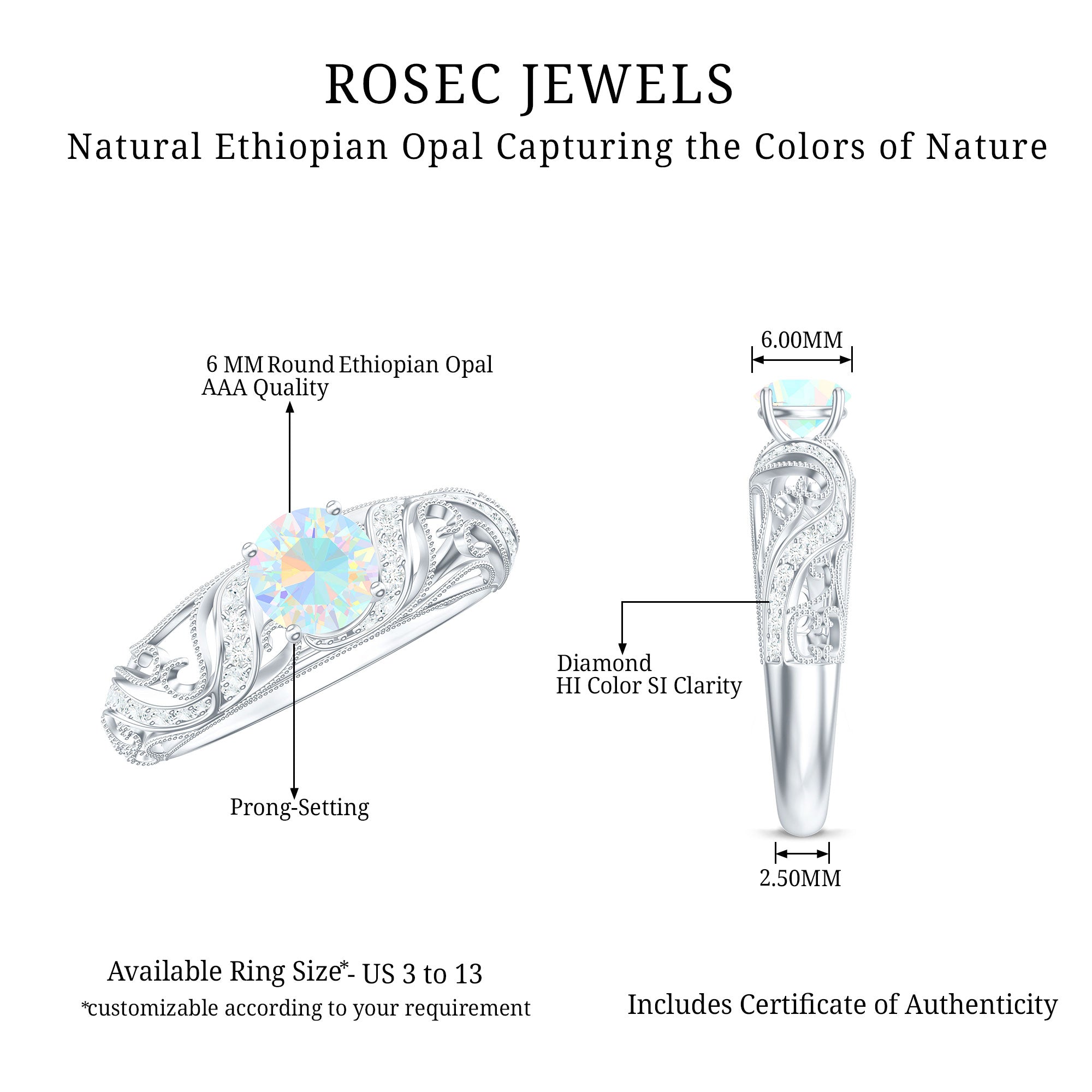 Embrace the world of vintage romance with this Vintage Inspired Engagement Ring, a mesmerizing blend of old-soul elegance and modern magic. At the center of this piece lies a captivating 6 mm Round Shape Ethiopian Opal set in Prong Setting. Framed by sparkling Diamond stones and intricate Beaded Detailing, the center stone is beautifully set within a vintage inspired band that echoes the grace of bygone eras. The delicate craftsmanship of band adds depth and texture, making this Opal Diamond Engagement Ring feel like an heirloom from day one. Perfect for the bride who adores classic aesthetics with a unique twist, this Real Opal Engagement Ring offers style and deep meaning. This Vintage Opal Engagement Ring arrives in a signature jewelry box, ready for that unforgettable moment, and is available in a range of sizes to ensure the ideal fit. Whether you are drawn to its antique charm or the glow of the opal, this Real Opal Engagement Ring is a celebration of eternal love.