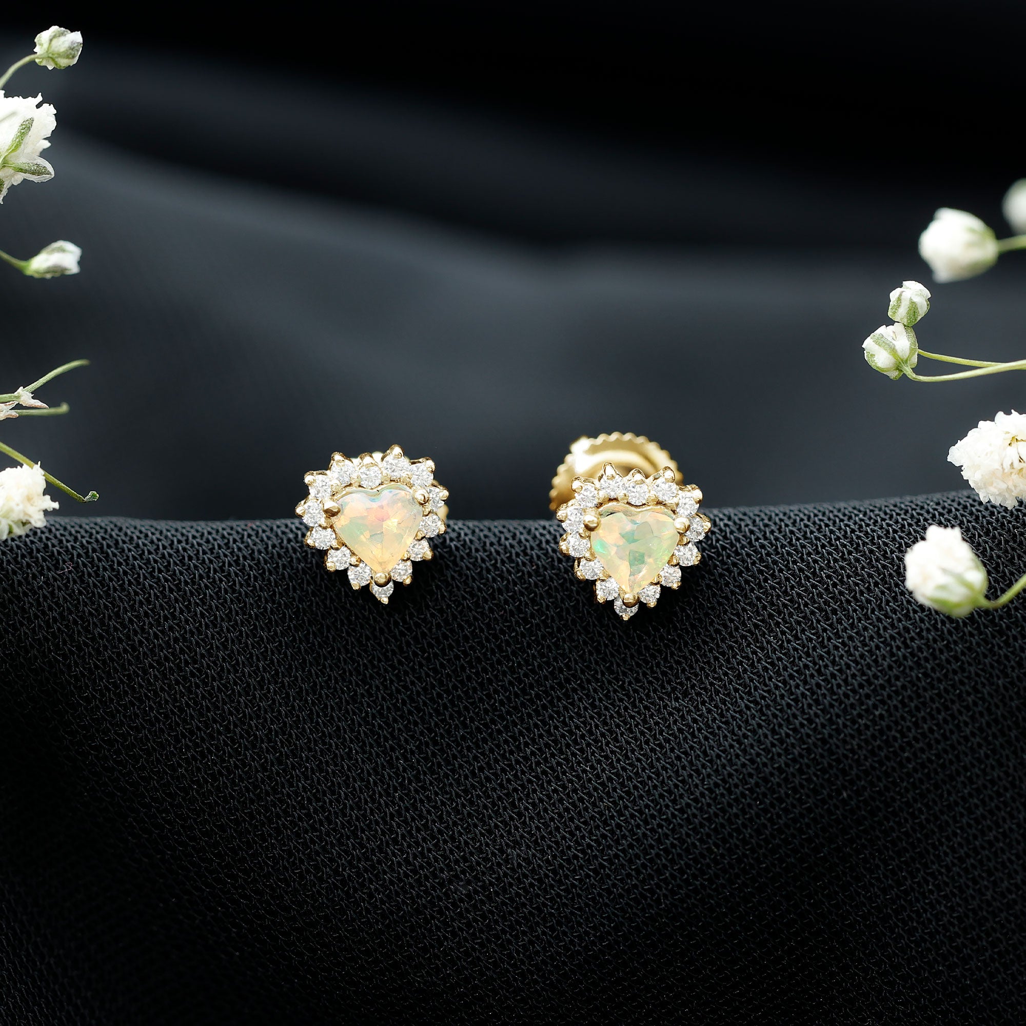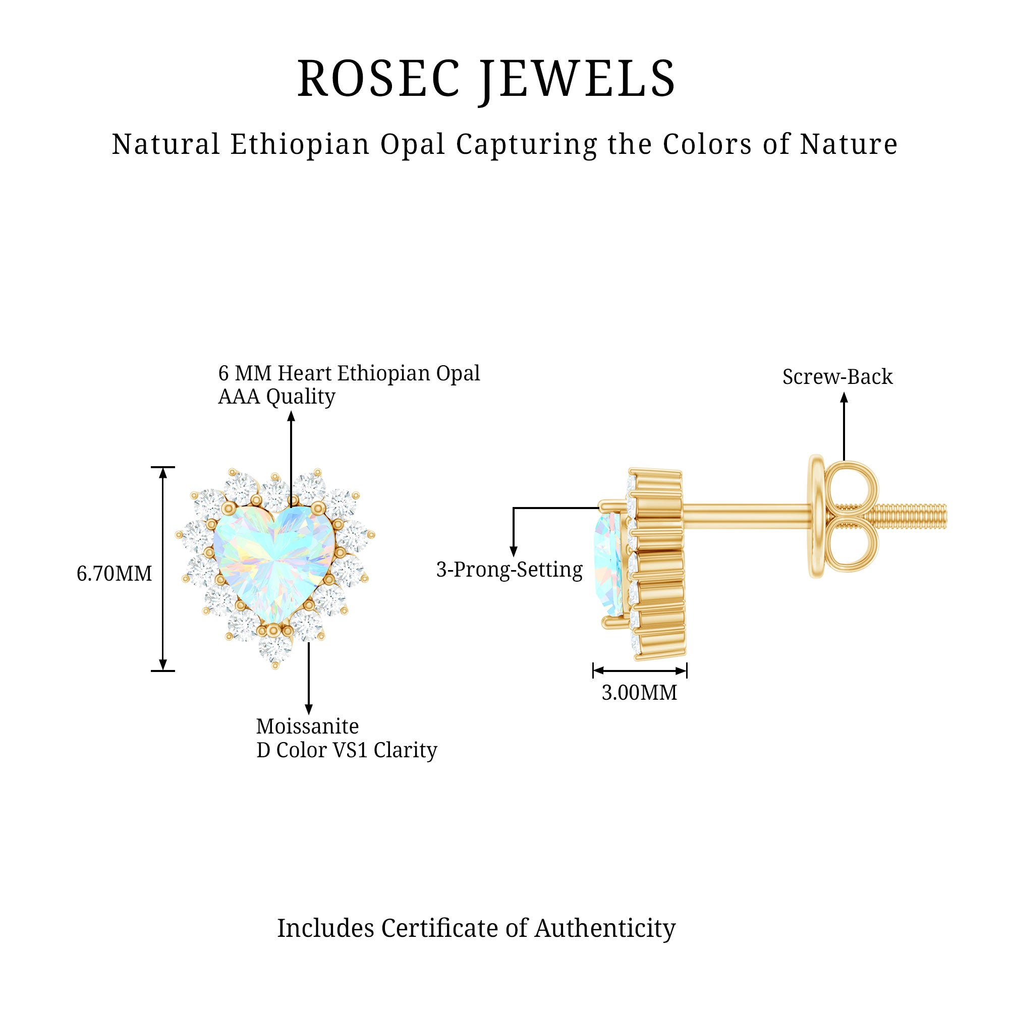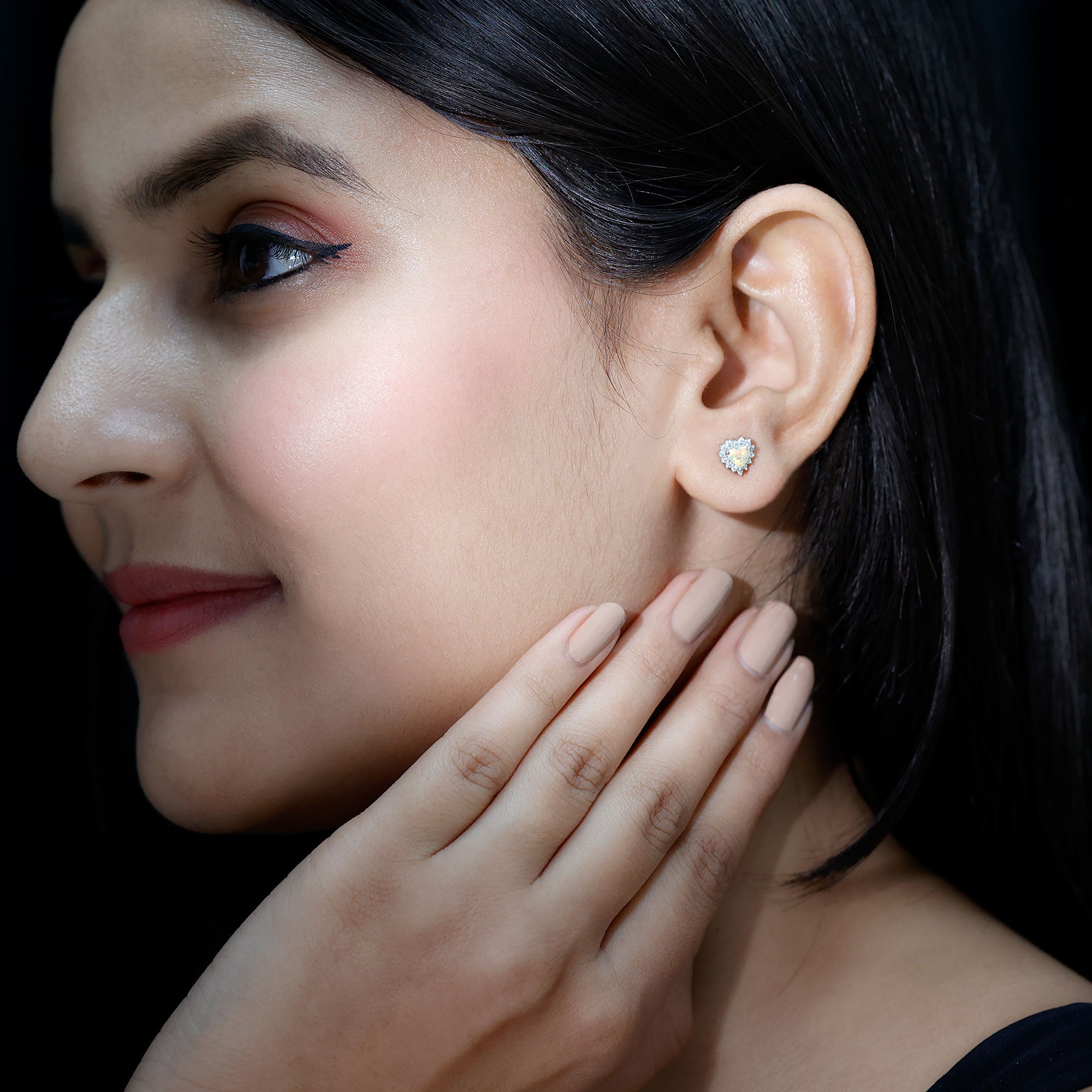 Fall in love with the enchanting beauty of these stunning Ethiopian Opal Stud Earrings. A mesmerizing 6 MM heart shaped ethiopian opal gemstone takes center stage, captivating with its vivid play of color in shades of red, green, and blue. The opal is surrounded by a halo of sparkling moissanite stones, adding a touch of timeless glamour. These Heart Stud Earrings are set with AAA quality ethiopian opal and D-VS1 quality moissanites, lending a luxurious feel. They make the perfect gift for a loved one or a special treat for yourself. Whether dressing up or keeping it casual, these Heart Opal Earrings will elevate any outfit. They are versatile enough to wear from day to night and are sure to become a cherished piece in your jewelry collection. The secure screw back closure of these Halo Earrings embraces the earlobe, ensuring they stay in place throughout the day. They are perfect for making a bold statement in your jewelry collection and will arrive in premium packaging along with a certificate of authenticity.
