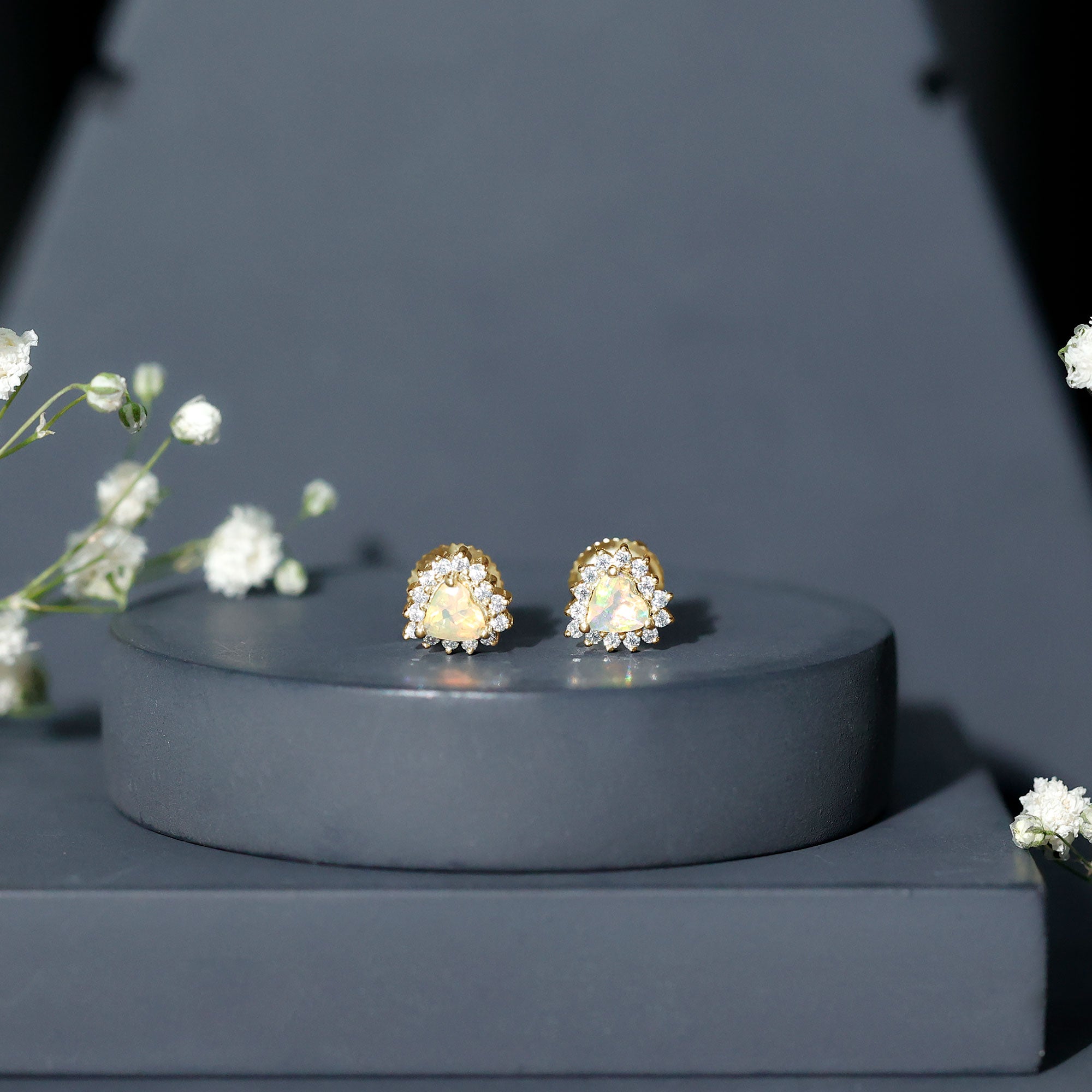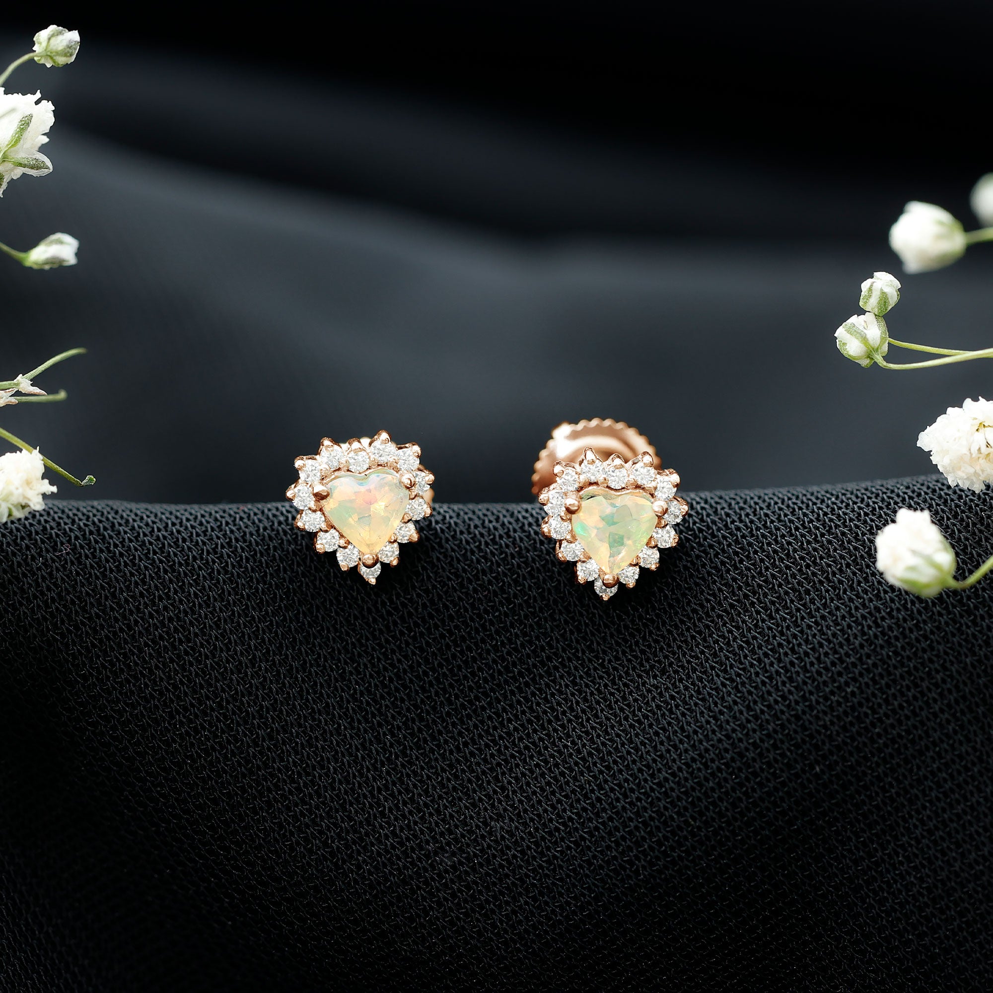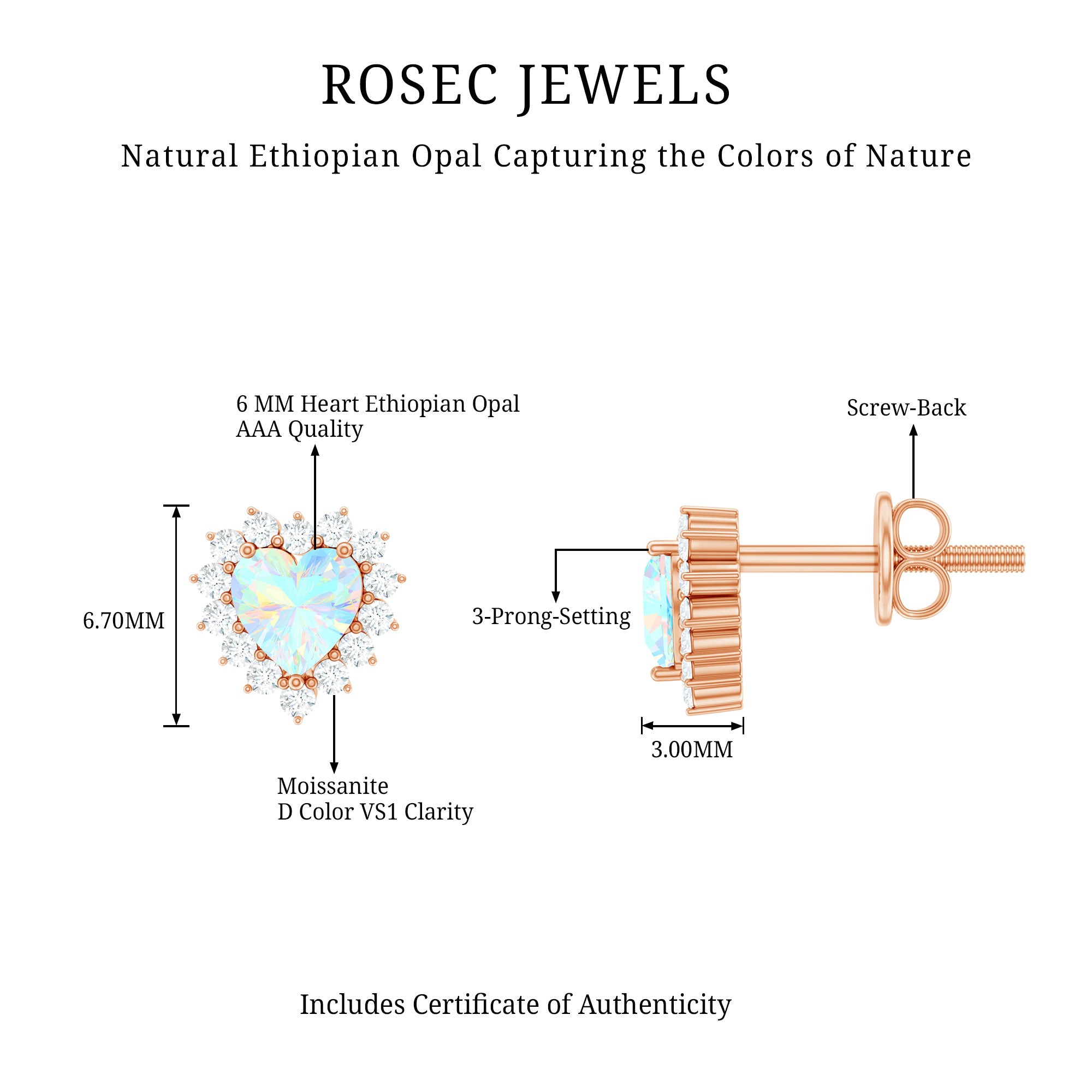 Fall in love with the enchanting beauty of these stunning Ethiopian Opal Stud Earrings. A mesmerizing 6 MM heart shaped ethiopian opal gemstone takes center stage, captivating with its vivid play of color in shades of red, green, and blue. The opal is surrounded by a halo of sparkling moissanite stones, adding a touch of timeless glamour. These Heart Stud Earrings are set with AAA quality ethiopian opal and D-VS1 quality moissanites, lending a luxurious feel. They make the perfect gift for a loved one or a special treat for yourself. Whether dressing up or keeping it casual, these Heart Opal Earrings will elevate any outfit. They are versatile enough to wear from day to night and are sure to become a cherished piece in your jewelry collection. The secure screw back closure of these Halo Earrings embraces the earlobe, ensuring they stay in place throughout the day. They are perfect for making a bold statement in your jewelry collection and will arrive in premium packaging along with a certificate of authenticity.