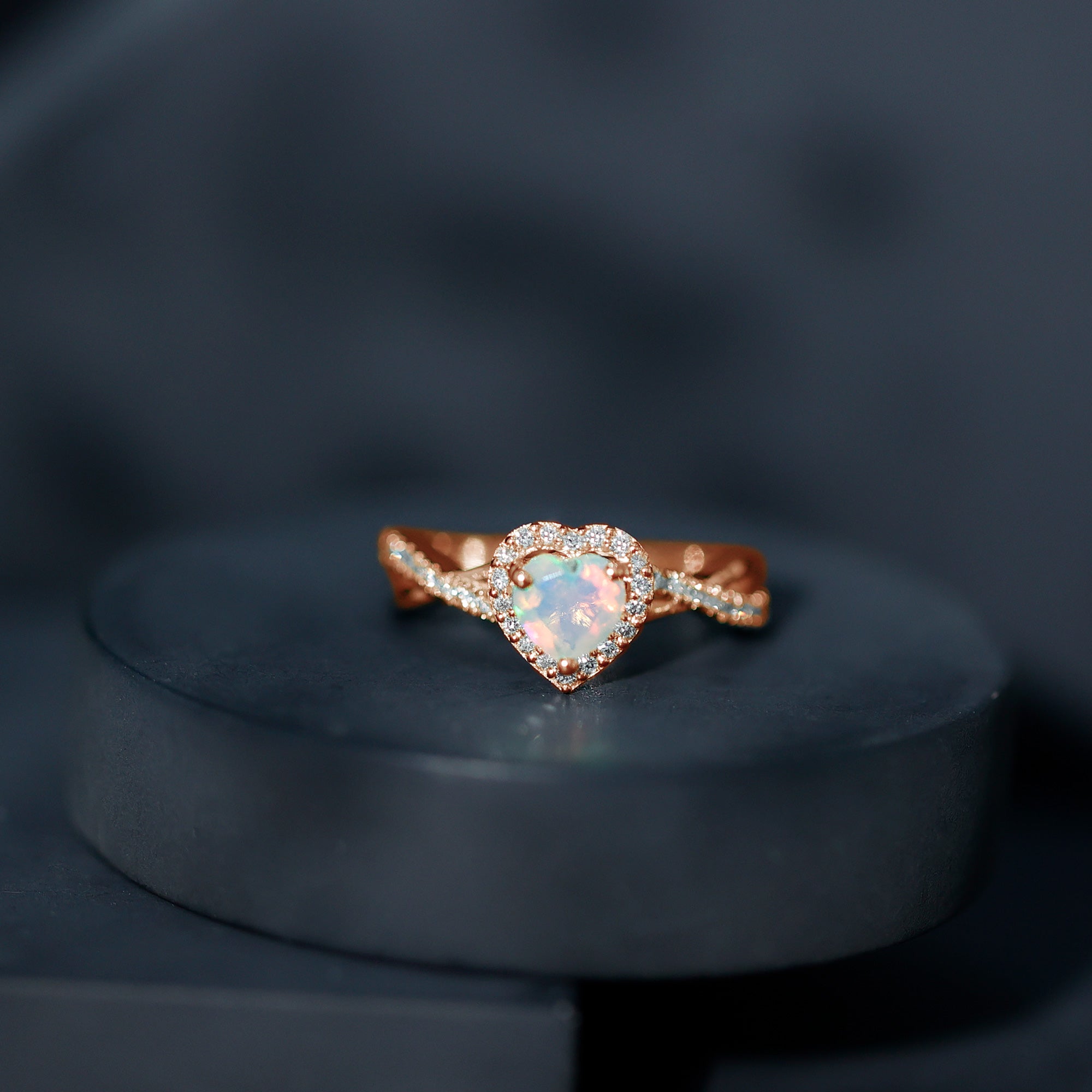 Embody the spirit of true love with this Heart Shaped Engagement Ring, a stunning symbol of affection and devotion. At the center of this stunning design is a 6 mm Heart Shape Ethiopian Opal set in Prong Setting, glowing with an incredible play of color. Surrounded by a sparkling Diamond Halo and set on a Crossover Shank adorned with dainty Diamond stones, this Halo Engagement Ring with Opal exudes timeless elegance with a modern twist. The captivating beauty of opal is perfectly complemented by the diamond stones, creating a look that is both striking and sophisticated. Whether you are proposing, celebrating an anniversary or simply marking a milestone, this Opal Heart Ring is a radiant reflection of your eternal love. Crafted with perfection and care, the Crossover Ring comes beautifully packaged in a signature jewelry box, ready to impress. Available in various sizes to ensure the perfect fit, this Opal Diamond Engagement Ring is an unforgettable piece that will dazzle for years to come. For the woman who seeks something truly extraordinary, this Ethiopian Opal Ring is a celebration of love, passion and the moments that take your breath away.