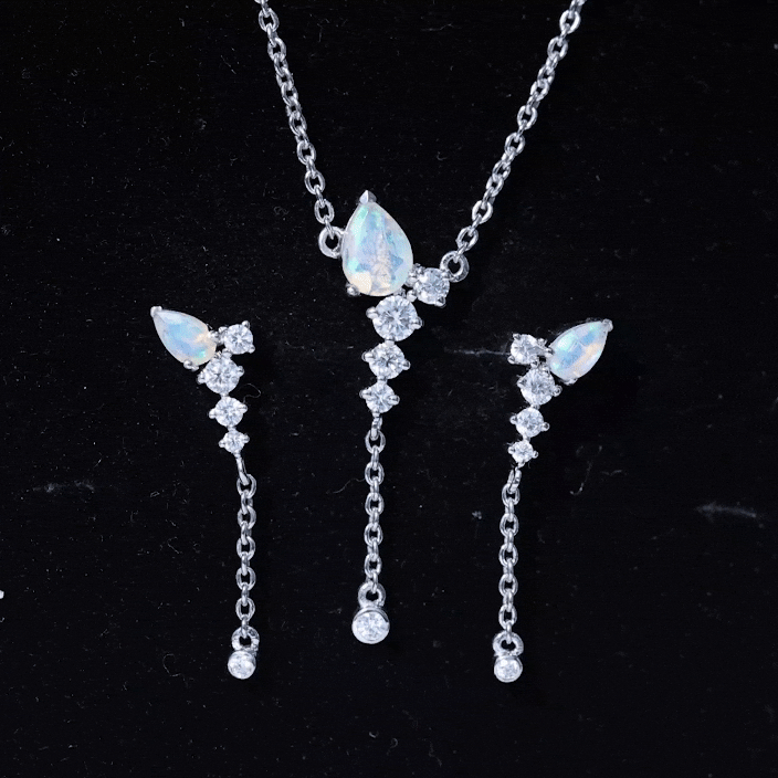 The beautiful Pear Cut Ethiopian Opal in Prong Setting at the top with Moissanite drop with a delicate chain on Jewelry Set sure to leave you stunned. Comes with a matching pair of earrings with a Screw Back closure is perfect to put on your special day. Present this Drop Jewelry Set to your dearest one as a token of love that we are sure she will find super romantic and charming.