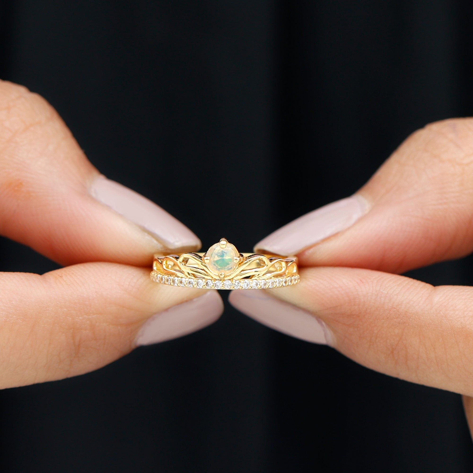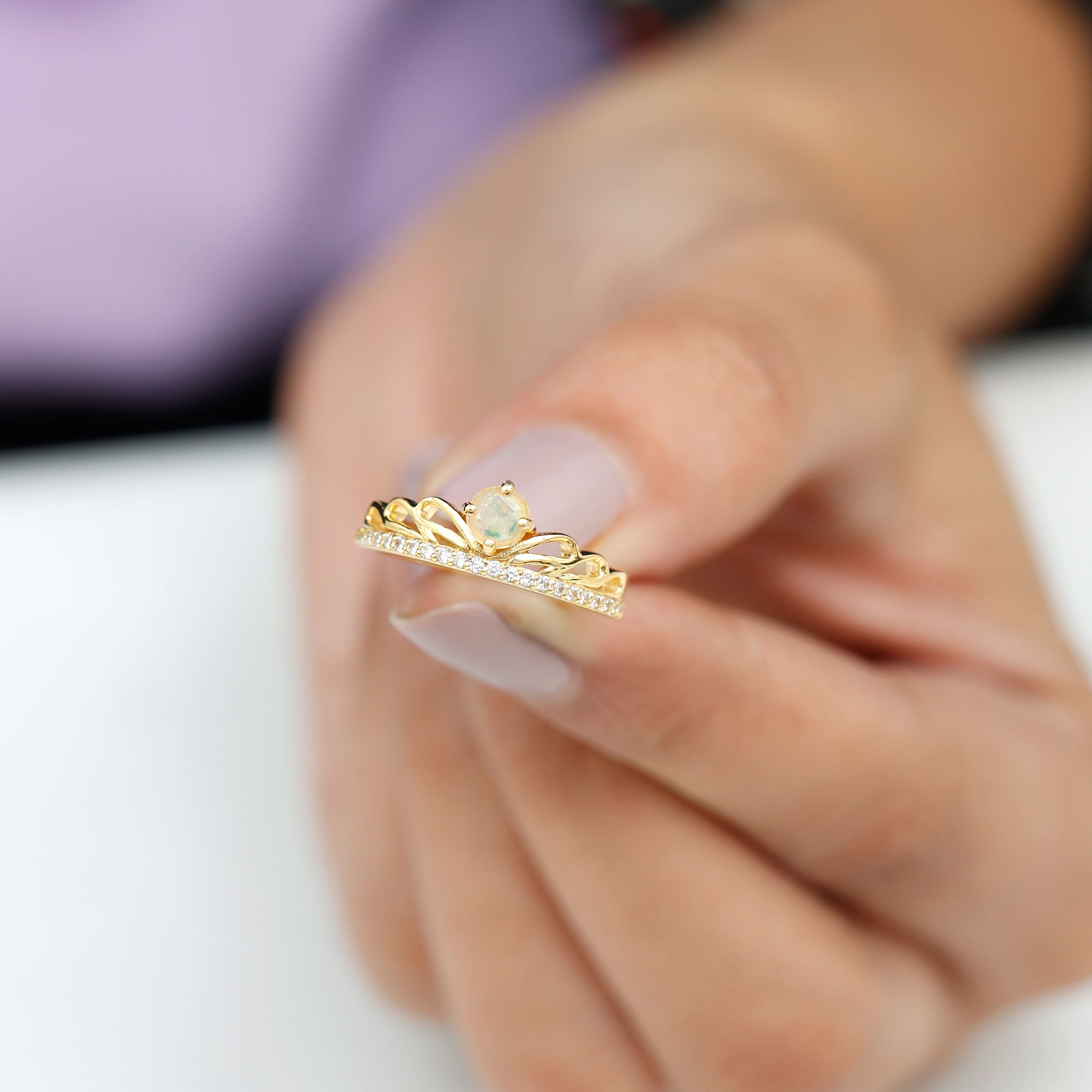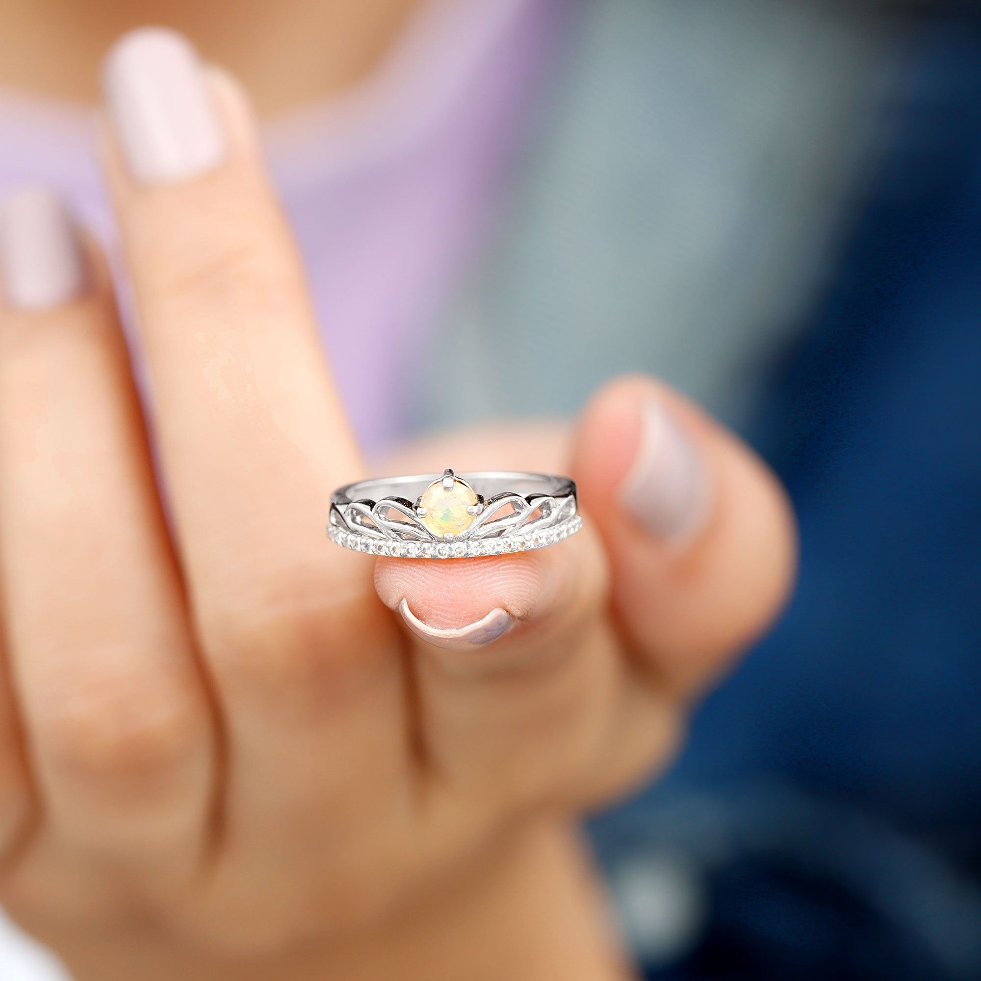 Step into a fairytale with this Crown Promise Ring, a dreamy symbol of love, royalty and radiant beginnings. At the center of this enchanting design sits a glowing 4 mm Round Shape Ethiopian Opal set in Prong Setting, known for its mesmerizing play of colors. Placed at the center of a delicately crafted Crown and framed by sparkling Diamond stones, the Opal captures the depth and wonder of your connection. The regal crown motif adds a whimsical charm, perfect for the one who rules your heart. Whether you are marking a promise, celebrating a milestone or simply saying you are my queen, this Opal Diamond Ring turns the moment into pure magic. Designed for comfort and elegance, this Commitment Ring comes in a range of sizes for the perfect fit and arrives in a beautiful jewelry box, ready to gift and guaranteed to dazzle. Sparkly and full of charm, this Opalescent Ring is a wearable love story made just for her.