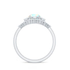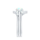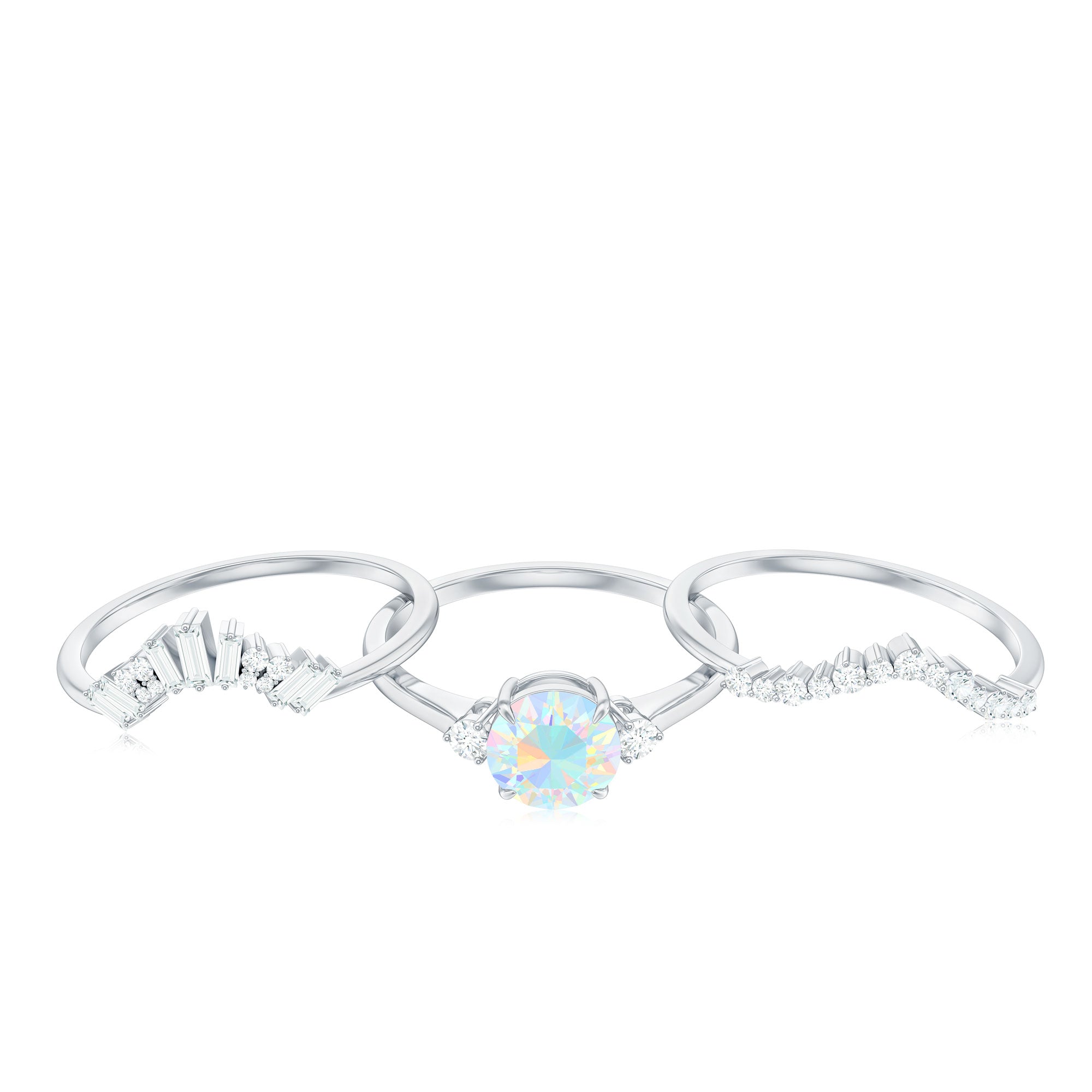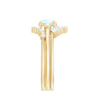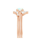 A three-piece bridal set offers visual harmony, allowing each ring to complement the others in shape and structure. The engagement ring highlights the natural opal, while diamond accents introduce refined brilliance. The accompanying bands are designed to frame the center ring, forming a cohesive and balanced silhouette when worn together.