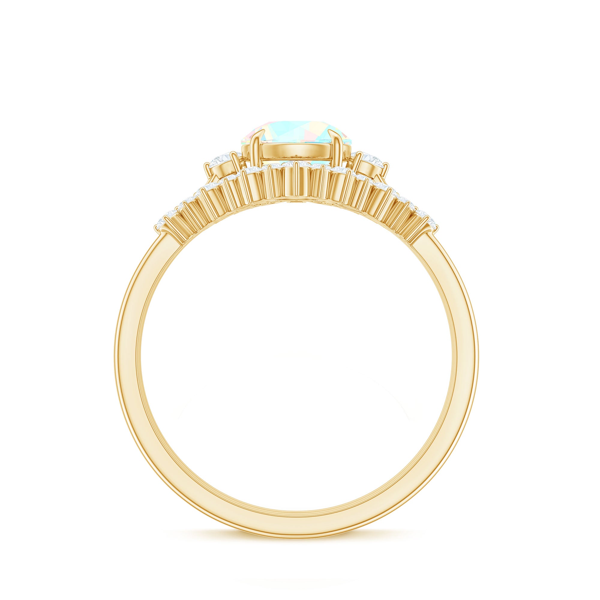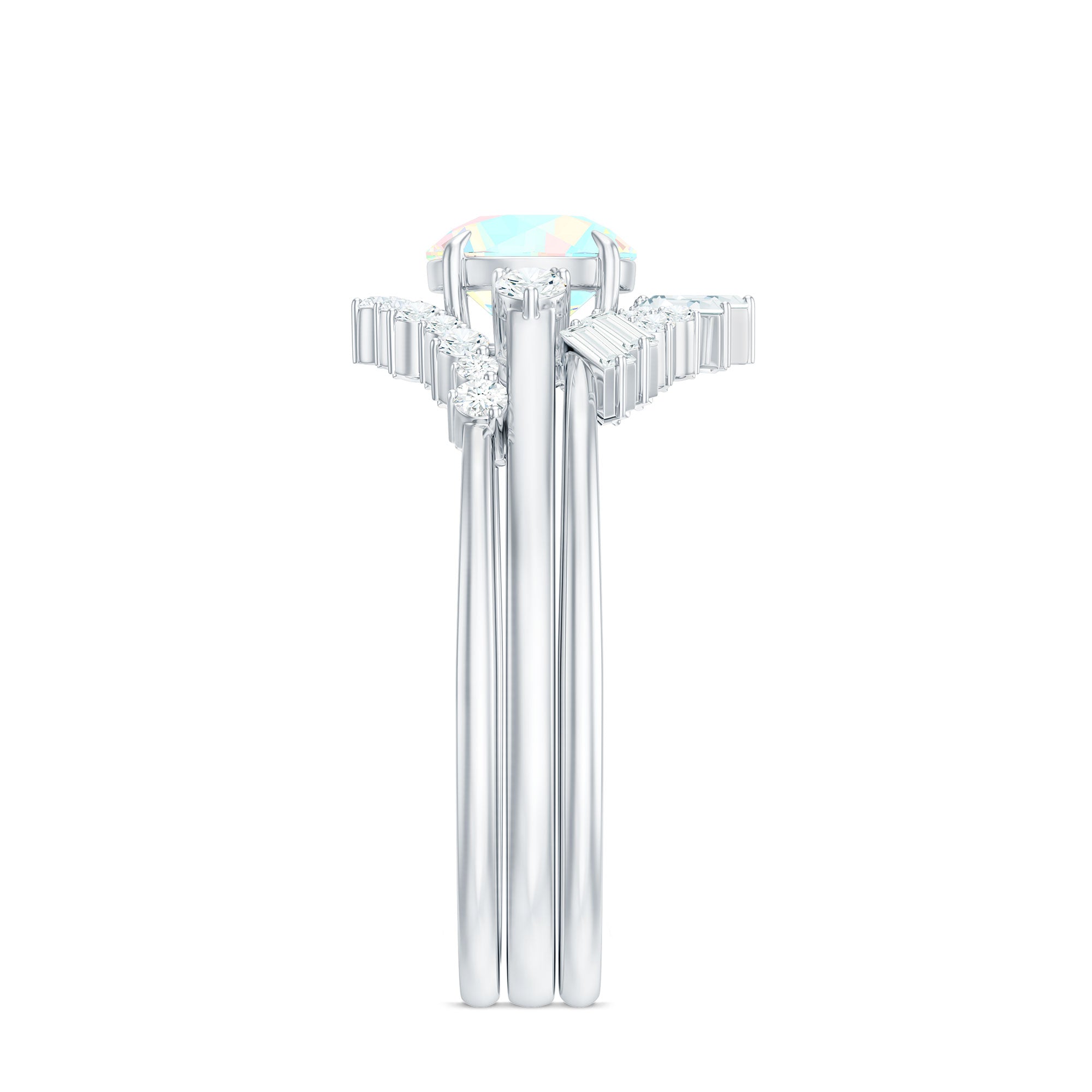 Ethiopian rainbow opal is admired for its play of color, displaying shifting hues under different lighting conditions. As a natural gemstone, each opal can exhibit unique patterns and tonal variations. Diamonds are valued for their durability and sparkle, offering contrast and structural strength within bridal jewelry.