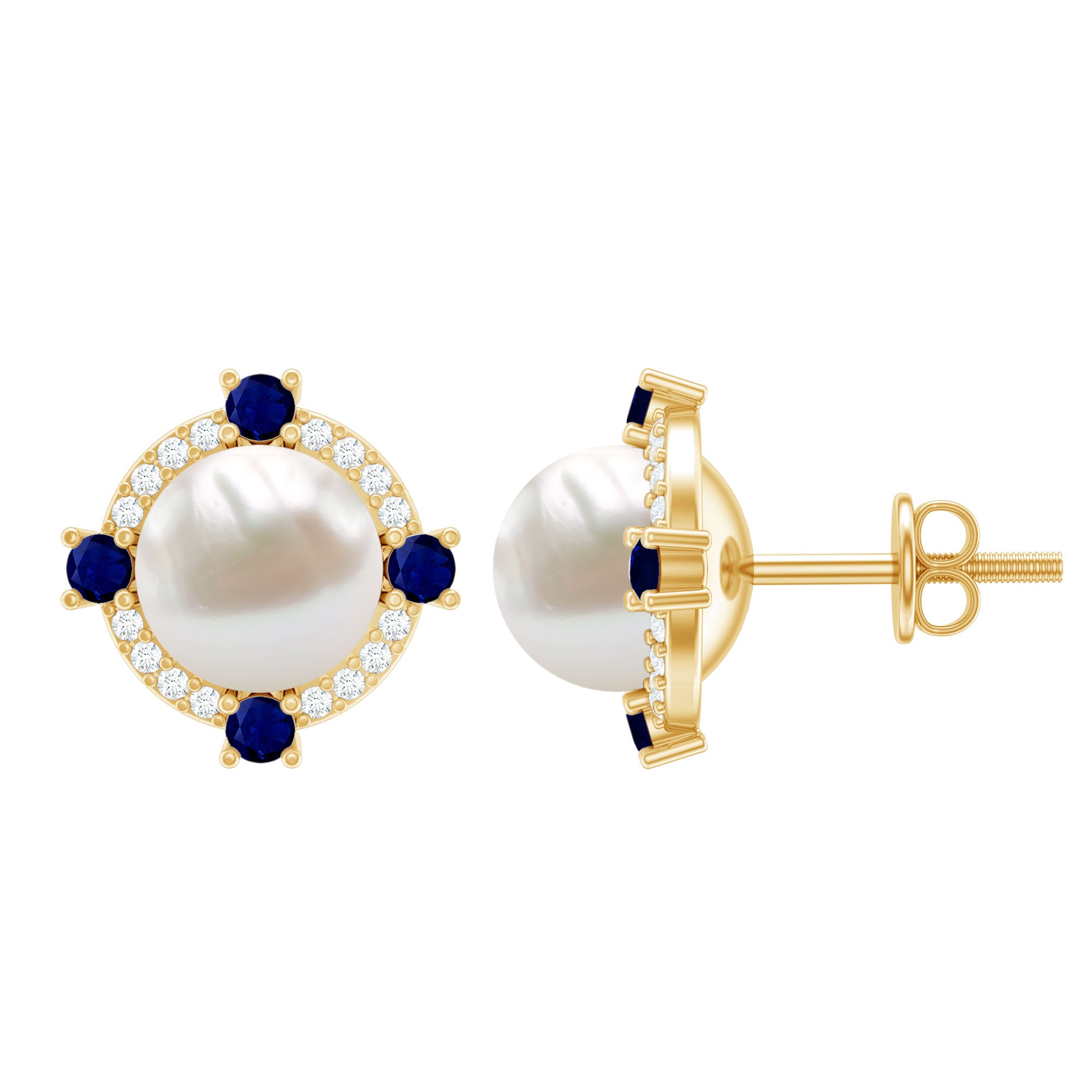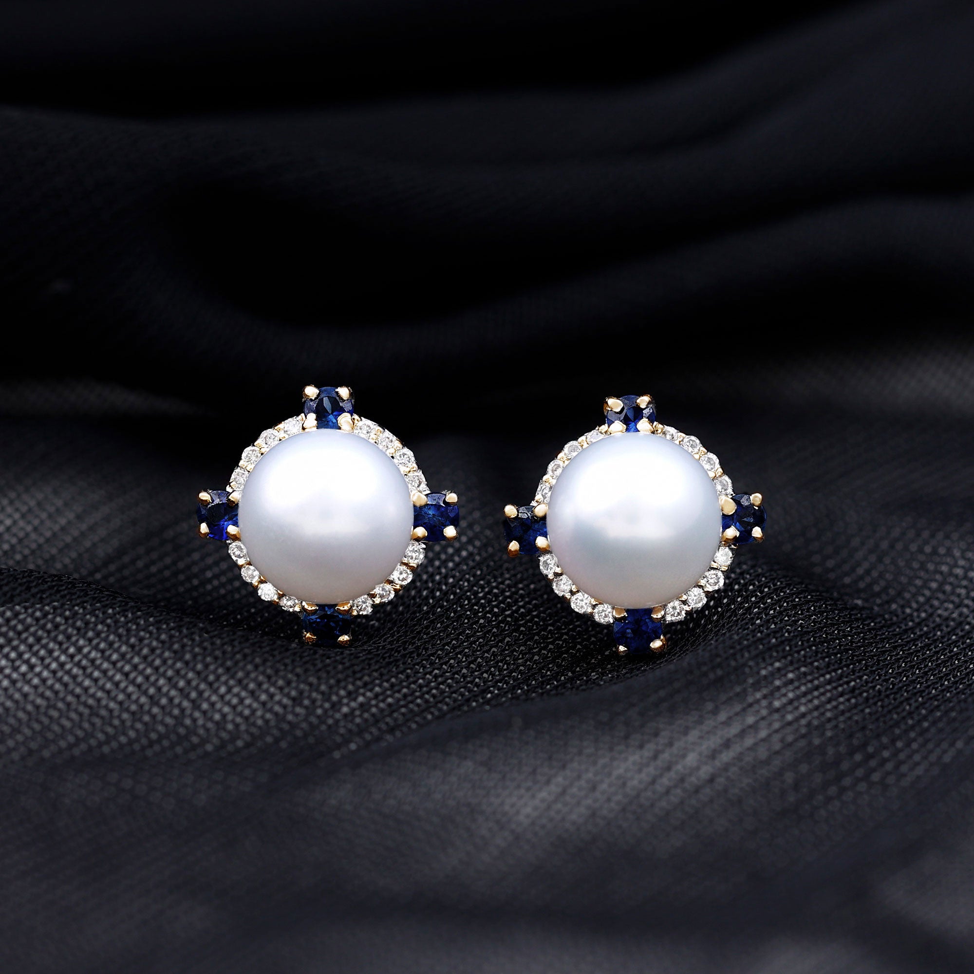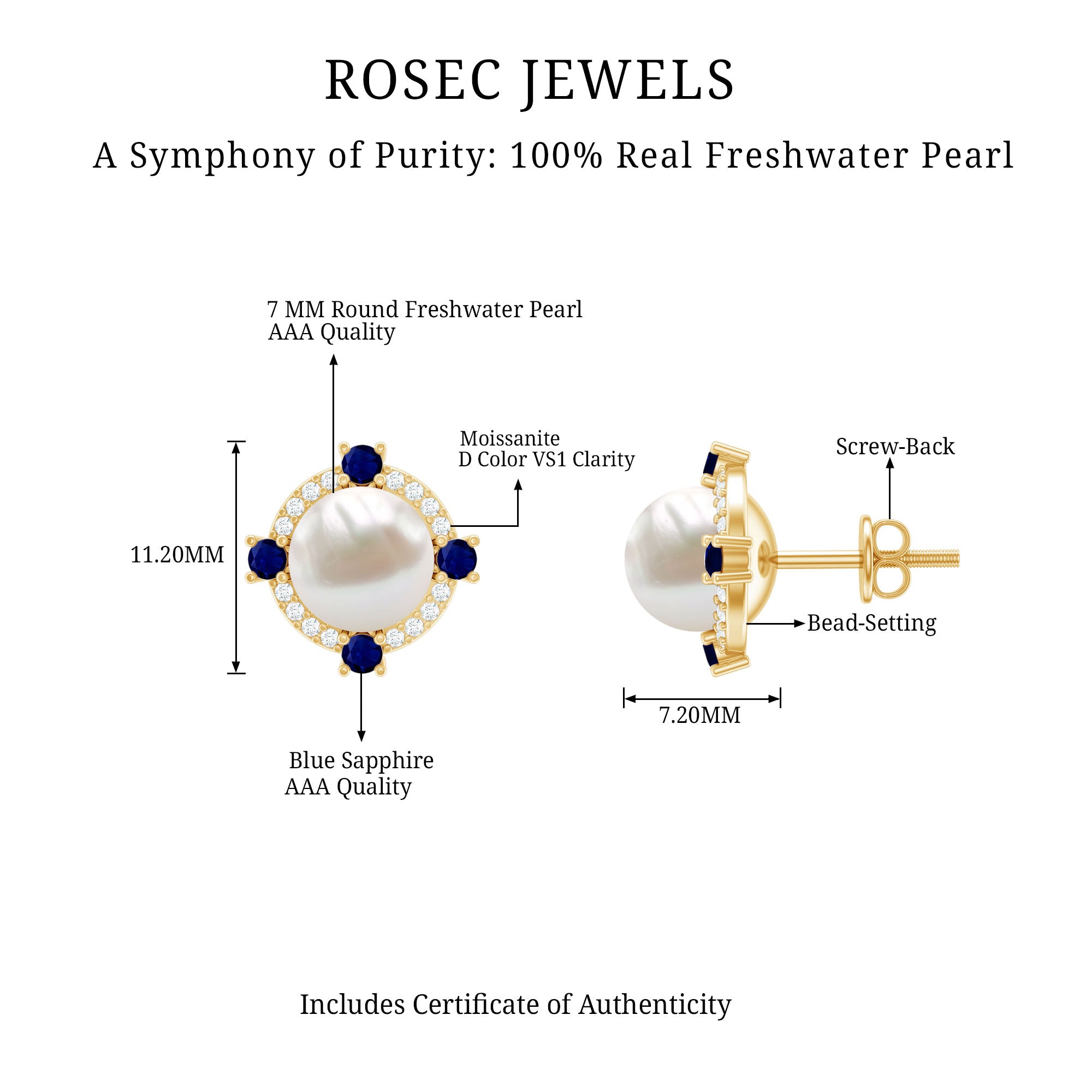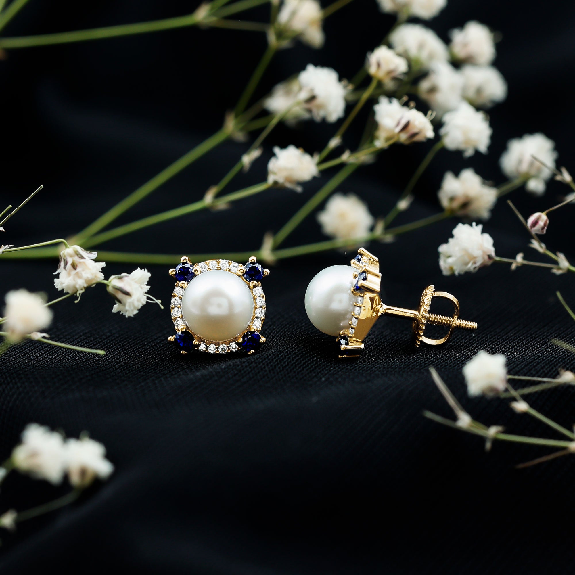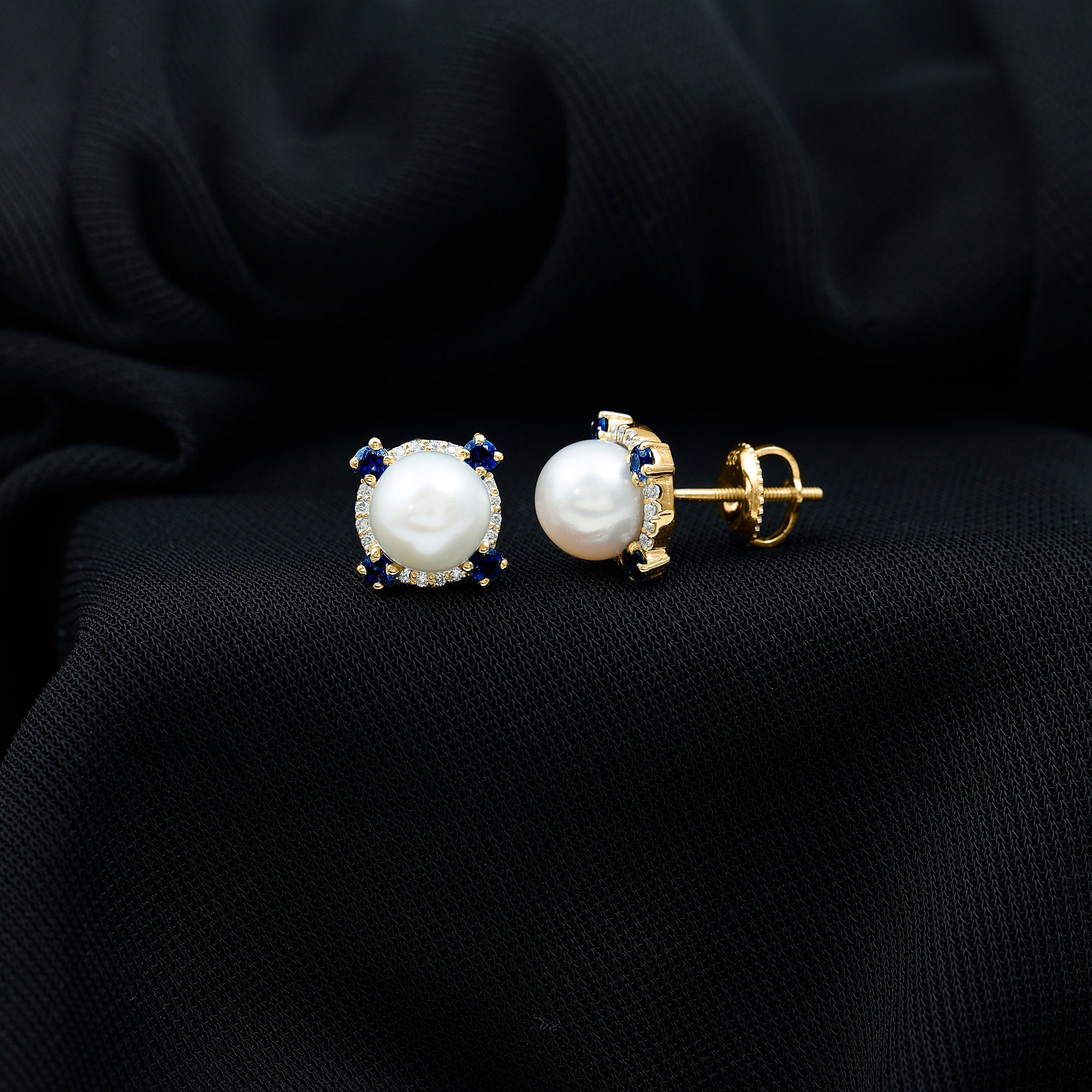 Step into a little moment of royalty where your style feels lifted, elegant, and truly special. These Freshwater Cultured Pearl Earrings are made to bring that graceful charm to your everyday look. At the center sits a glowing 7 MM freshwater pearl, surrounded by a beautiful mix of sparkling stones arranged in a halo pattern. Bright moissanite stones add a white shine, while blue sapphires bring a luxurious pop of color. Together, they create a look that feels timeless and full of character. Whether you are dressing up for a wedding, adding something special to your evening outfit, or simply wanting a little royal shine on a normal day, these Pearl and Sapphire Earrings fit the moment perfectly. A screw back closure keeps the Halo Stud Earrings secure and comfortable, making them easy to wear for long hours. They stay in place, feel safe, and add a soft sparkle you will notice every time you look in the mirror. These Pearl Stud Earrings also make a thoughtful and meaningful gift for someone who loves classic beauty with a touch of luxury.