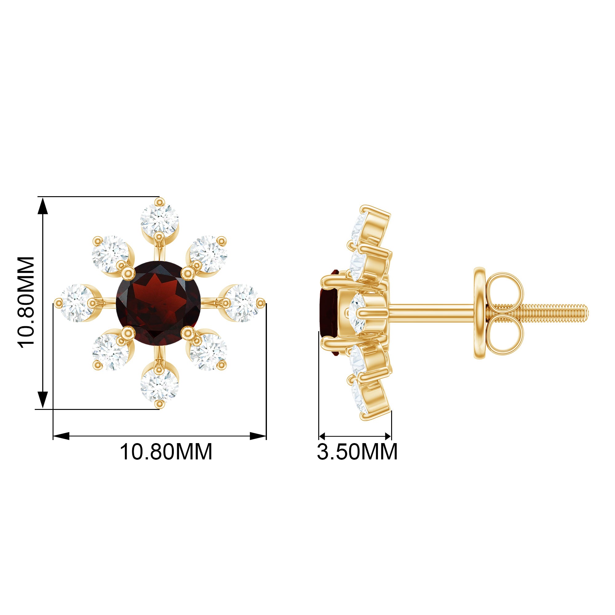 Inspired by the beauty of nature, the Garnet Stud Earrings capture the essence of elegance and timeless charm. Designed with intricate craftsmanship, the design features round cut garnet at its center, surrounded by dazzling diamond stones that form a radiant floral pattern. Crafted from high quality materials, these Flower Stud Earrings are made to endure while maintaining their refined beauty for years to come. The vivid hue of the AAA quality garnet symbolizes love, passion, and vitality, while the surrounding HI-SI quality diamonds add brilliance and light. The floral motif reflects nature’s grace and femininity, making the design both delicate and striking. The classic stud style ensures comfort and versatility, allowing these Garnet and Diamond Earrings to complement both casual and formal ensembles effortlessly. Secure screw back closures provide a snug and reliable fit, offering ease and confidence for daily wear or special occasions. Perfect as a thoughtful gift for someone who appreciates fine craftsmanship and unique design, the Garnet Floral Earrings add a touch of sophistication to any jewelry collection.