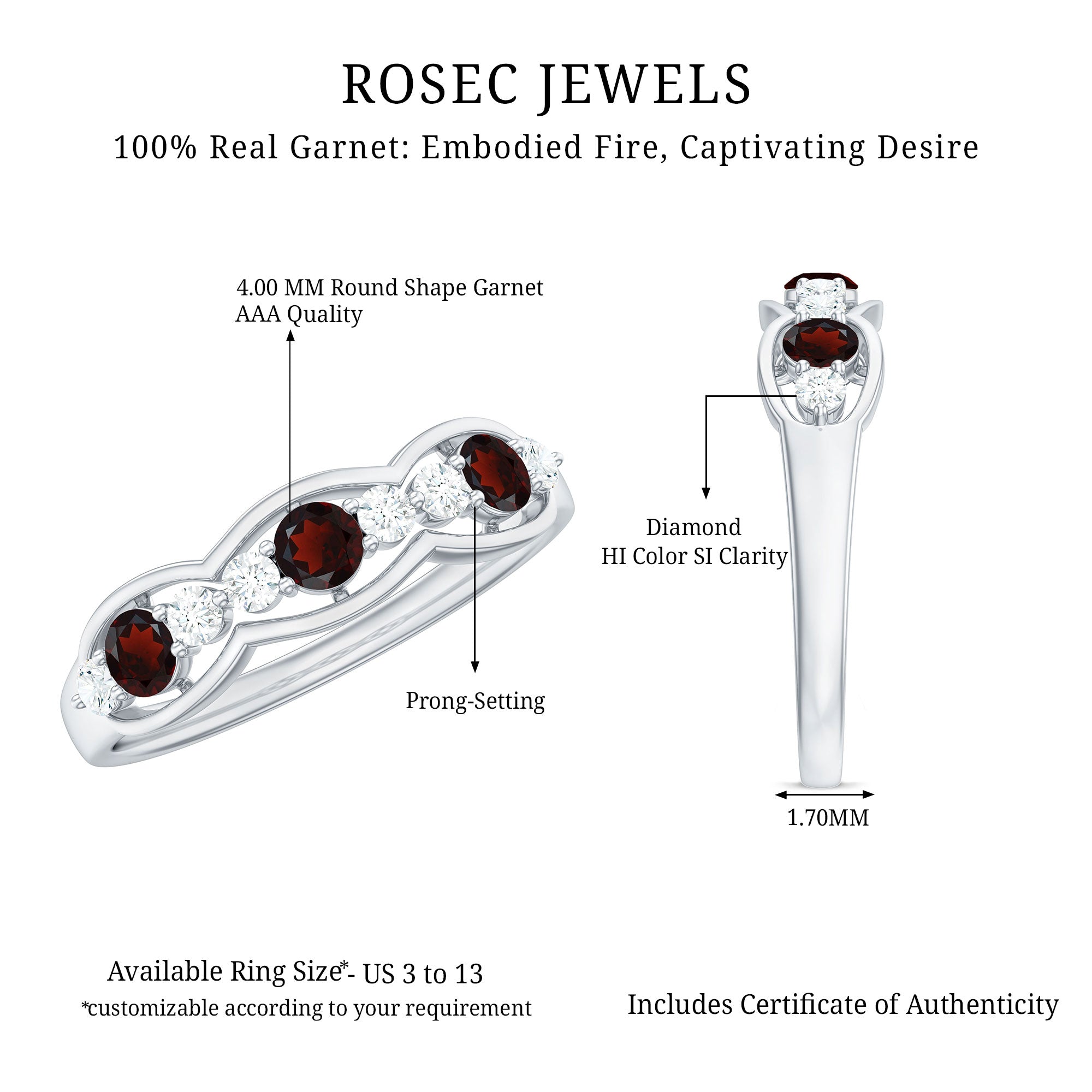 Complement your love story with a ring that radiates warmth, elegance and a touch of heartfelt magic. This Half Eternity Ring blends rich red hues with gentle sparkle, creating a piece that feels both romantic and timeless. The deep 4 mm Round Shape Garnet stones, symbols of passion, loyalty, and lasting devotion, are alternately placed with dazzling Diamond stones that enhance the graceful beauty of this Wedding Anniversary Ring. Every detail is crafted to offer comfort, style and a sense of connection. The half eternity design provides the right balance of color and shine, making this Garnet Diamond Ring perfect for everyday wear or for pairing with an engagement ring. The subtle sophistication makes this Red Garnet Ring an ideal choice for anniversaries, special milestones or simply as a reminder of the bond you cherish. Presented in a signature jewelry box and available in a range of sizes, this Garnet Eternity Ring arrives ready to become part of your most treasured moments.