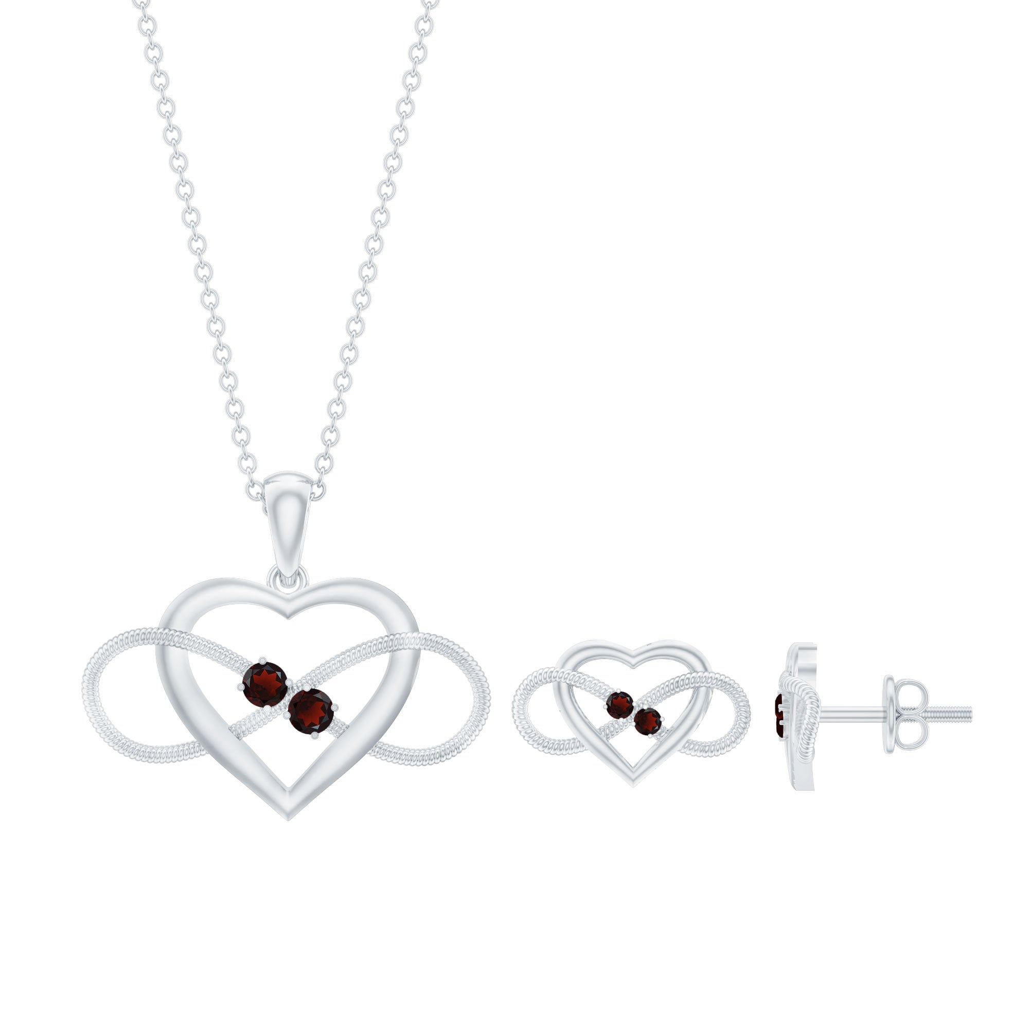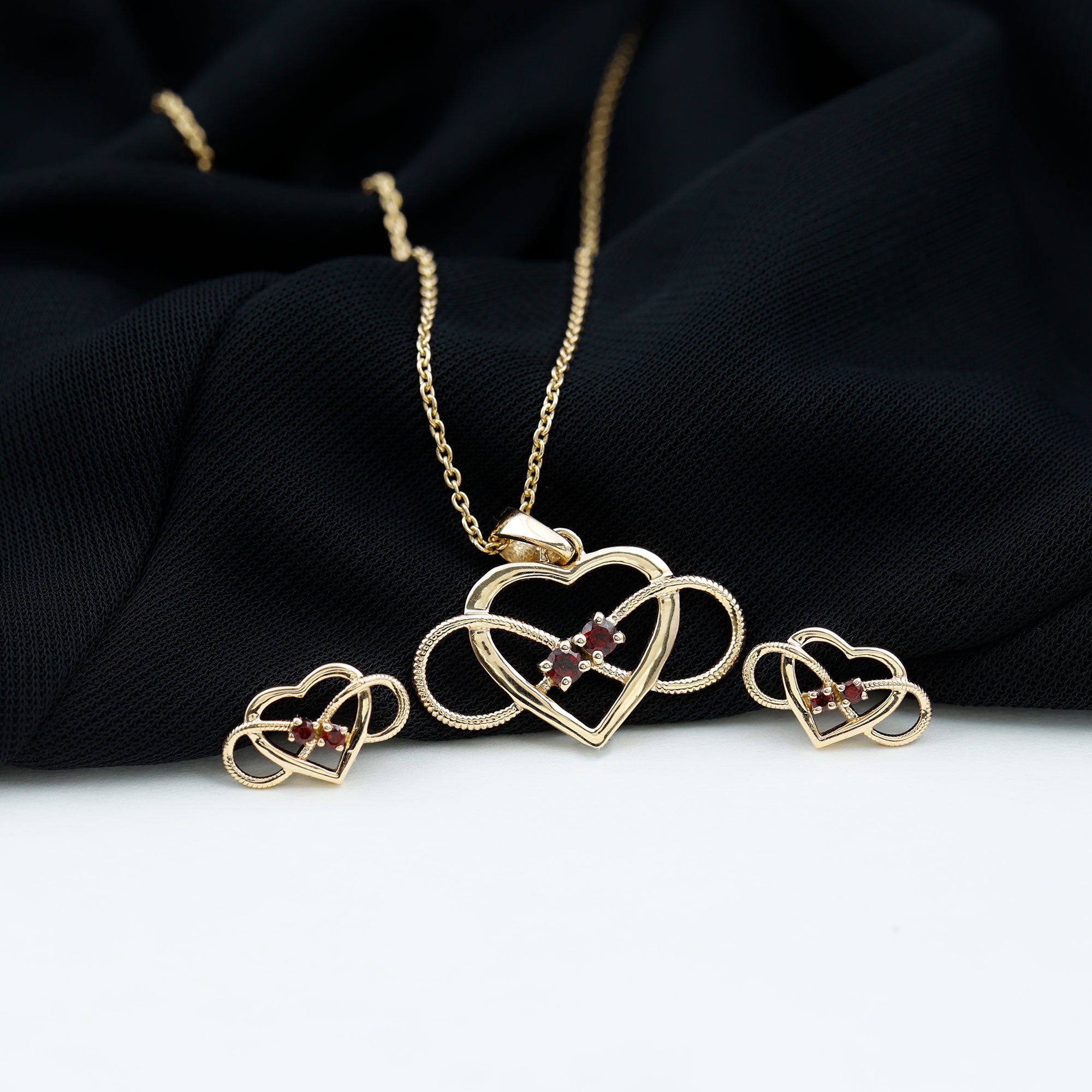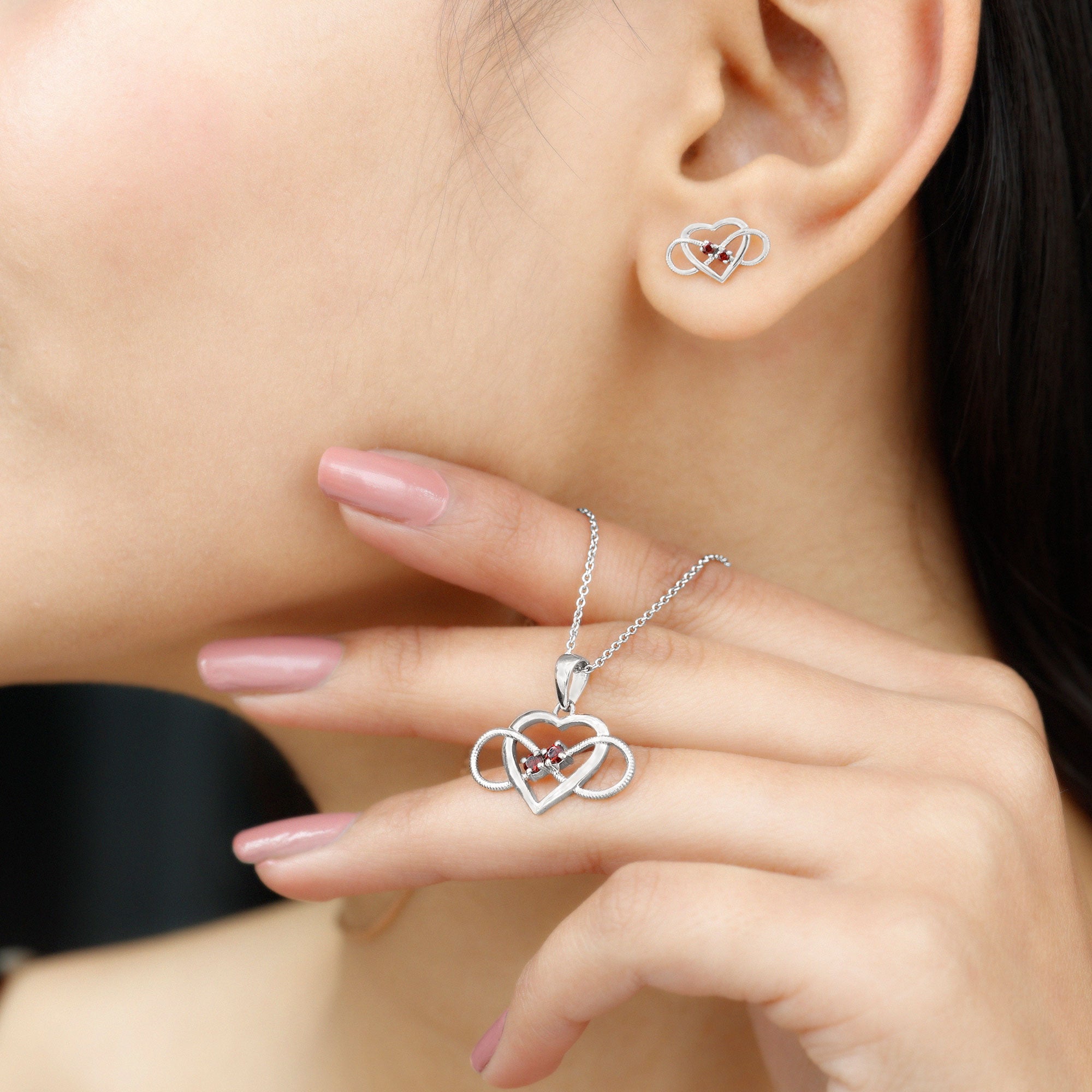 Express your boundless love with our Infinity Heart Jewelry Set, a perfect gift to show her your affection. The set features a Heart Infinity Pendant and matching Earrings adorned with a round-shaped Garnet in a secure prong setting. The twisted rope embellishments add a touch of elegance. This garnet jewelry set is a symbol of timeless beauty and everlasting love.