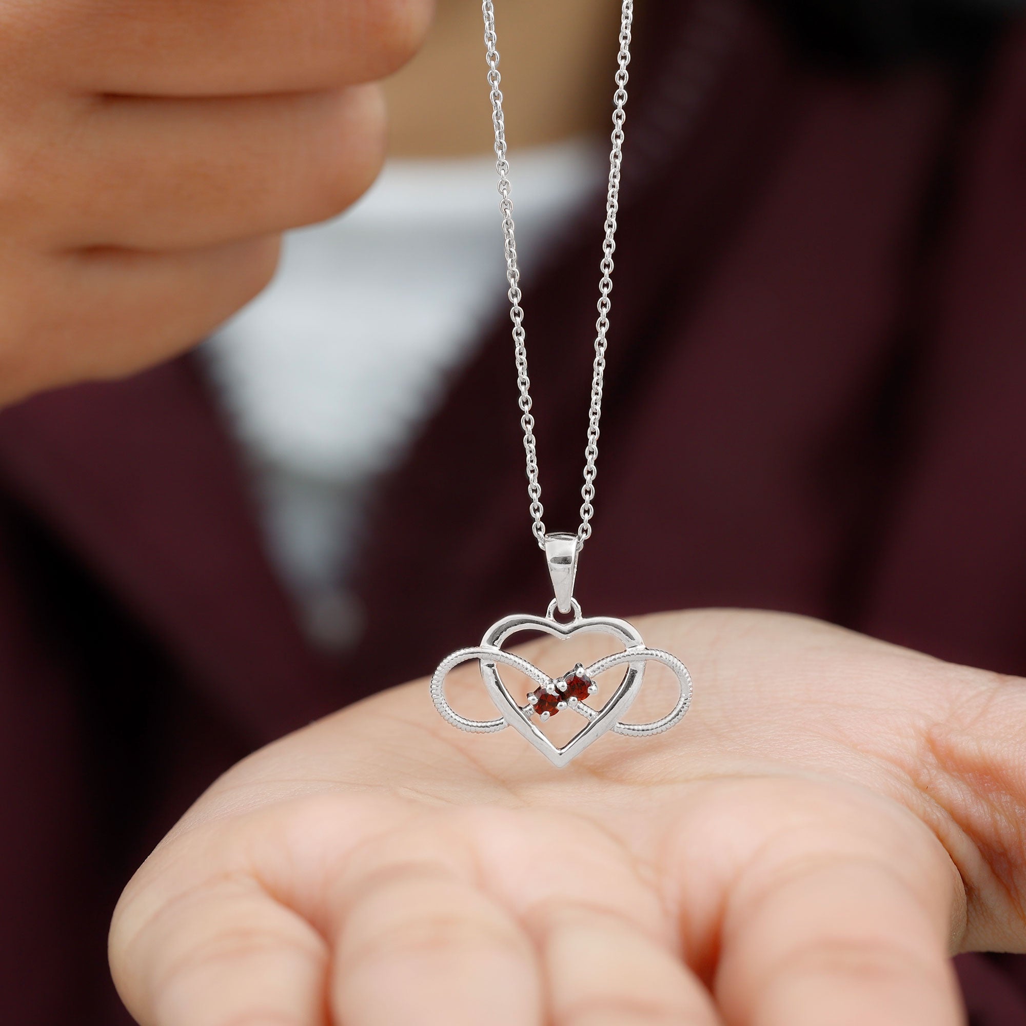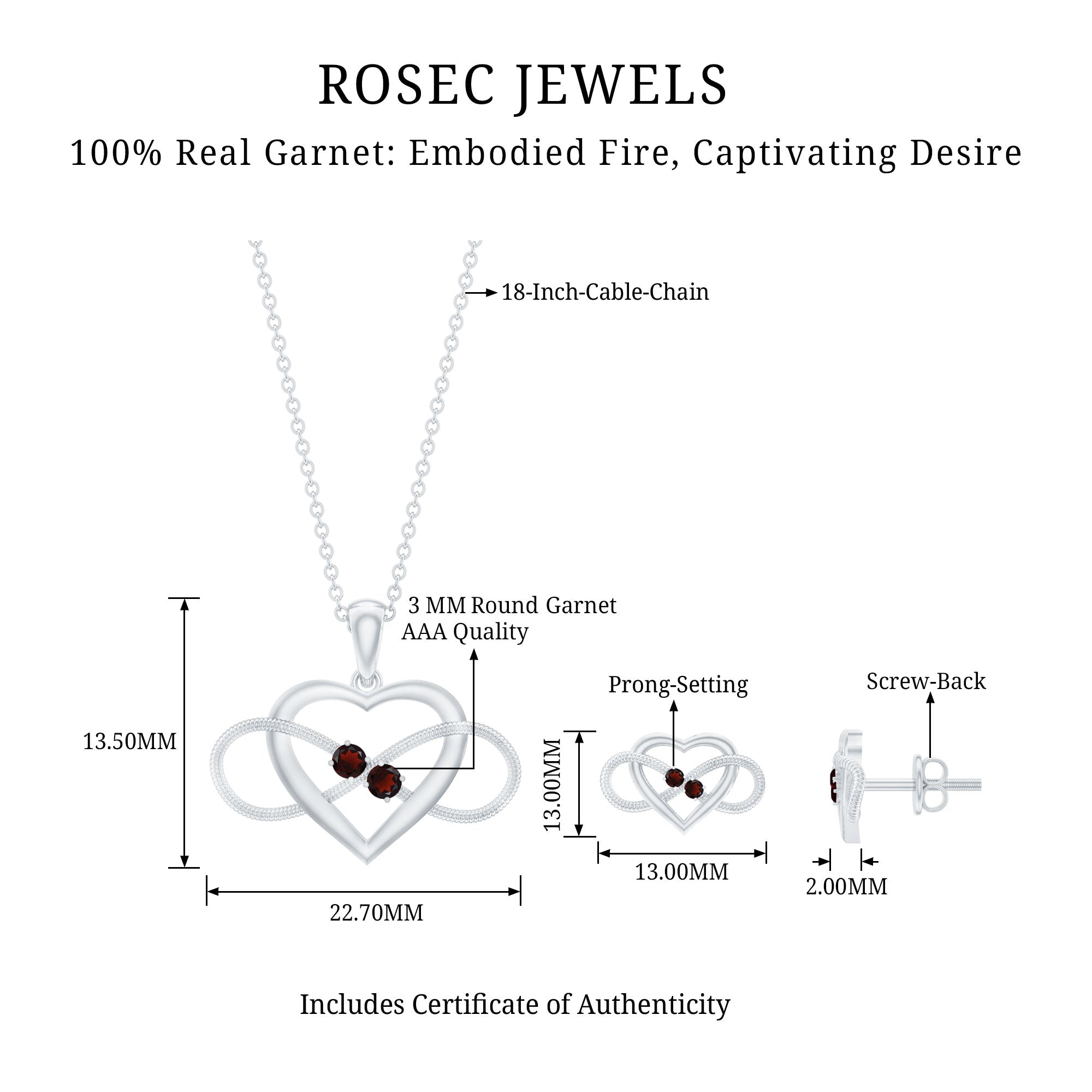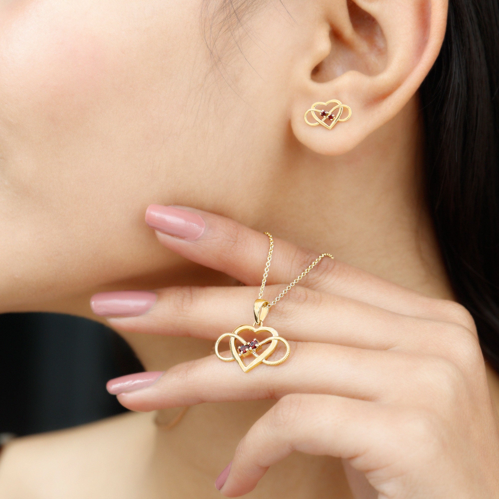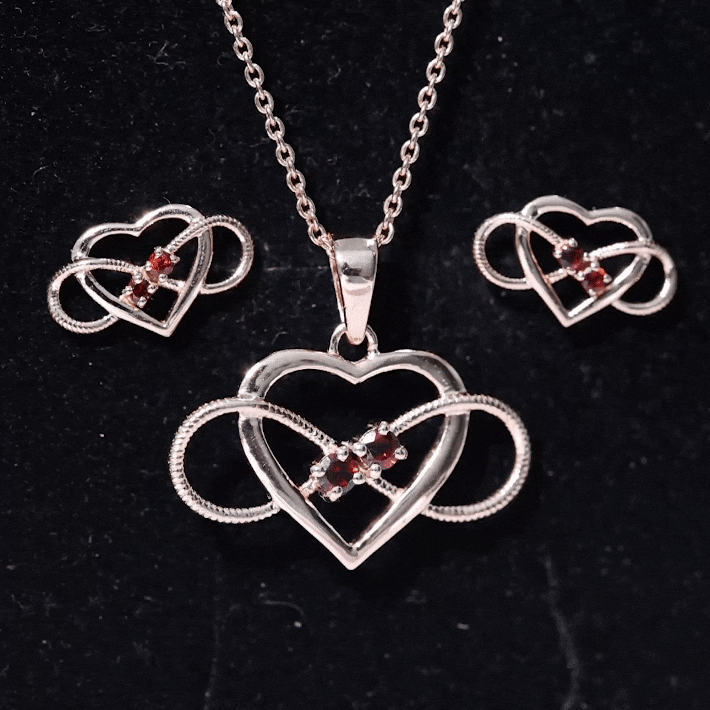 Express your boundless love with our Infinity Heart Jewelry Set, a perfect gift to show her your affection. The set features a Heart Infinity Pendant and matching Earrings adorned with a round-shaped Garnet in a secure prong setting. The twisted rope embellishments add a touch of elegance. This garnet jewelry set is a symbol of timeless beauty and everlasting love.