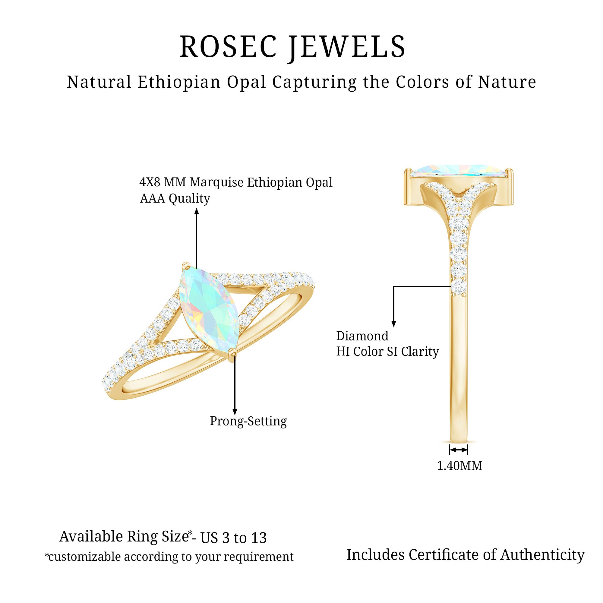 Effortlessly romantic, this Ethiopian Opal Engagement Ring is made for the one who lights up your world. At the center, a striking 4X8 mm Marquise Shape Ethiopian Opal set in 2 Prong Setting bursts with a spectrum of dreamy colors. The elongated shape flatters the finger while symbolizing forward motion in your journey together. Framing this captivating gem is a graceful Split Shank Band, adorned with sparkling Diamond stones that add brilliance and just the right amount of glamour. The split design adds a contemporary edge to this timeless Marquise Engagement Ring with Opal. Perfect for the bride-to-be who embraces elegance with a twist, this Split Shank Engagement Ring is a one-of-a-kind symbol of love. Available in a range of sizes and beautifully presented in a signature jewelry box, this Opal and Diamond Engagement Ring is ready to make your proposal unforgettable. Whether you are drawn to its vibrant colors or its meaningful design, this Real Opal Engagement Ring is a stunning tribute to a love story that is uniquely yours and destined to shine for a lifetime.