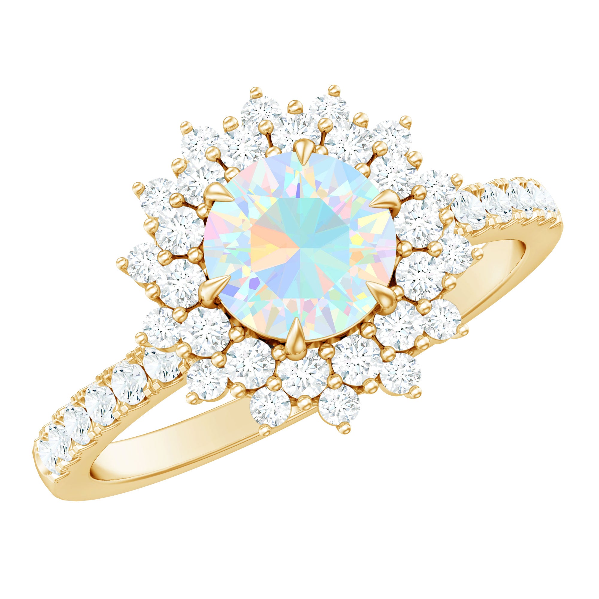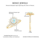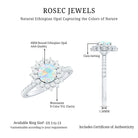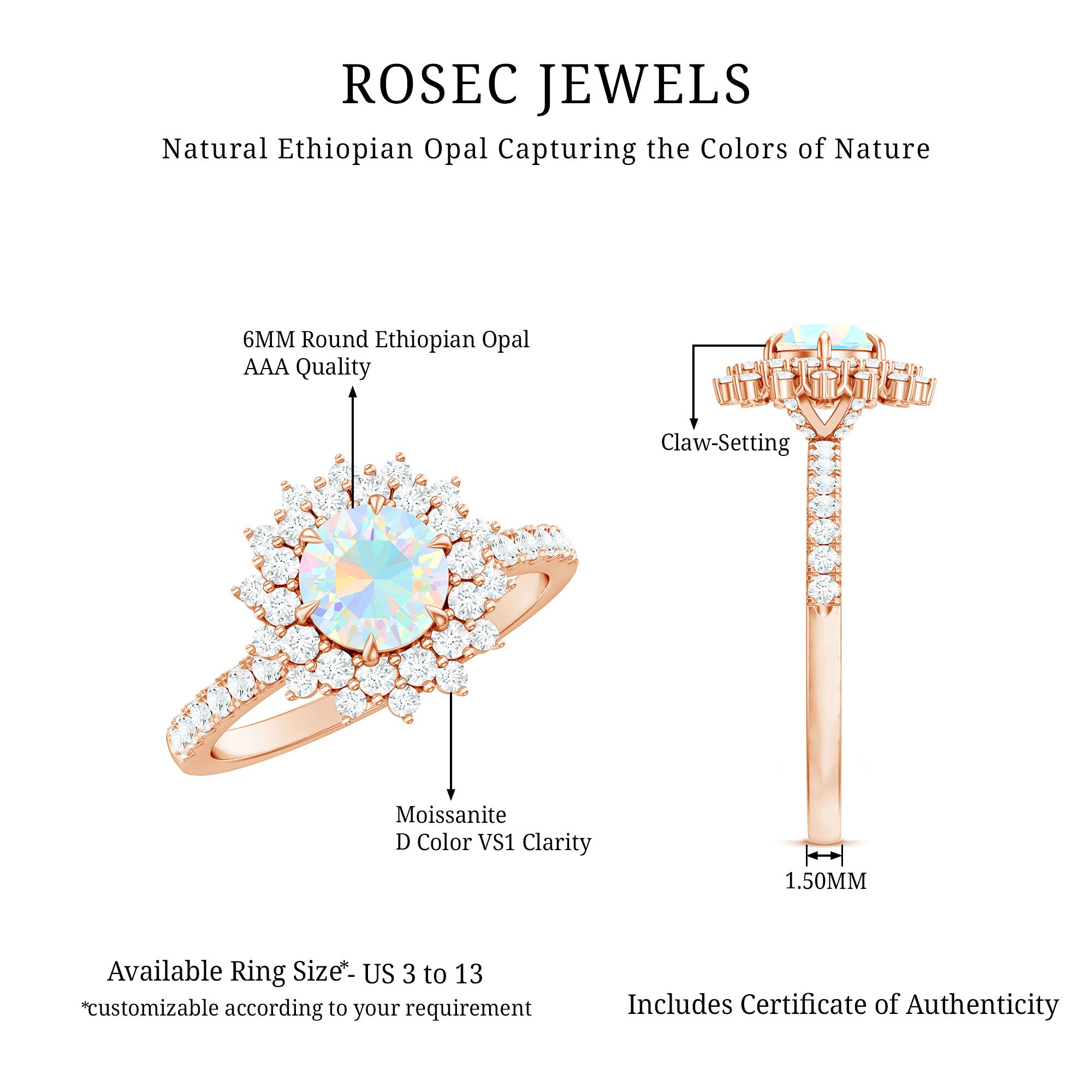 This Ethiopian Opal Engagement Ring is designed to captivate the heart and soul. At its center is a 6 mm Round Shape Ethiopian Opal set in 6 Claw Prong Setting, each turn of the stone is a new moment of magic. Surrounding it, a Double Halo of dazzling Moissanite stones creates an ethereal frame, bringing out the brilliance of Opal and offering an extra layer of sparkle that catches the light from every angle. The Moissanite Side Stones set along the band add subtle elegance, enhancing the mesmerizing play of color of Opal. This Double Halo Engagement Ring is a celebration of love that transcends time, with a design as unique and enduring as the bond you share. Available in various sizes and beautifully presented in a signature jewelry box, this Statement Engagement Ring is the perfect symbol of your eternal commitment. Whether you are proposing or marking a cherished milestone, this stunning Opal Round Engagement Ring promises to capture the heart and light up your forever with its unforgettable beauty.
