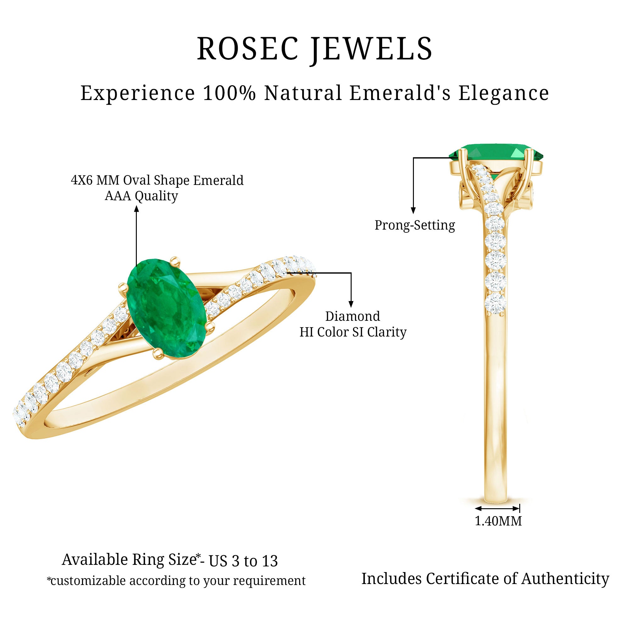 Commemorate a love that is both vibrant and enduring with this exquisite Emerald Promise Ring. This Commitment Ring for her features a 4X6 mm Oval Shape Emerald set in Prong Setting, symbolizing hope, renewal and the promise of forever. Surrounding it, a Diamond studded Split Shank adds a modern twist, weaving delicate sparkle into the design and framing the center stone with elegance and grace. Every curve has been thoughtfully crafted to tell a story of devotion and heartfelt connection, making this Oval Emerald Ring a testament to enduring love and meaningful promises. Available in a range of sizes for the perfect fit, this Emerald Diamond Ring arrives in a beautifully designed jewelry box, ready to create unforgettable moments. Let this Emerald Proposal Ring be a luminous symbol of your bond, a daily reminder of passion, loyalty and the journey you are embarking on together. A piece that tells a love story destined to be treasured for a lifetime.