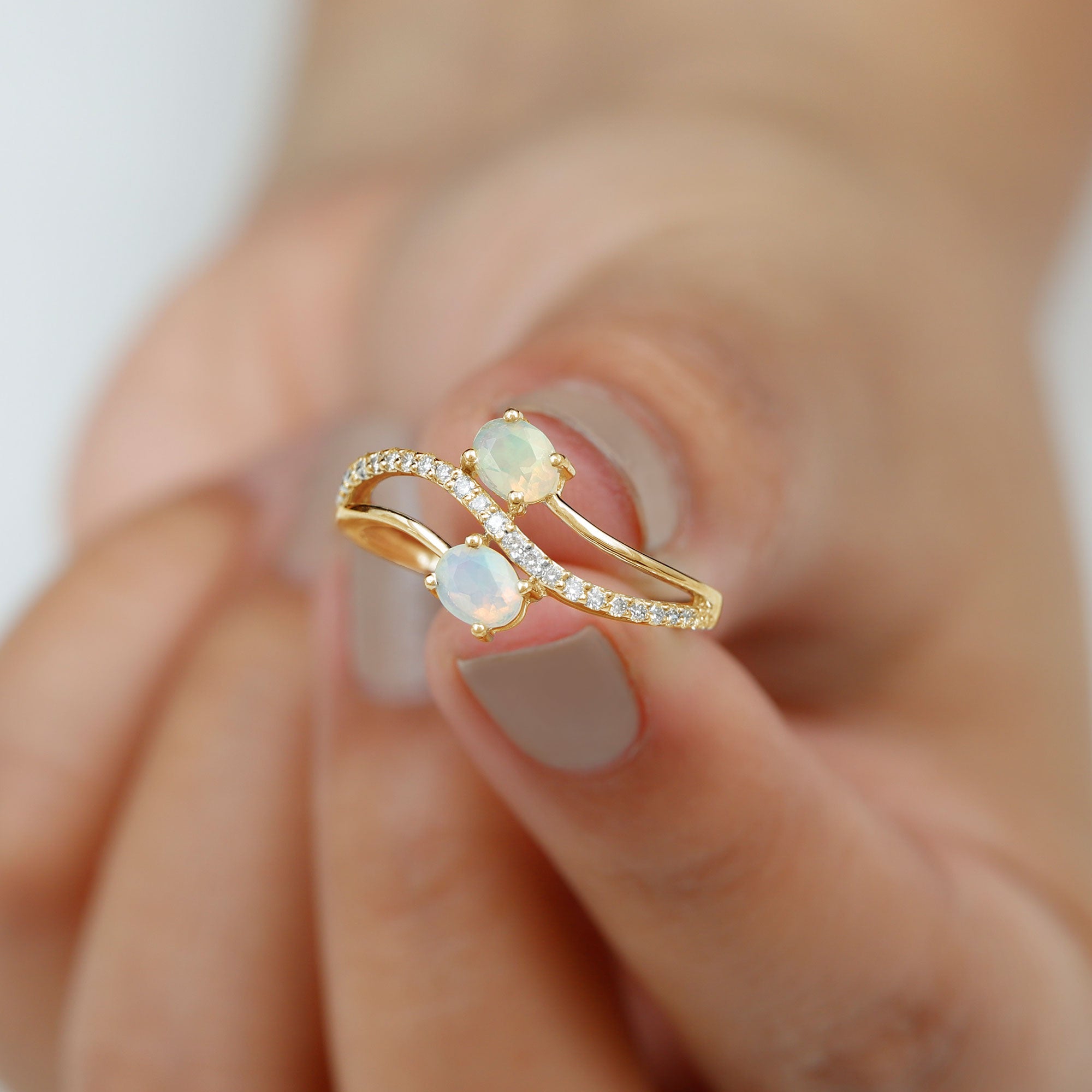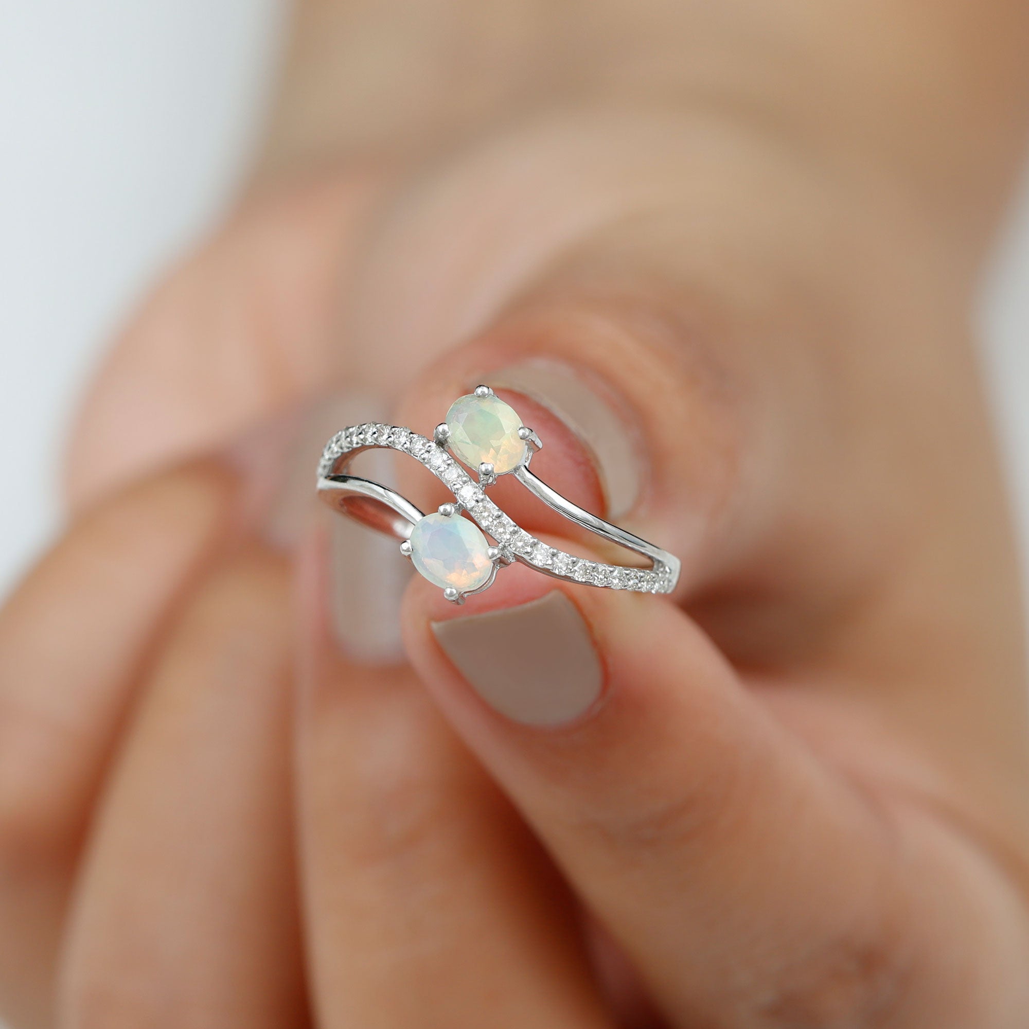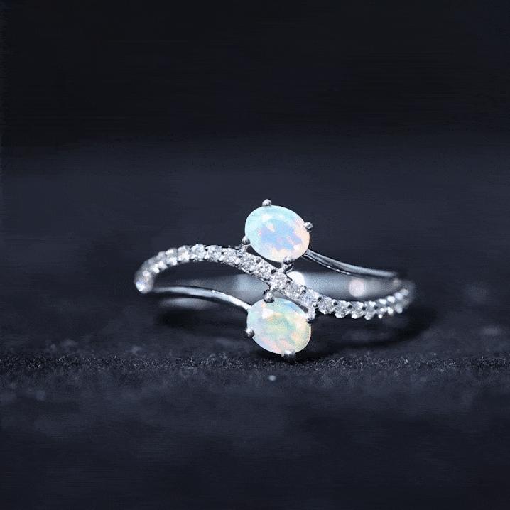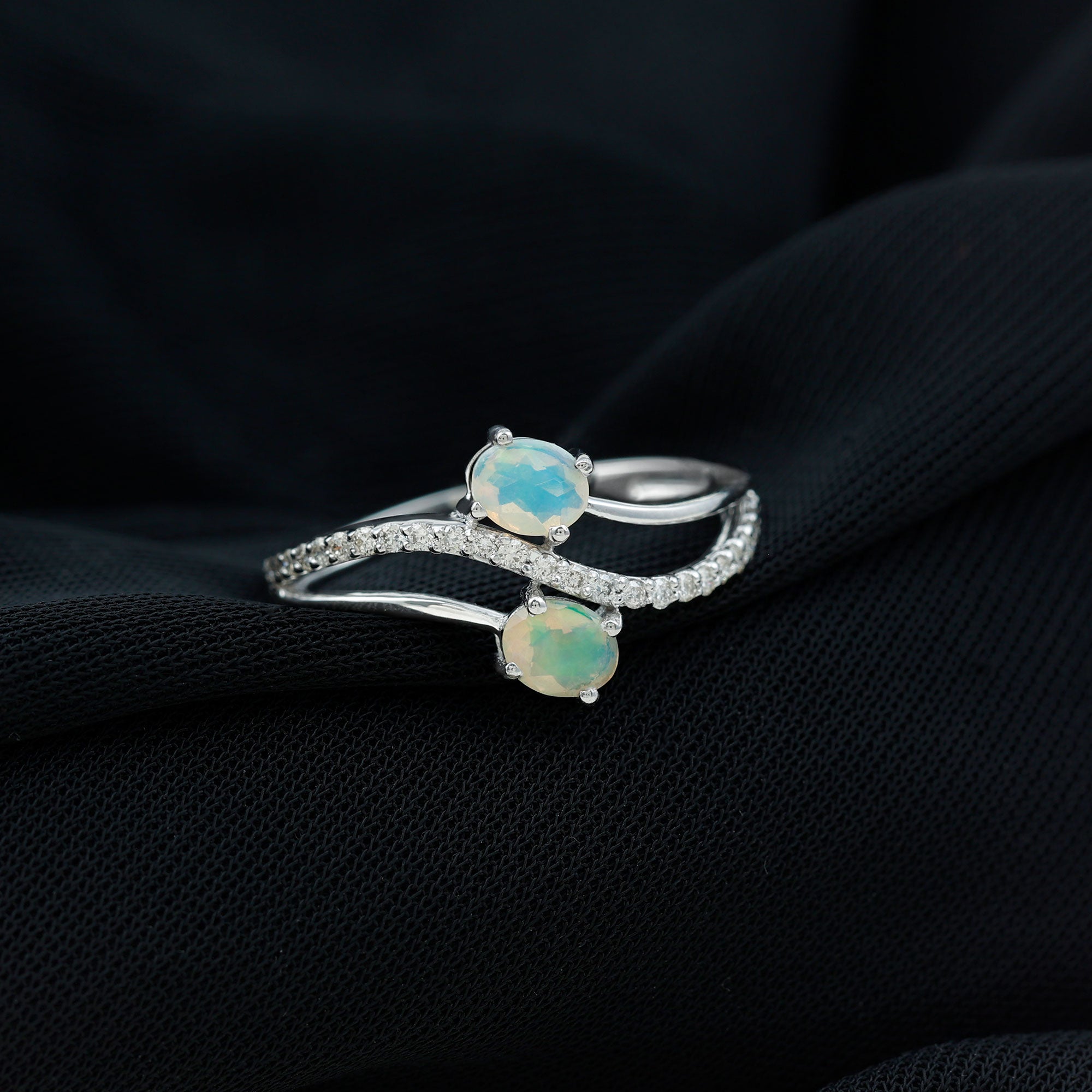 Romance meets modern elegance in this Toi Et Moi Engagement Ring, a stunning symbol of two souls intertwined. Featuring two 5X7 mm Oval Shape Ethiopian Opal in the iconic you and me design, this 2 Stone Engagement Ring captures the essence of love. Placed on a Diamond studded Bypass Shank, the two stones gracefully curve toward each other, representing unity, balance and forever connection. This Opal Diamond Engagement Ring is a fresh twist on a classic design, perfect for the bride who values both symbolism and standout style. Whether you are planning the perfect proposal or celebrating a once-in-a-lifetime love, this Oval Engagement Ring delivers just the right amount of sparkle. Packaged in a ready-to-gift jewelry box and available in a wide range of sizes, this Bypass Ring is designed to fit like fate. Elegant, unique and full of meaning, this Moi Et Toi Ring is a love story wrapped in light, ready to begin a beautiful forever.