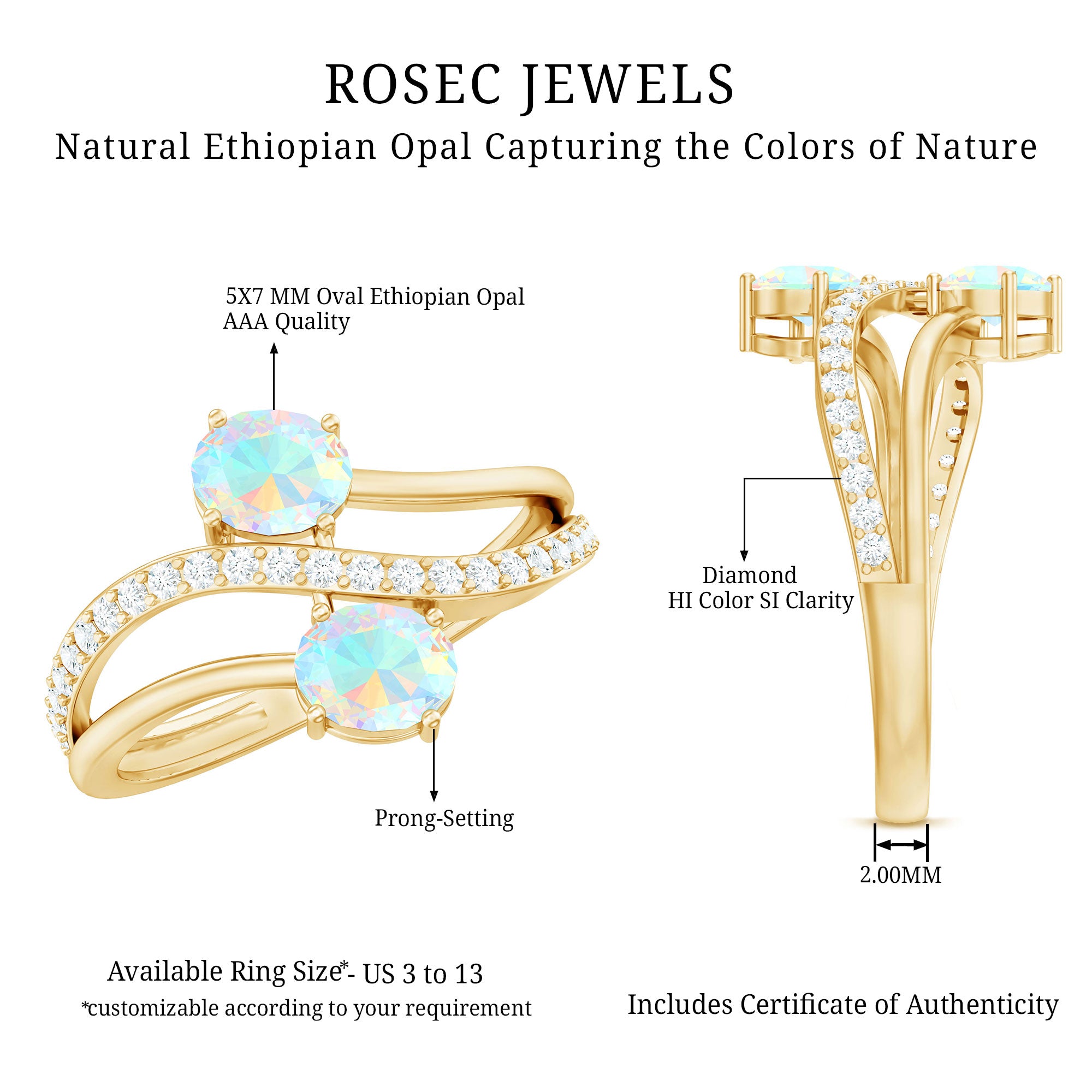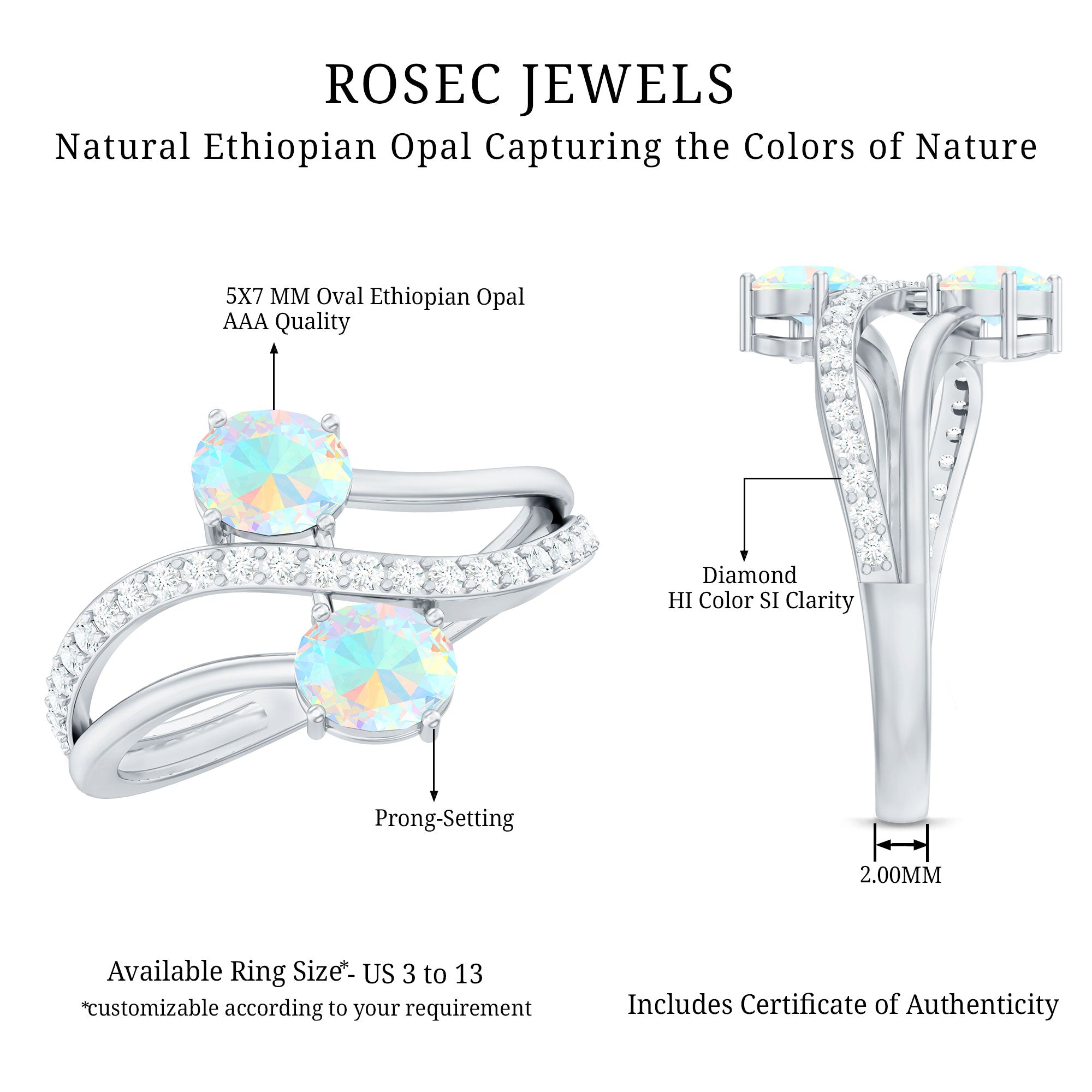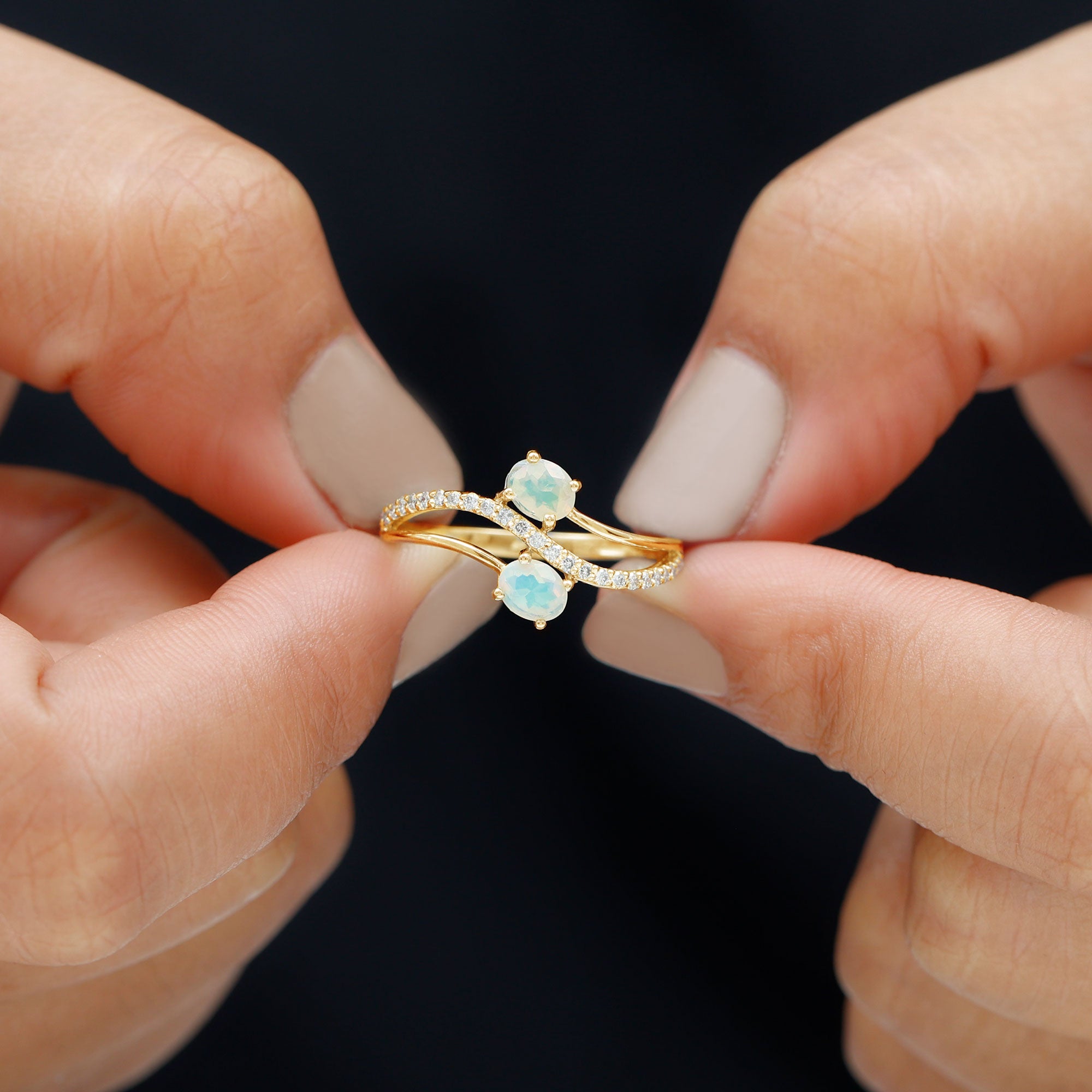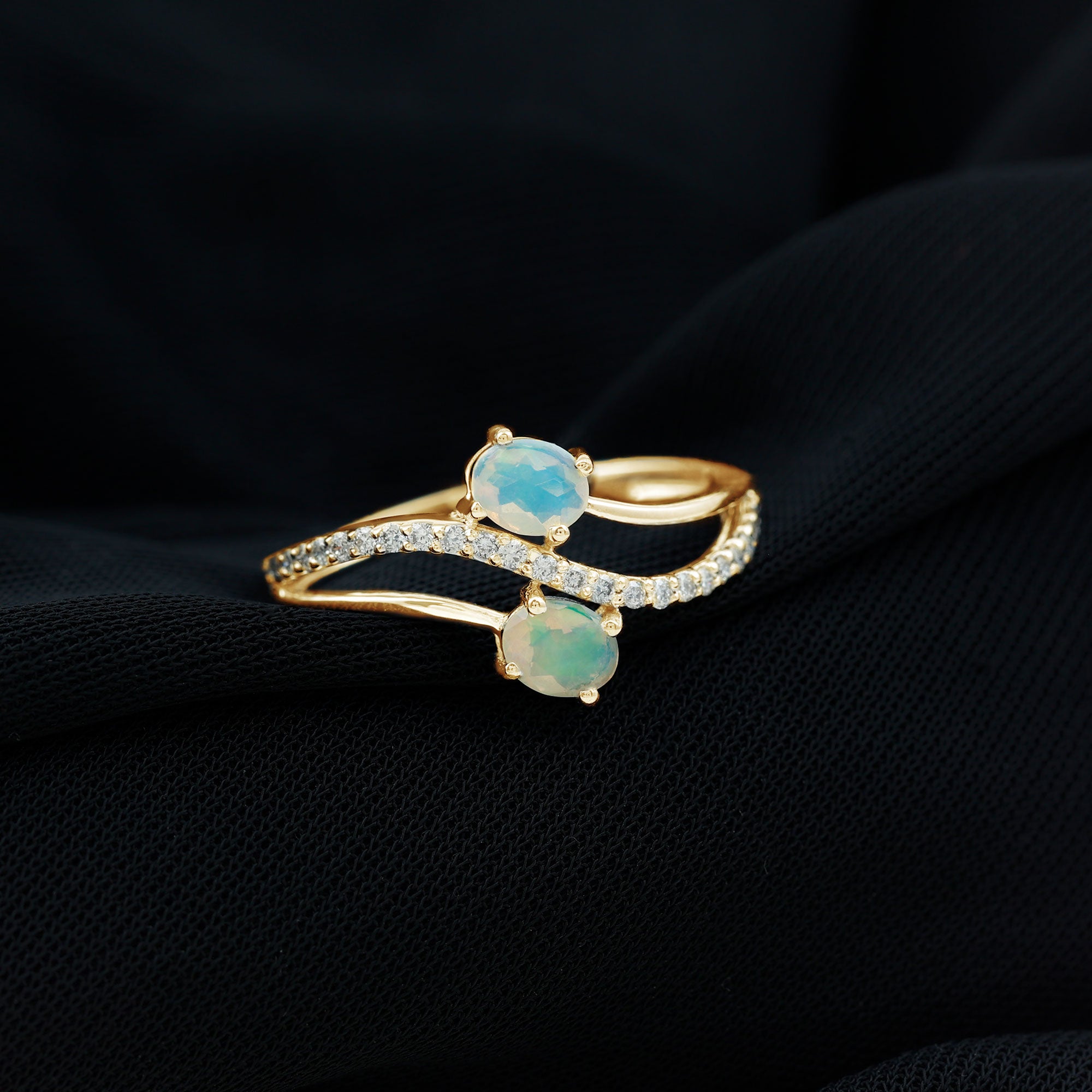 Romance meets modern elegance in this Toi Et Moi Engagement Ring, a stunning symbol of two souls intertwined. Featuring two 5X7 mm Oval Shape Ethiopian Opal in the iconic you and me design, this 2 Stone Engagement Ring captures the essence of love. Placed on a Diamond studded Bypass Shank, the two stones gracefully curve toward each other, representing unity, balance and forever connection. This Opal Diamond Engagement Ring is a fresh twist on a classic design, perfect for the bride who values both symbolism and standout style. Whether you are planning the perfect proposal or celebrating a once-in-a-lifetime love, this Oval Engagement Ring delivers just the right amount of sparkle. Packaged in a ready-to-gift jewelry box and available in a wide range of sizes, this Bypass Ring is designed to fit like fate. Elegant, unique and full of meaning, this Moi Et Toi Ring is a love story wrapped in light, ready to begin a beautiful forever.