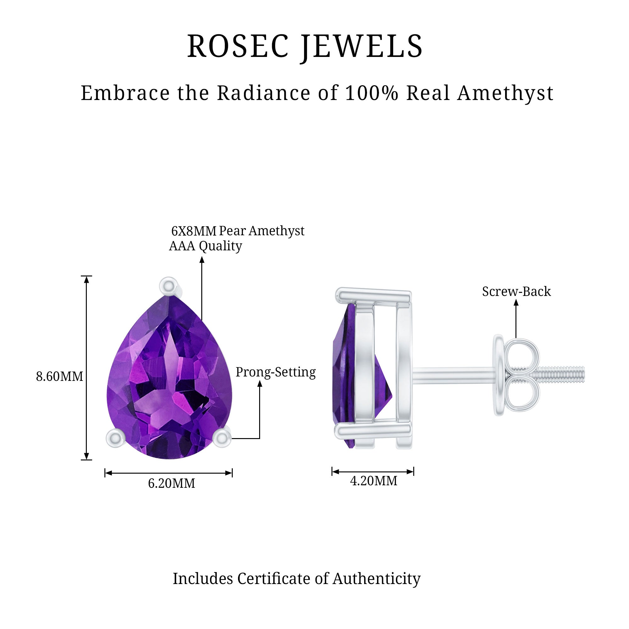 Embrace the enchanting allure of these Solitaire Stud Earrings, a delicate celebration of elegance, color and personal meaning. Each earring features a 6X8 mm Amethyst set in 3 Prong Setting, radiating a rich purple hue that symbolizes passion, creativity and serenity, the perfect gem for those born in February or anyone who cherishes the mystique of Amethyst. The classic Teardrop Shape adds a graceful, feminine silhouette, while the secure Screw Back Closure ensures they stay comfortably in place, making them ideal for everyday wear or special occasions. These Amethyst Stud Earrings effortlessly blend sophistication with a touch of whimsy, capturing light and attention from every angle, while offering a subtle statement of timeless beauty. Presented in a signature jewelry box, they are ready to gift for birthdays, anniversaries or as a heartfelt gesture of love. Whether paired with casual attire or evening elegance, these Amethyst Studs add a pop of color and sparkle that enhances every look.