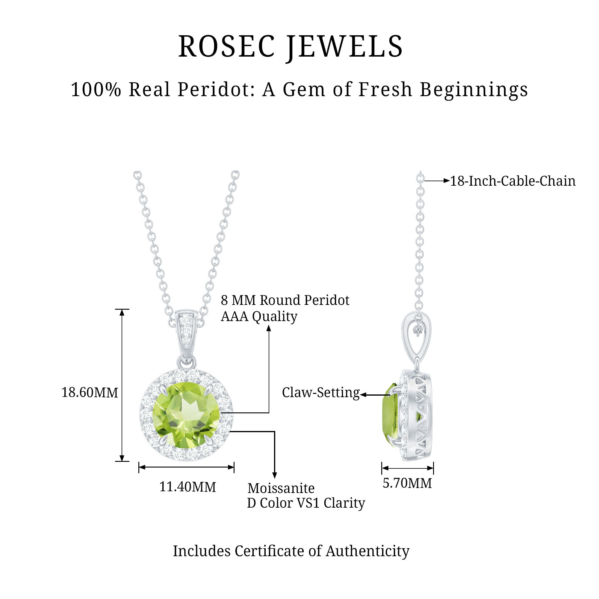 Make her achieve an elegant look with this Peridot Necklace Pendant. Embellished with an 8 MM round shaped peridot which is held in claw setting and wrapped in a halo frame of moissanite stones. Secure with a moissanite encrusted bail that exudes an unmatchable brilliance. Crafted by experts in 14k white gold plated silver, this Round Pendant Necklace adds a touch of elegance and sophistication to your evening attire. Get this versatile piece of jewelry that fits every occasion with ease.