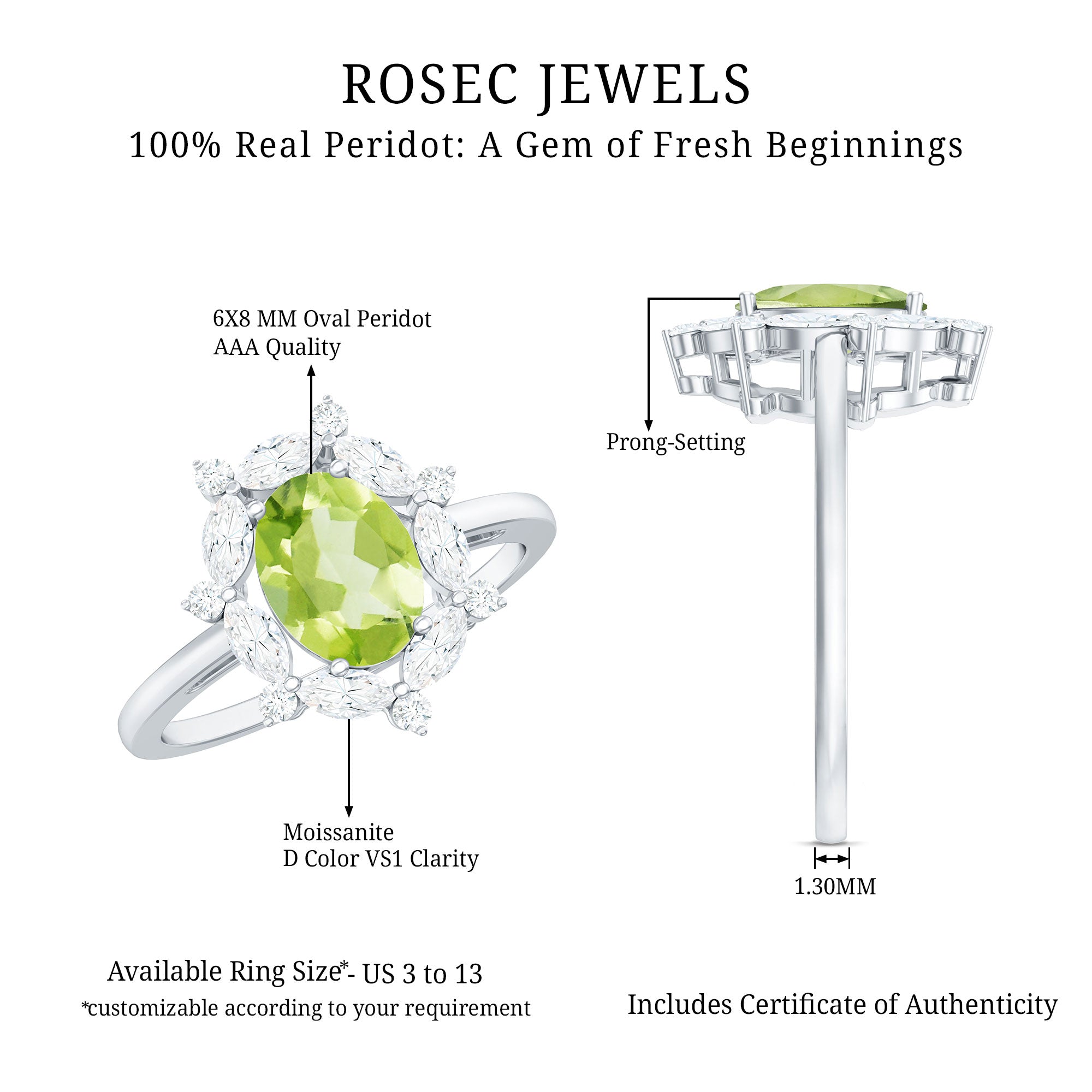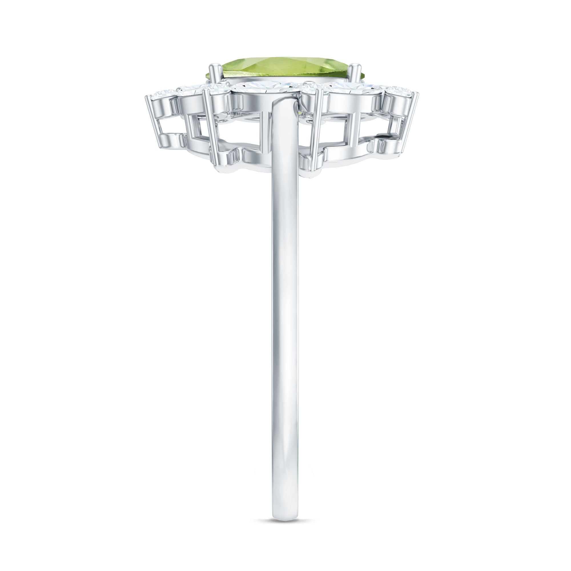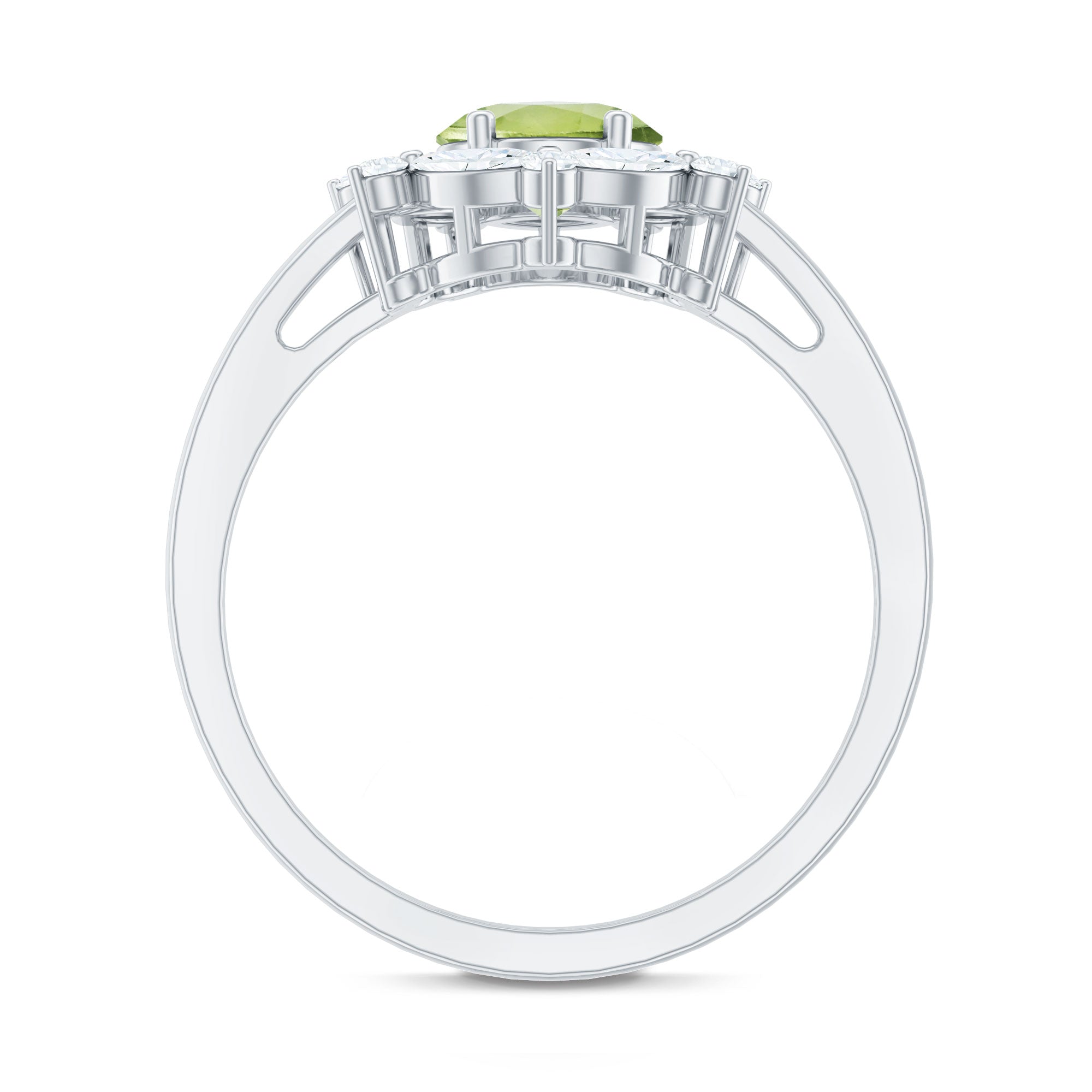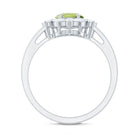 Captivating elegance meets divine allure in this Peridot Engagement Ring encircled with a mesmerizing Moissanite Halo, a dream come true.