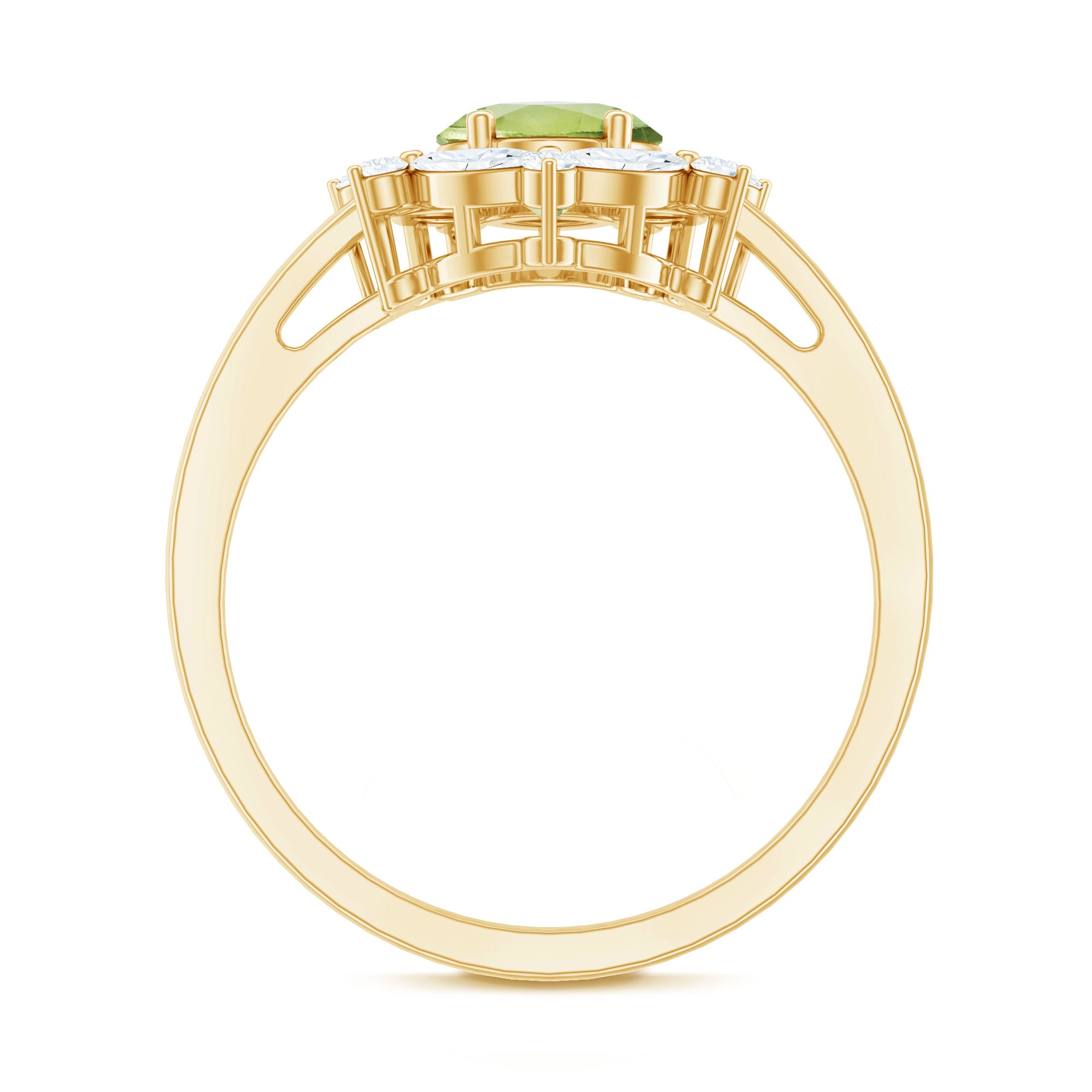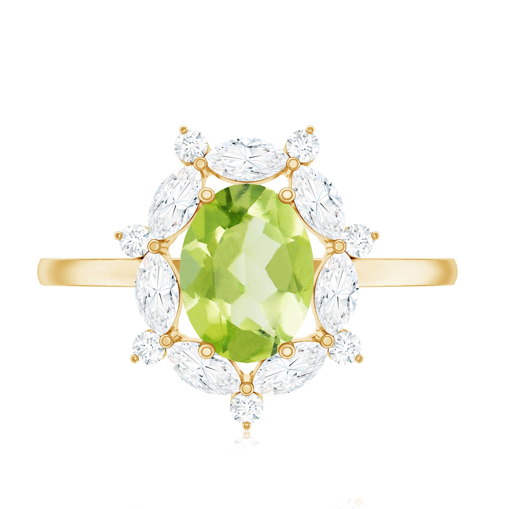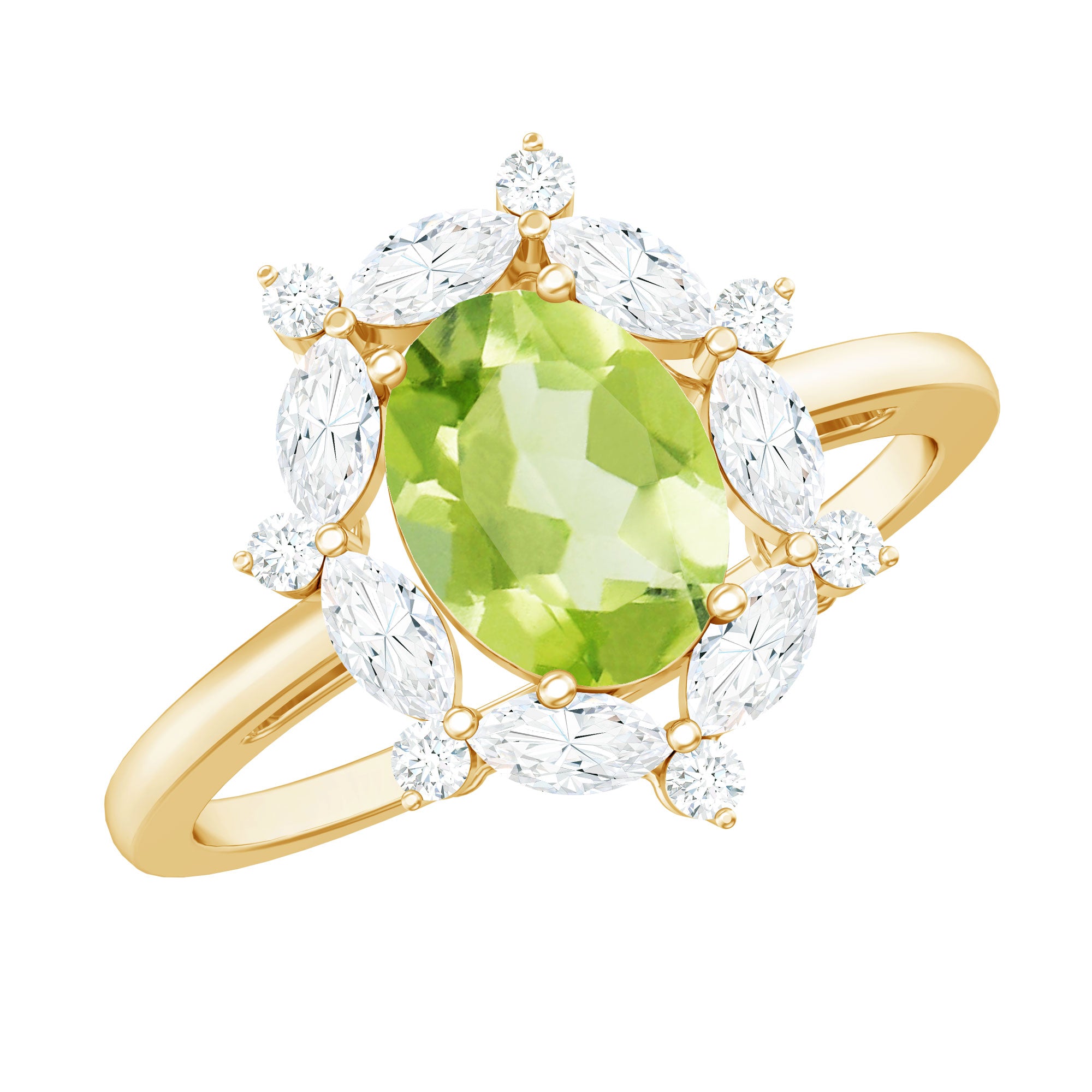Captivating elegance meets divine allure in this Peridot Engagement Ring encircled with a mesmerizing Moissanite Halo, a dream come true.