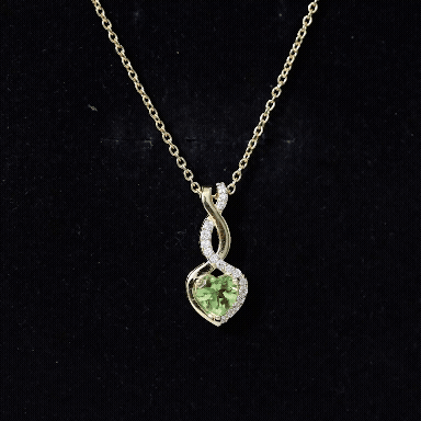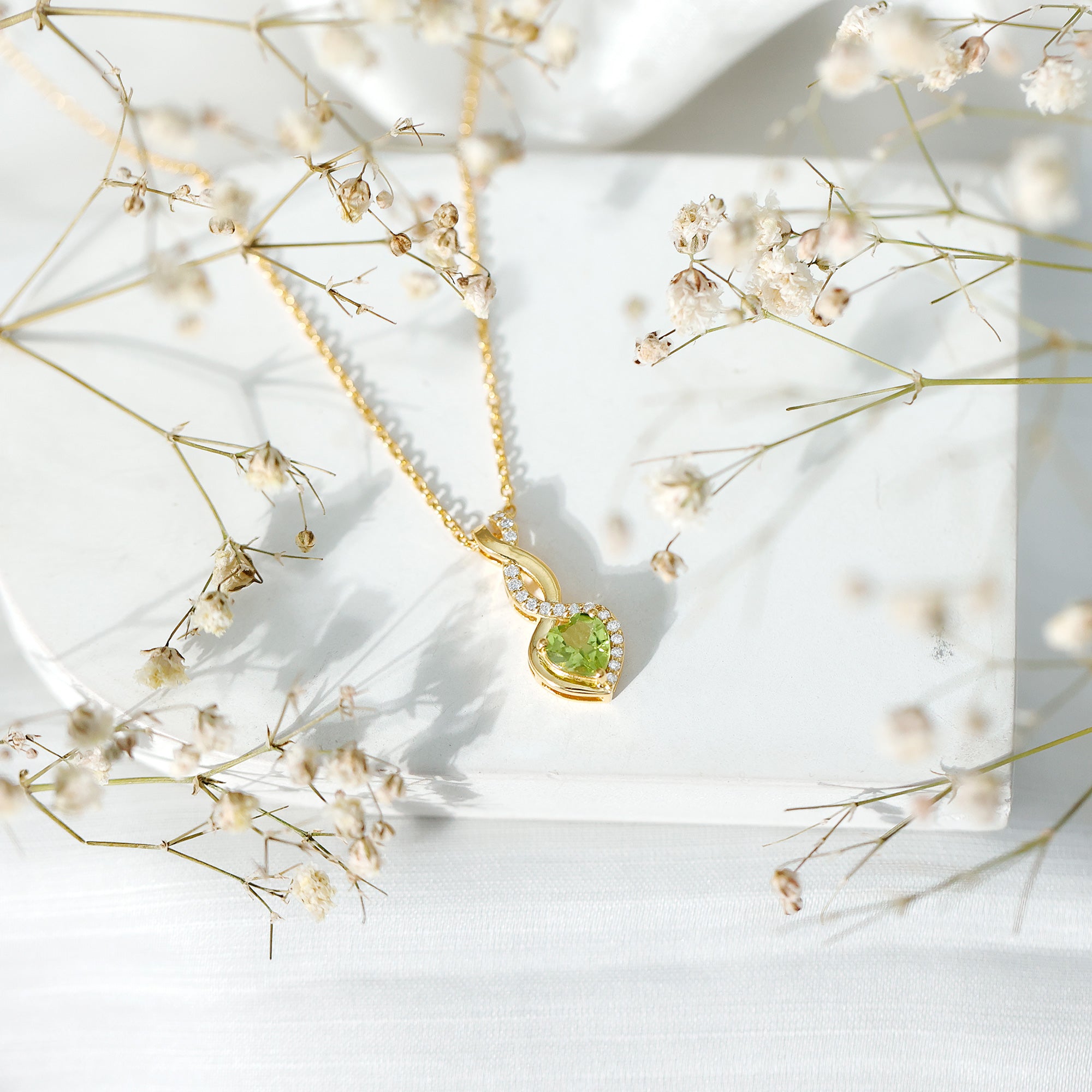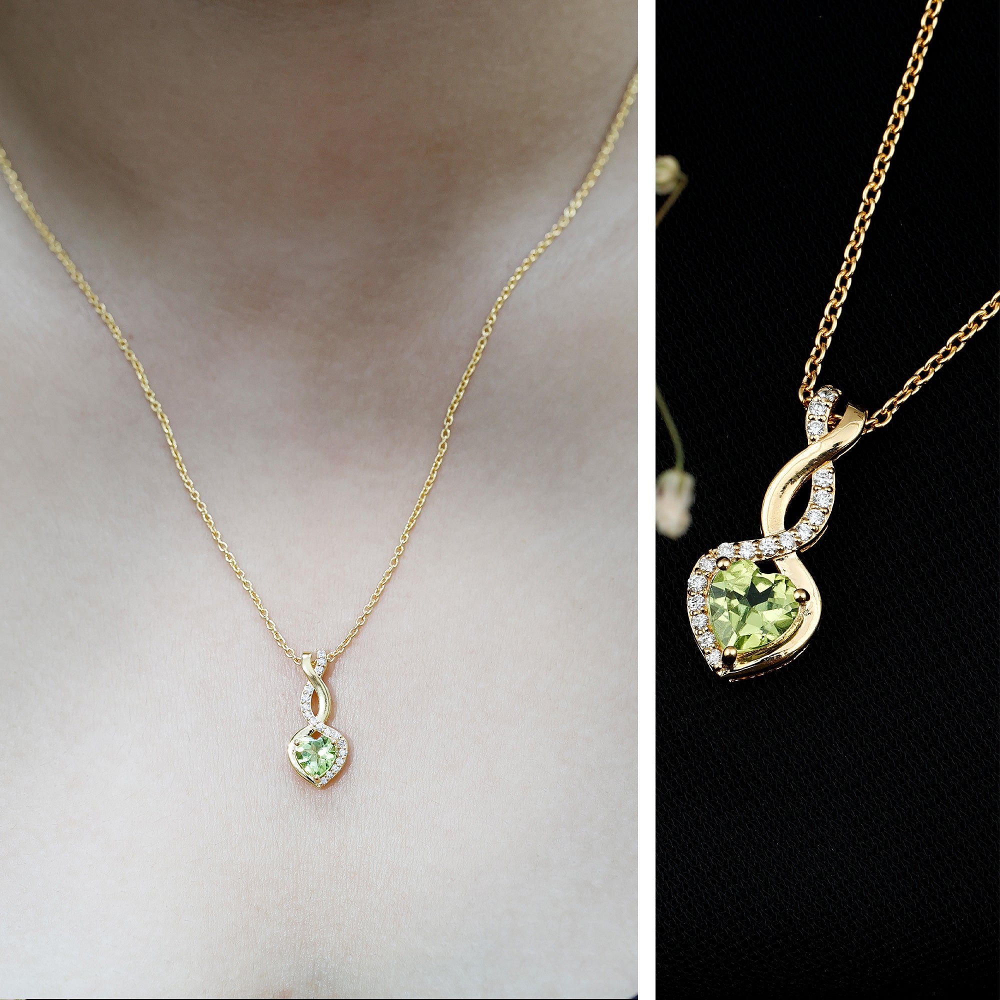 A symbol of love wrapped in forever, this Heart and Infinity Necklace is a beautiful way to express emotions that go beyond words. Handcrafted in 14k yellow gold plated silver, this Dangle Pendant is designed to celebrate meaningful moments and timeless connections. At the center of the pendant sits a 6 MM heart shaped Peridot, delicately set in prongs. The heart is enclosed within a graceful infinity symbol, adding a deeper meaning to the design. Together, the heart and infinity shape represent an everlasting bond, making this Peridot Heart Necklace a heartfelt gift for someone truly special. To add a hint of sparkle, the Peridot Pendant is accented with shimmering round lab grown diamonds. These ethical stones bring brilliance to the piece, while staying kind to the environment. The pendant gently dangles from a matching chain, allowing it to sit perfectly on your neckline, making it ideal for everyday wear or special occasions. Whether it is a birthday, anniversary, or a surprise, this Peridot and Diamond Necklace is a thoughtful reminder of love, memories, and unbreakable ties. The Heart Pendant Necklace comes with a gemstone certificate and arrives in a signature jewelry box, making it ready for gifting or keeping close as a personal keepsake. Simple, sweet, and full of love, this Infinity Heart Necklace is a beautiful way to carry a special bond wherever you go.