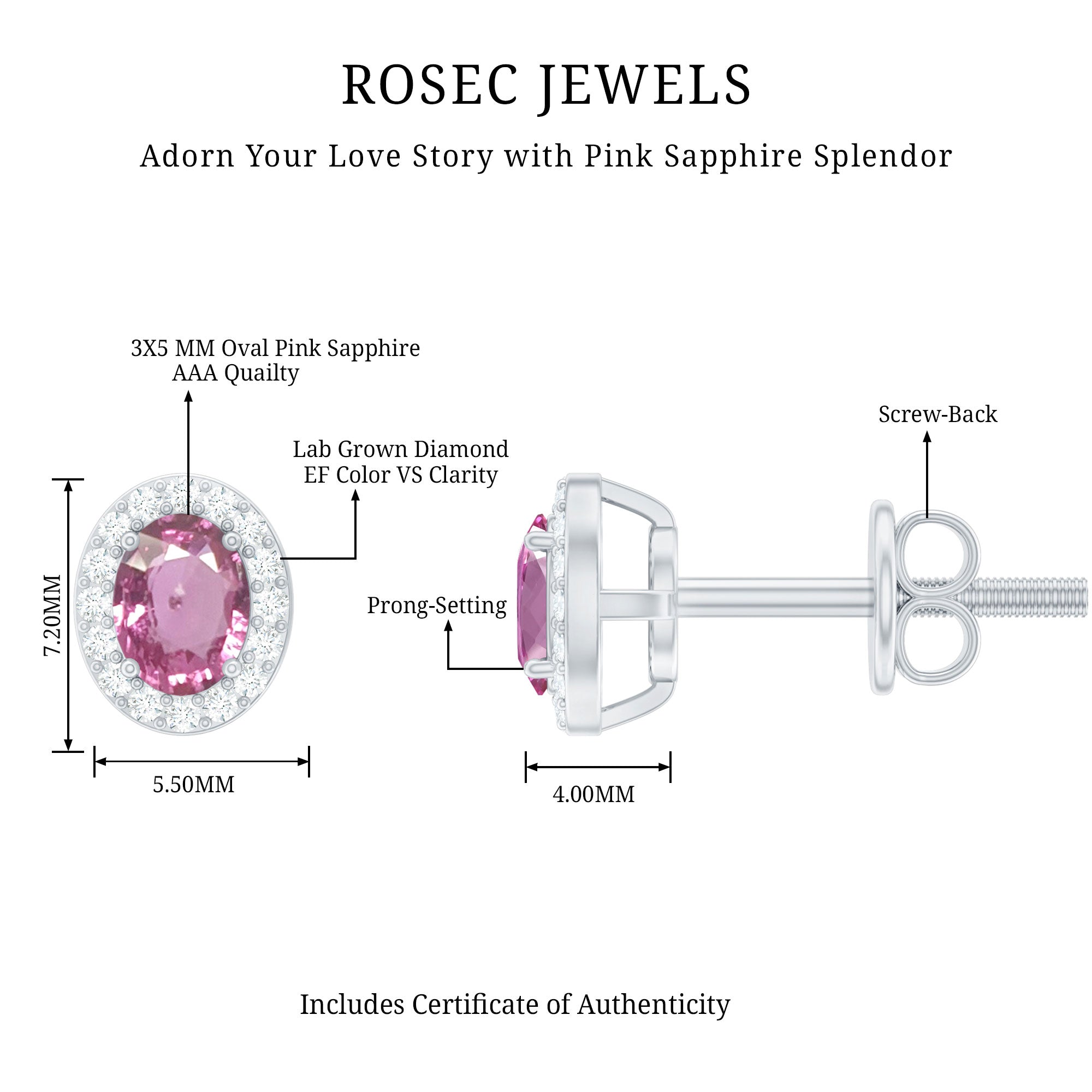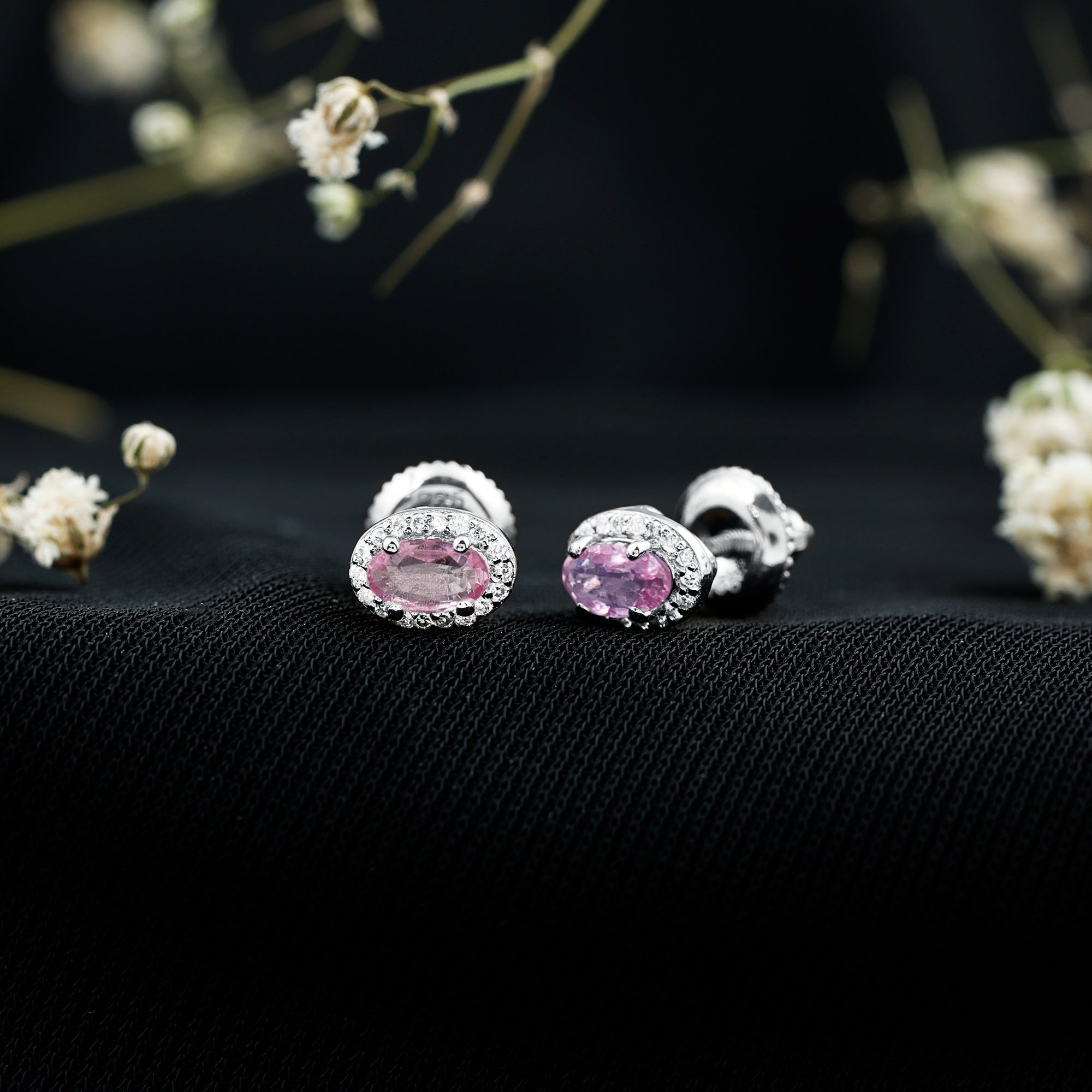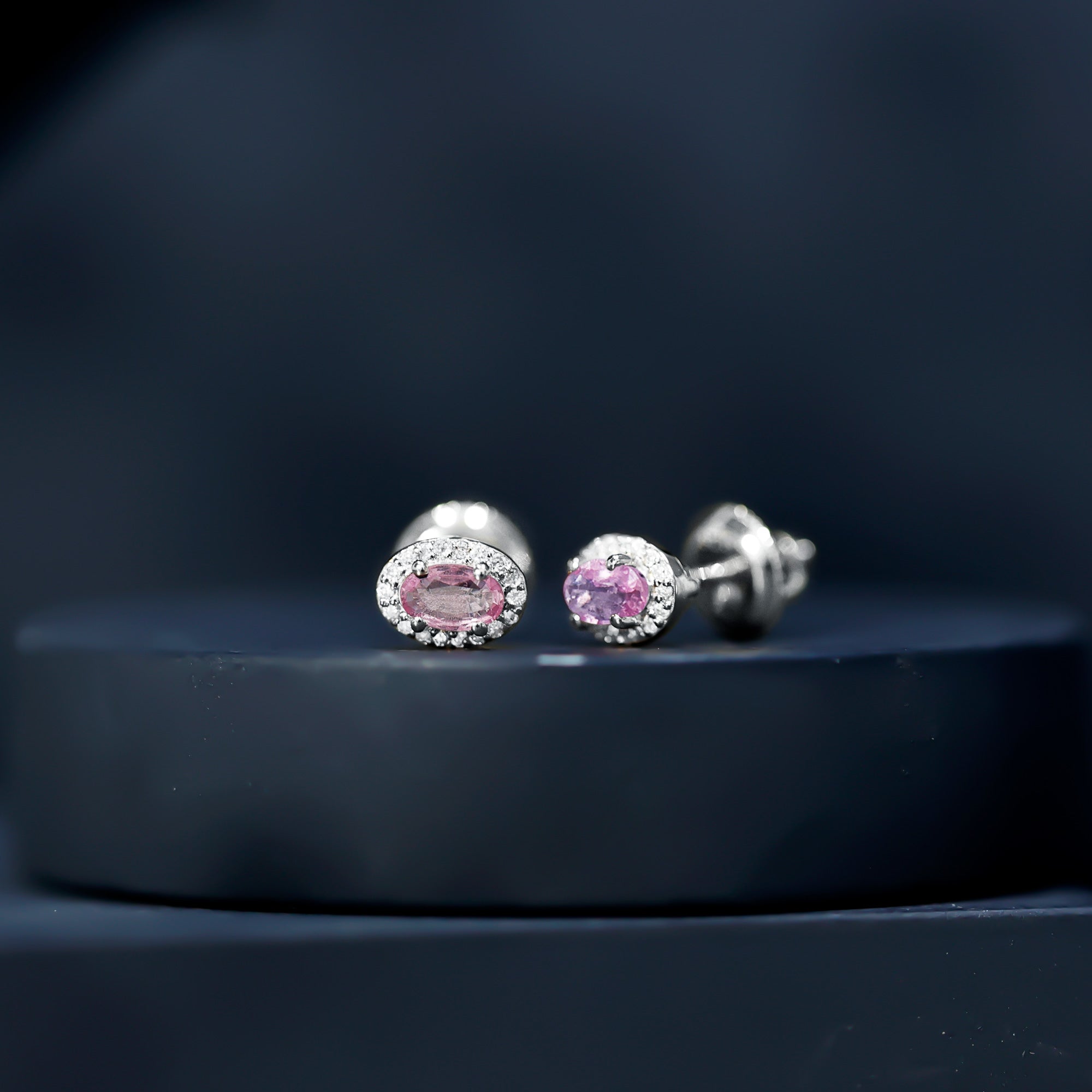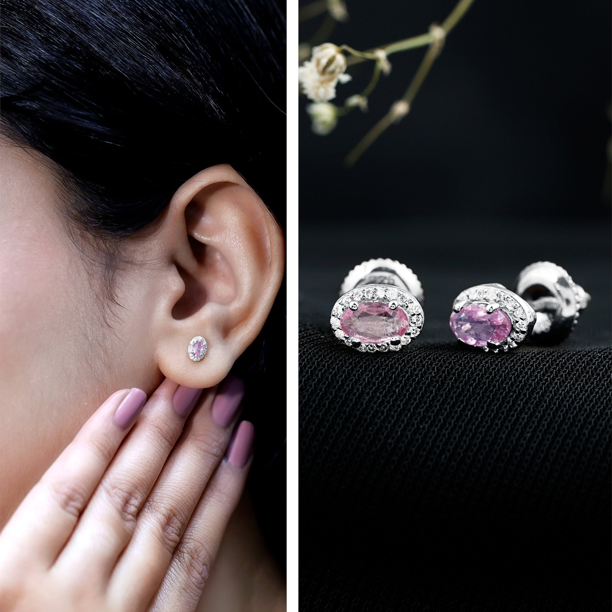 Add a touch of sparkle and charm to your look with these beautiful Pink Sapphire Stud Earrings. Designed to blend modern elegance with classic beauty, these Oval Stud Earrings are perfect for both everyday wear and special moments. Each earring features a 3X5 MM oval shaped Pink Sapphire set in prong setting. Surrounding the center stones is a delicate halo of round lab grown diamonds, carefully placed to reflect light and add extra shimmer. The soft pink hue of the sapphire and the sparkling white diamonds create a lovely contrast that feels fresh, feminine, and timeless. The Pink Sapphire and Diamond Earrings are made from 14K white gold plated silver and finished with secure screw back closures, giving you both comfort and peace of mind. These Halo Earrings are made of AAA quality pink sapphire paired with EF-VS quality lab made diamonds, ensuring excellent sparkle and long-lasting shine. Whether you are dressing up for a romantic evening, a wedding, or simply adding a touch of beauty to your everyday outfit, these Bridal Stud Earrings are a perfect choice. They also make a thoughtful gift for birthdays, anniversaries, or meaningful celebrations. More than just jewelry, these earrings are a beautiful way to show love, celebrate moments, and add timeless elegance to any collection.