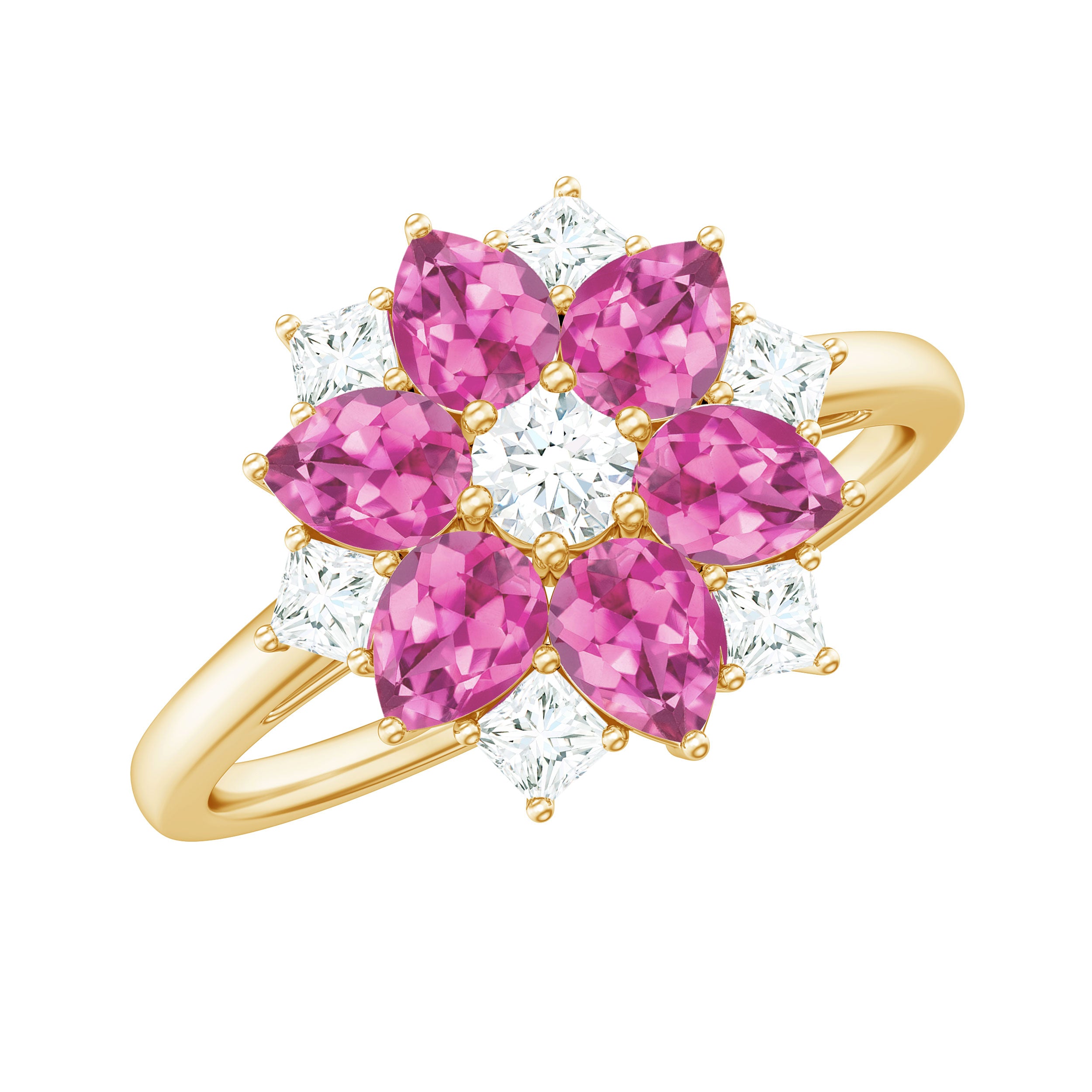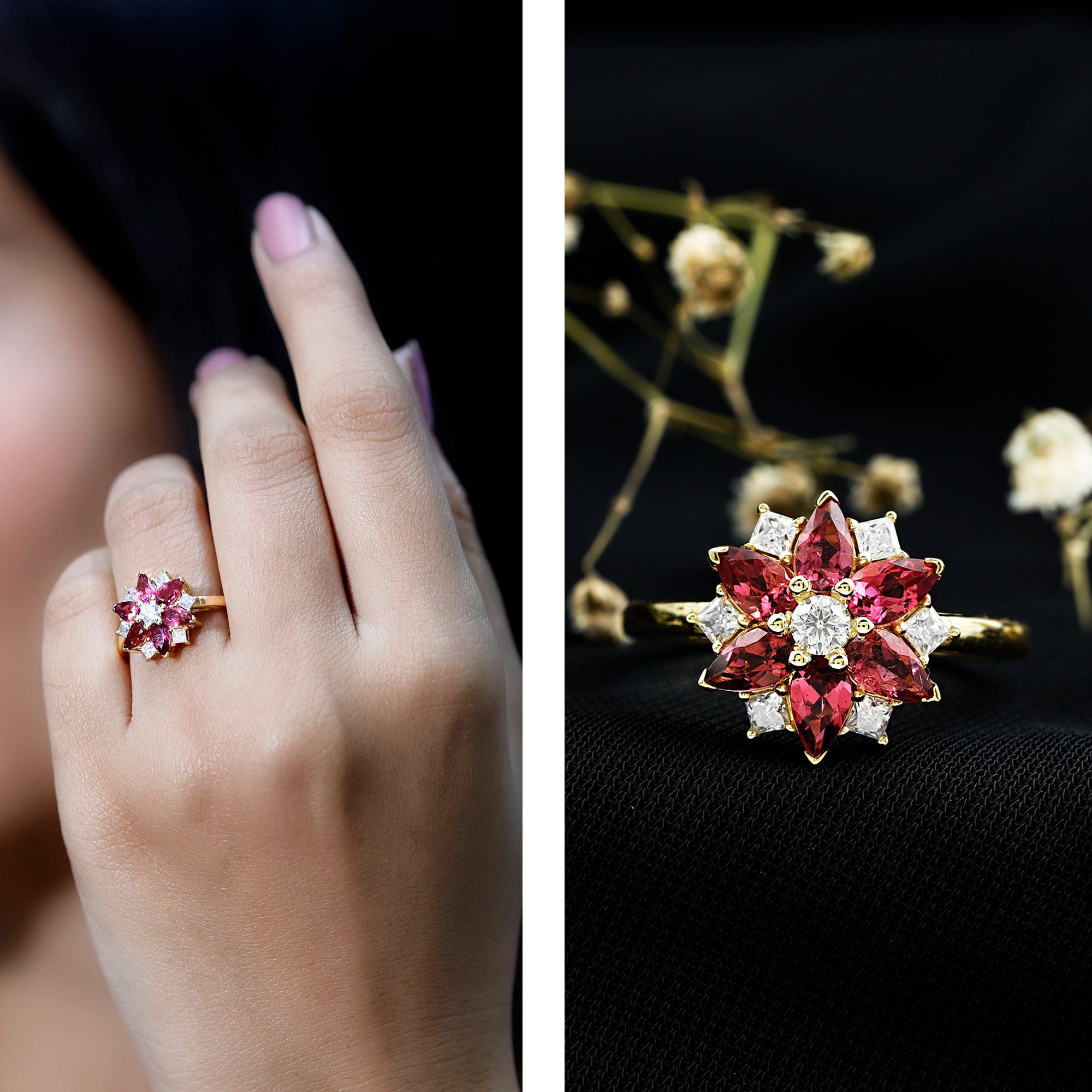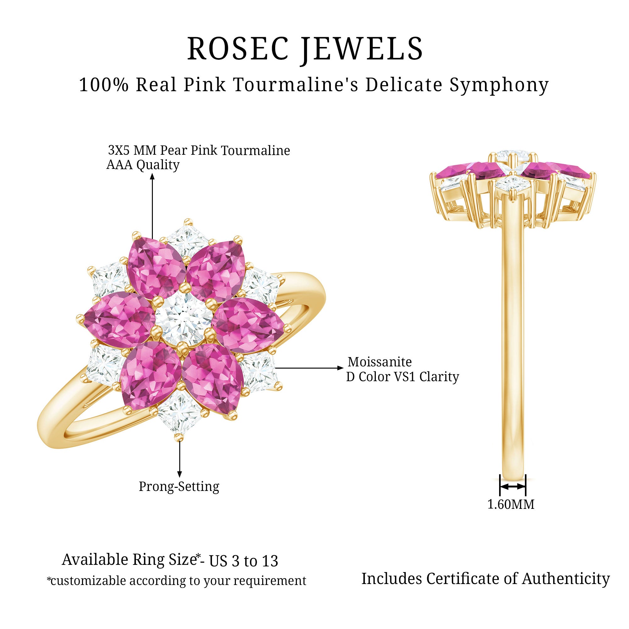Embrace the beauty of nature with this stunning Flower Ring, adorned by Pear Shape Pink Tourmaline gemstone set in Prong Setting with Round and Princess Cut Moissanite gemstones set in a floral pattern. This Pink Gemstone Ring is sure to turn heads, making you the center of attention at any event.