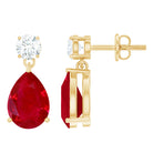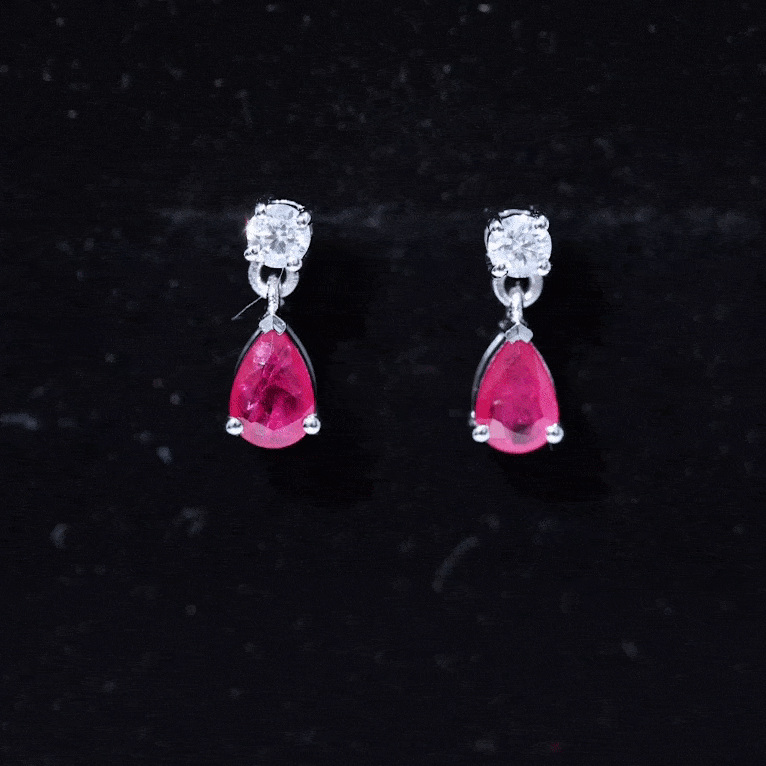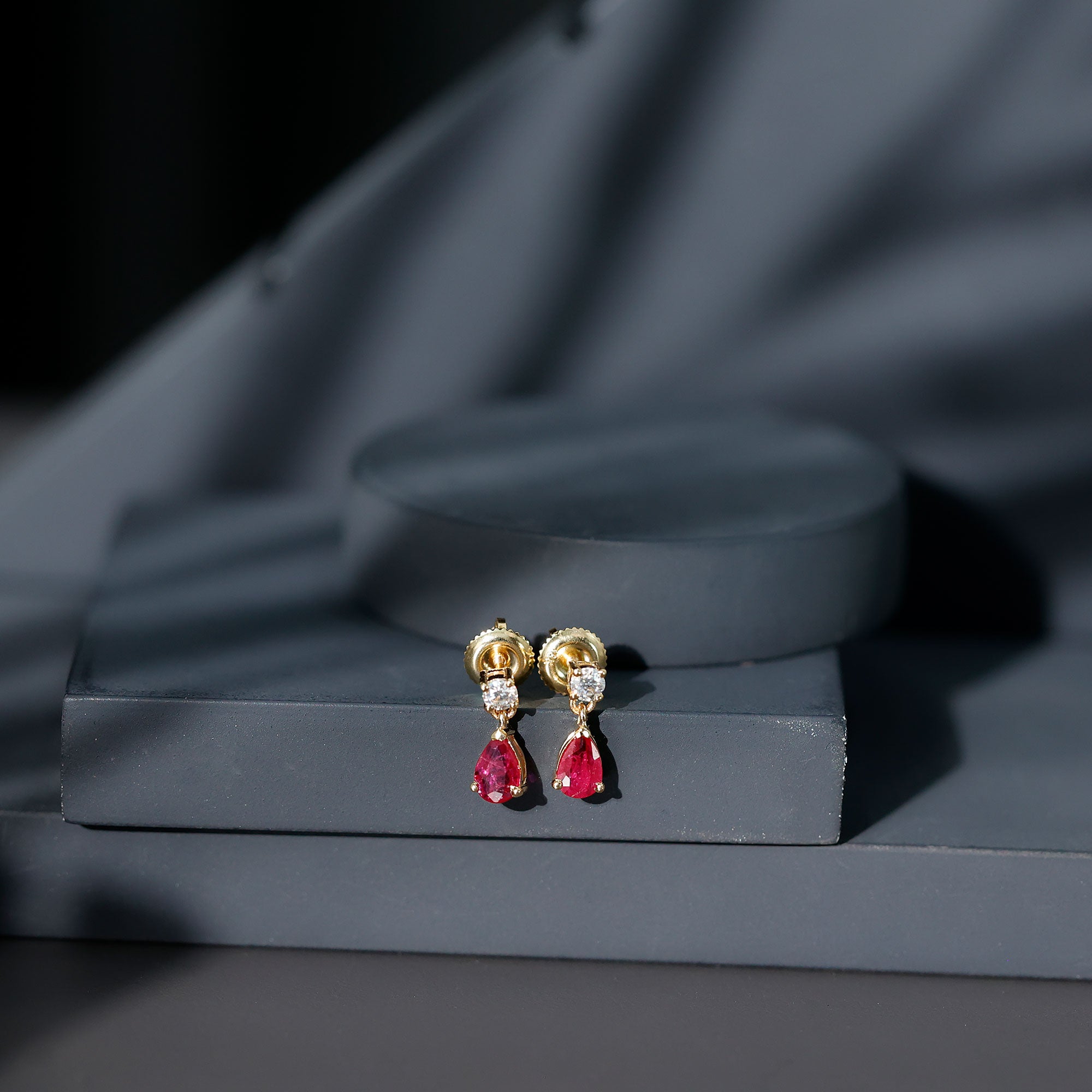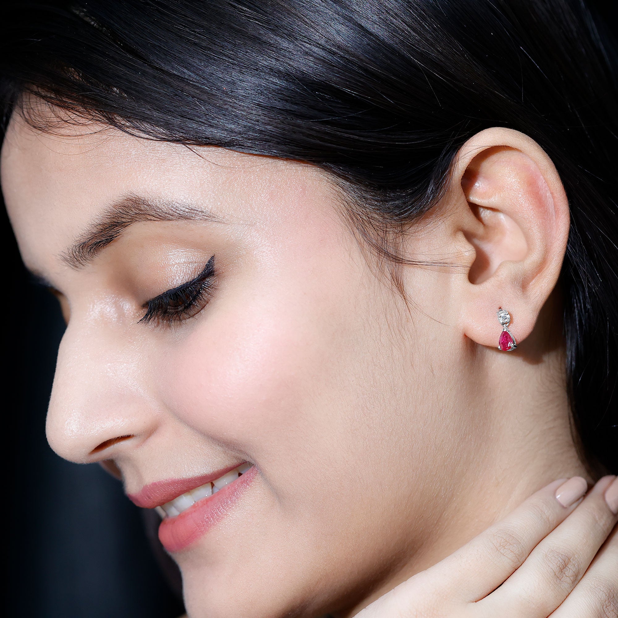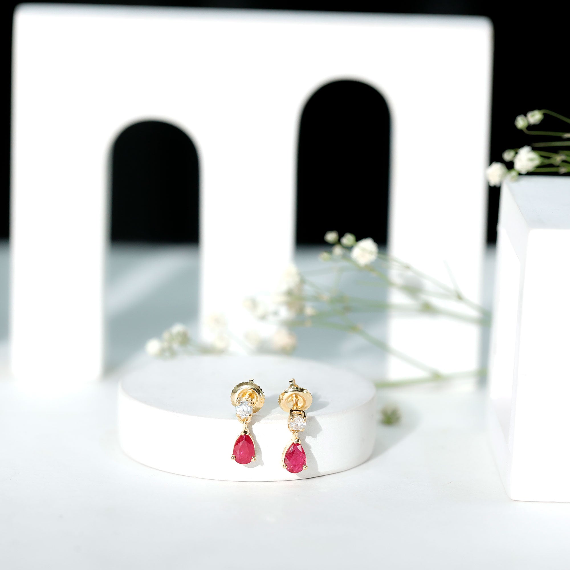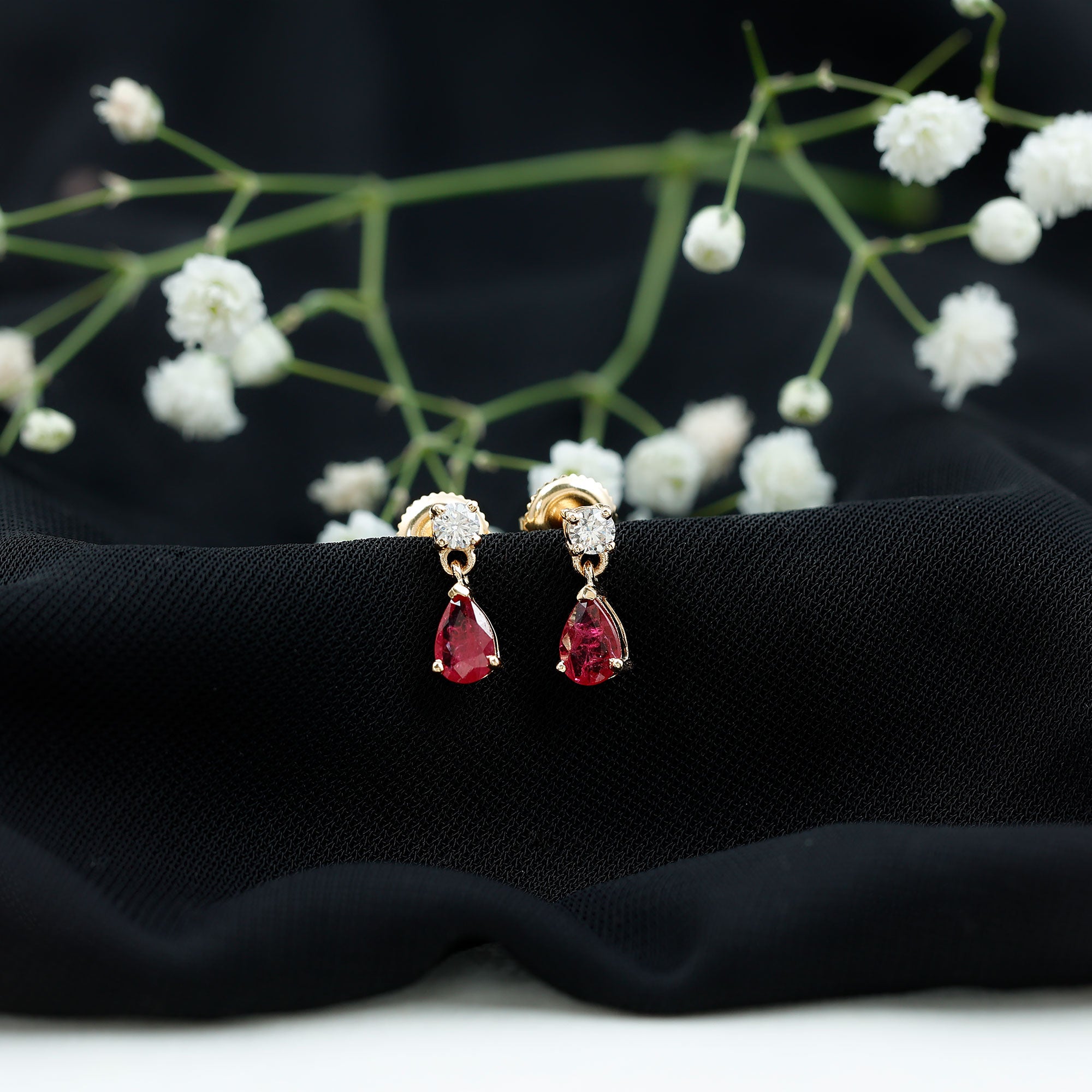 Dazzle at every step with our Ruby Dangle Drop Earrings! Effortlessly elevate your style with the pear-shaped ruby hanging as a drop, adorned with D-VS1 quality moissanite to add an artistic touch to this exclusive piece. Choose these earrings for your special days and bask in the magic they bring.