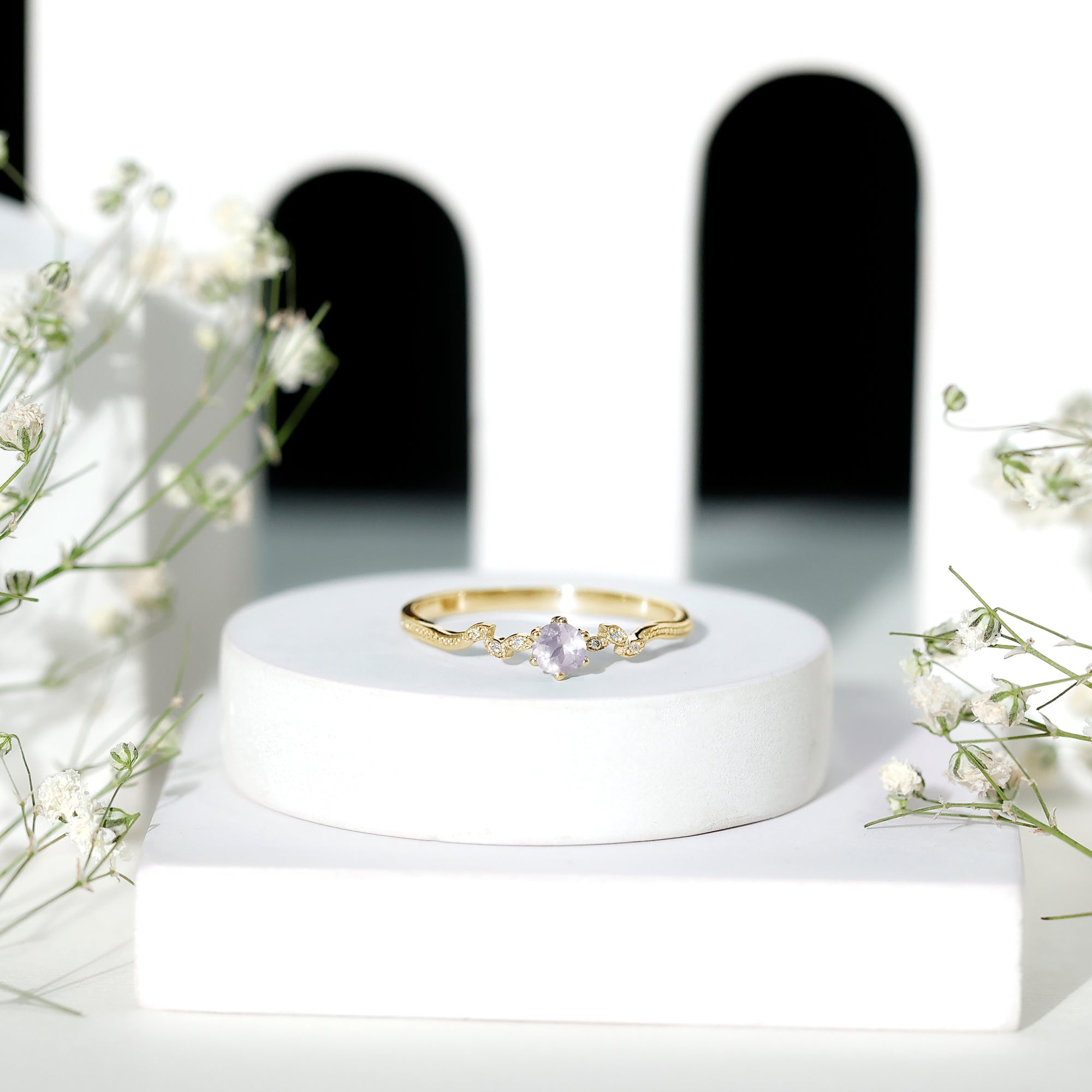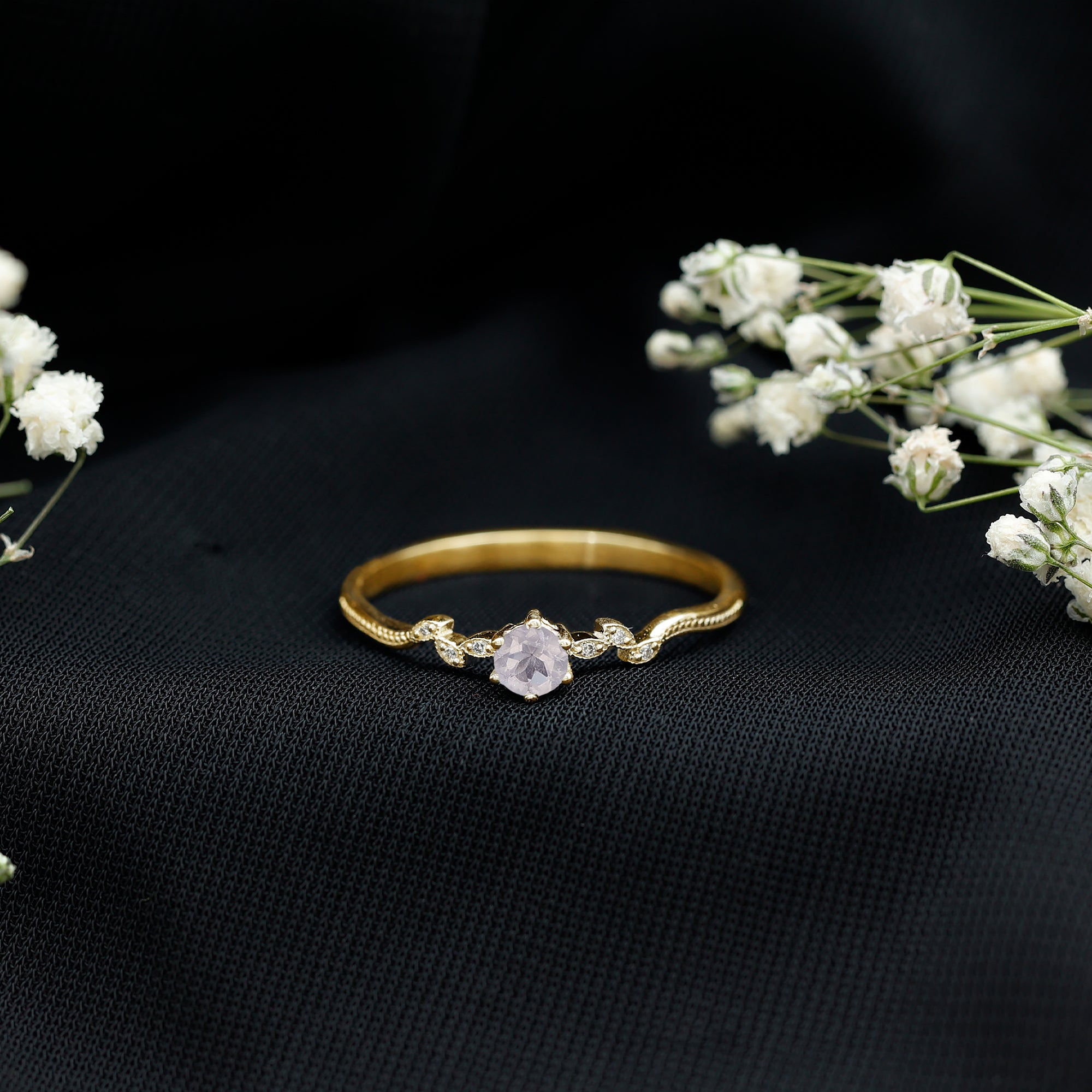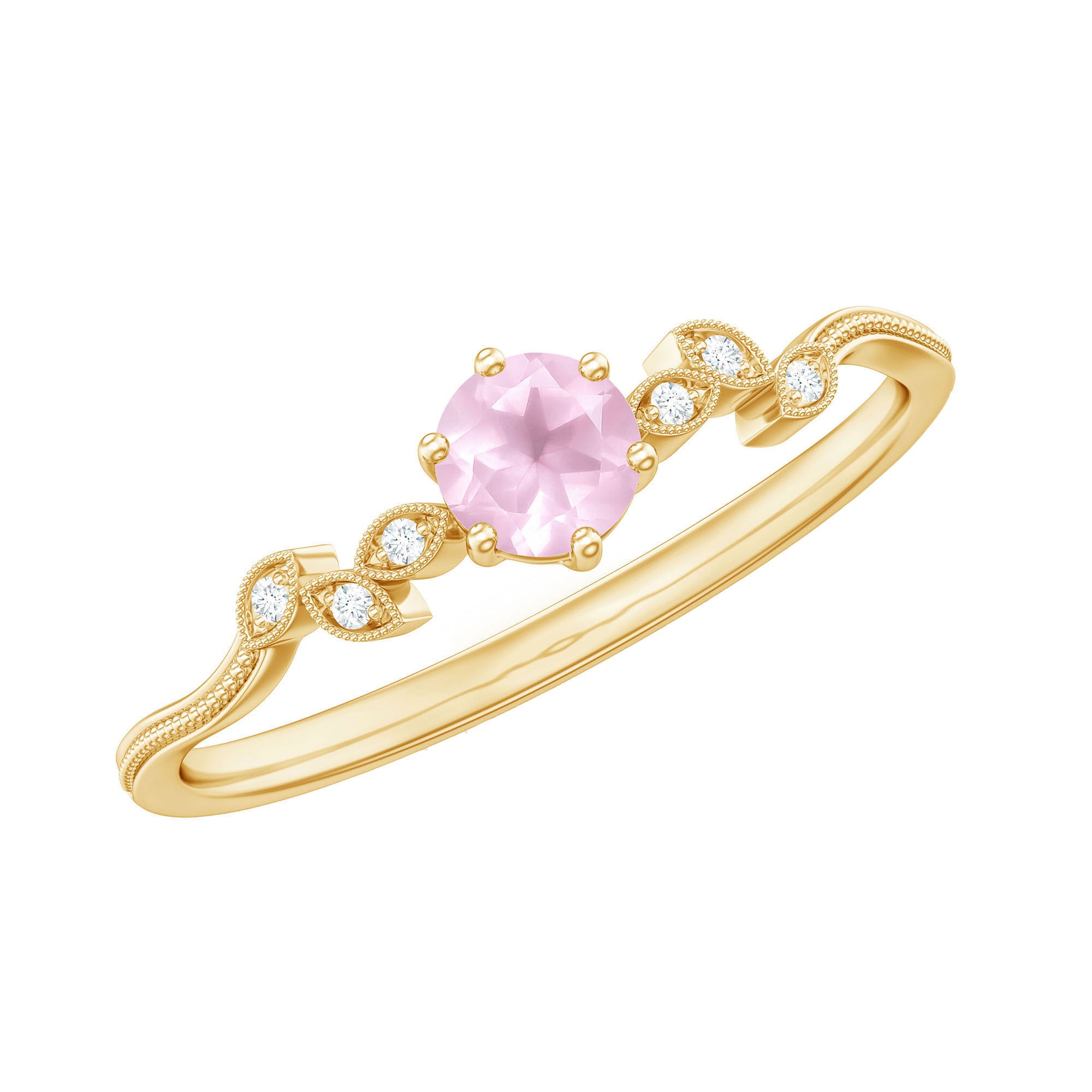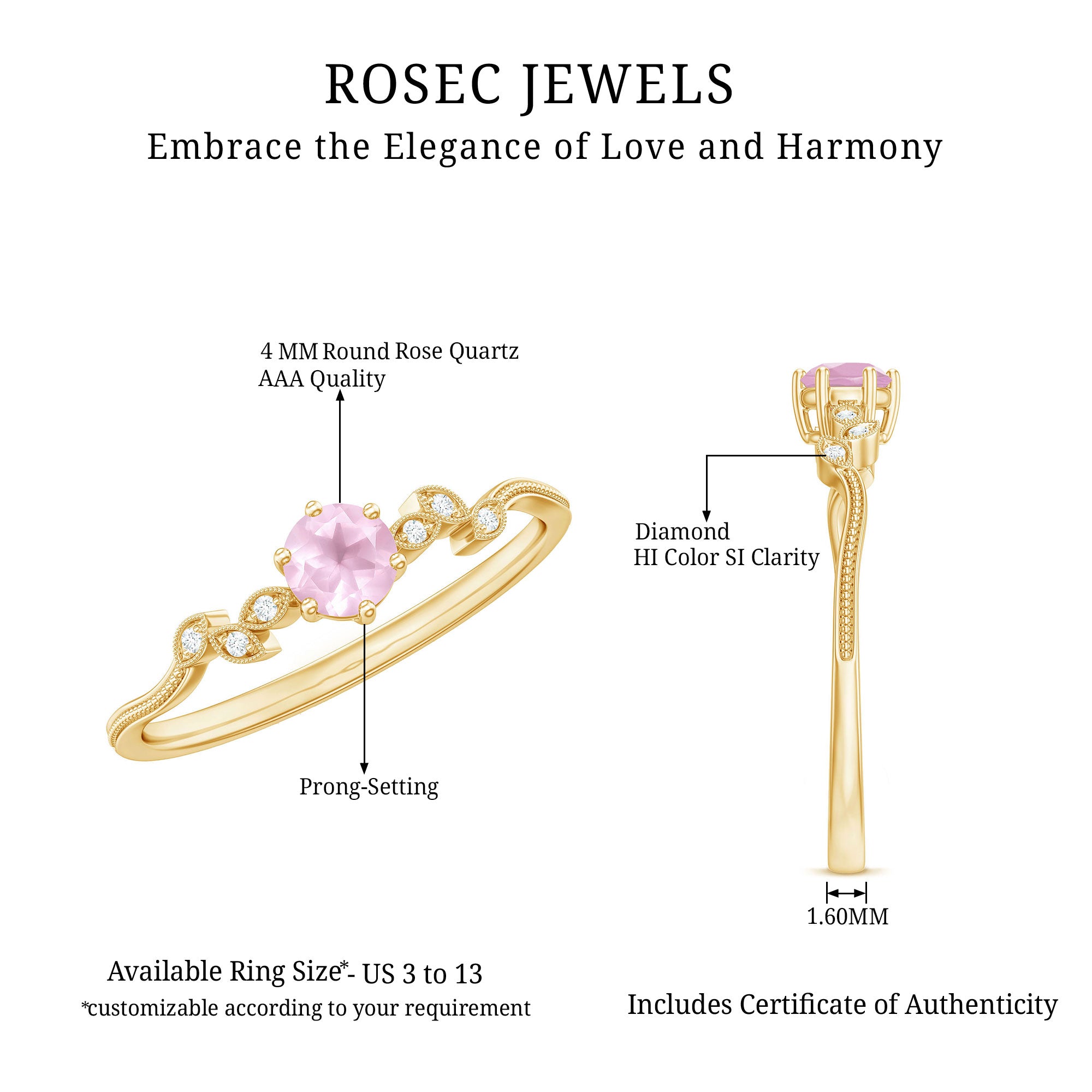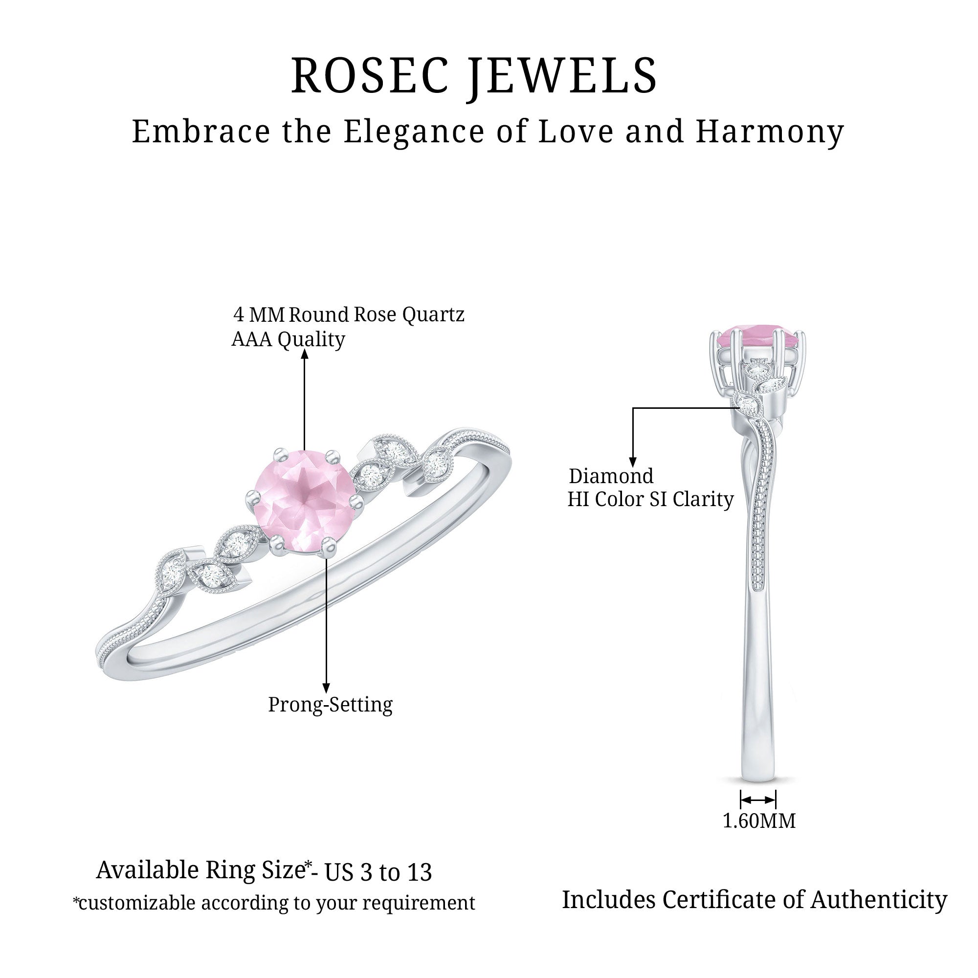 Add a touch of elegance to your life with this exquisite Leaf Promise Ring. It features a mesmerizing 4 MM Round Shape Rose Quartz gemstone, delicately set in 6-Prong Setting. Inspired by the natural beauty of a Leaf Branch, this Quartz Promise Ring showcases a stunning design that is both graceful and unique. The presence of scintillating round Diamond gems and beaded detailing, intricately studded in a leaf design band, enhances the beauty of this Nature Inspired Ring even further. Perfect for marking a promise, celebrating an anniversary, or simply giving a meaningful gift, this Rose Quartz and Diamond Ring conveys a subtle yet powerful message of love and connection. Expertly crafted from AAA quality rose quartz and HI-SI quality diamonds, this Leaf Ring showcases exceptional beauty and superior craftsmanship. Available in US sizes 3 to 13 and presented in a charming jewelry box, it is ready to be cherished.