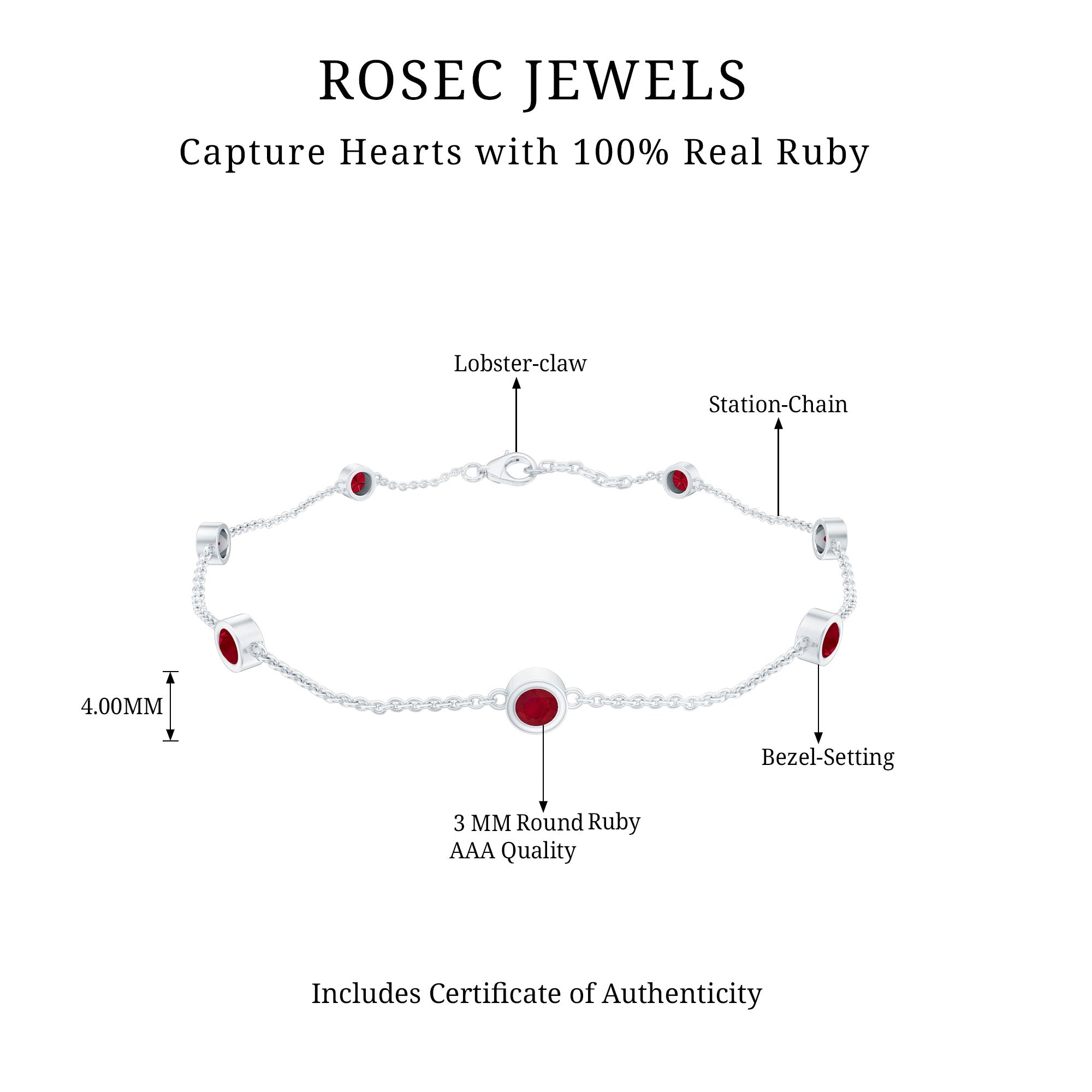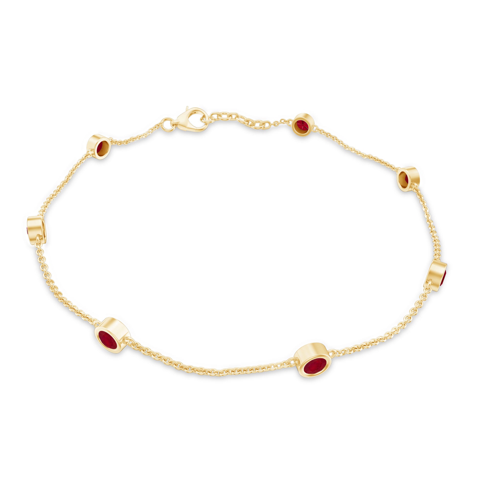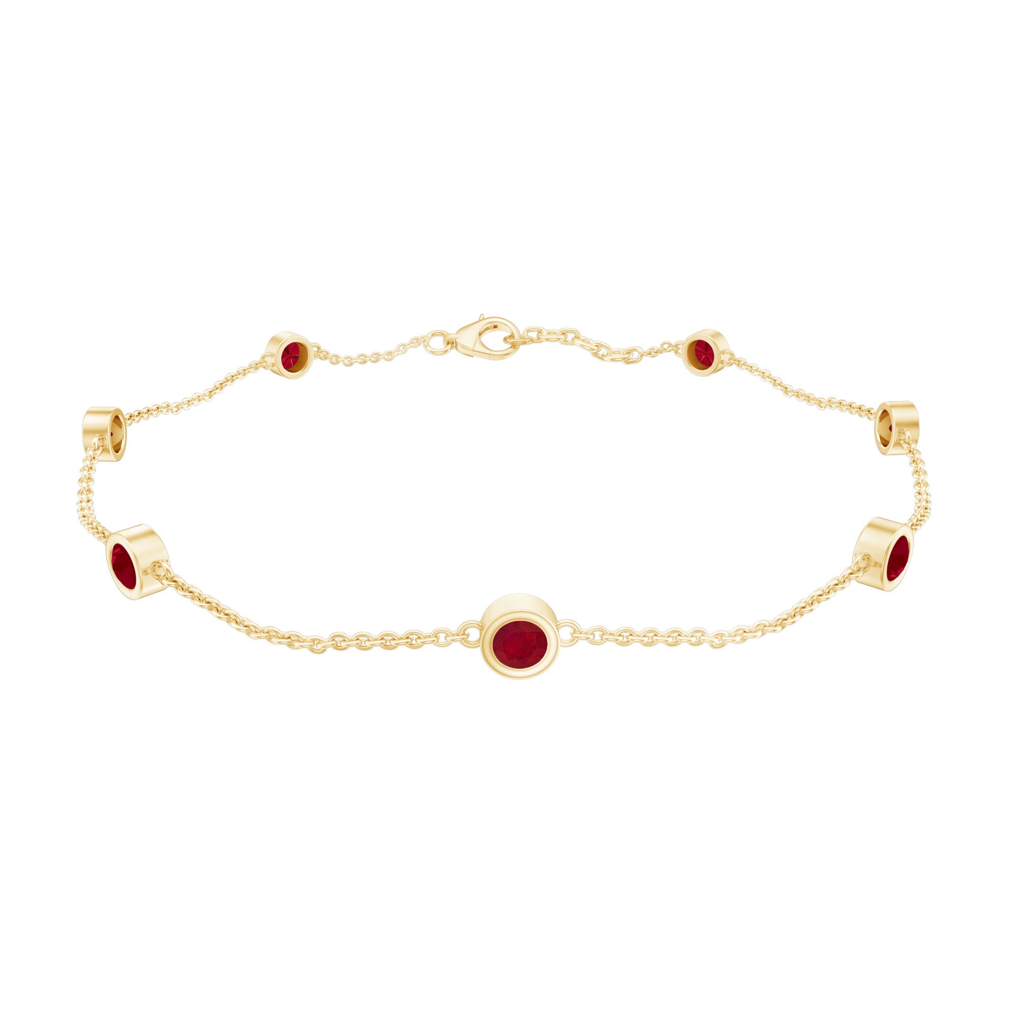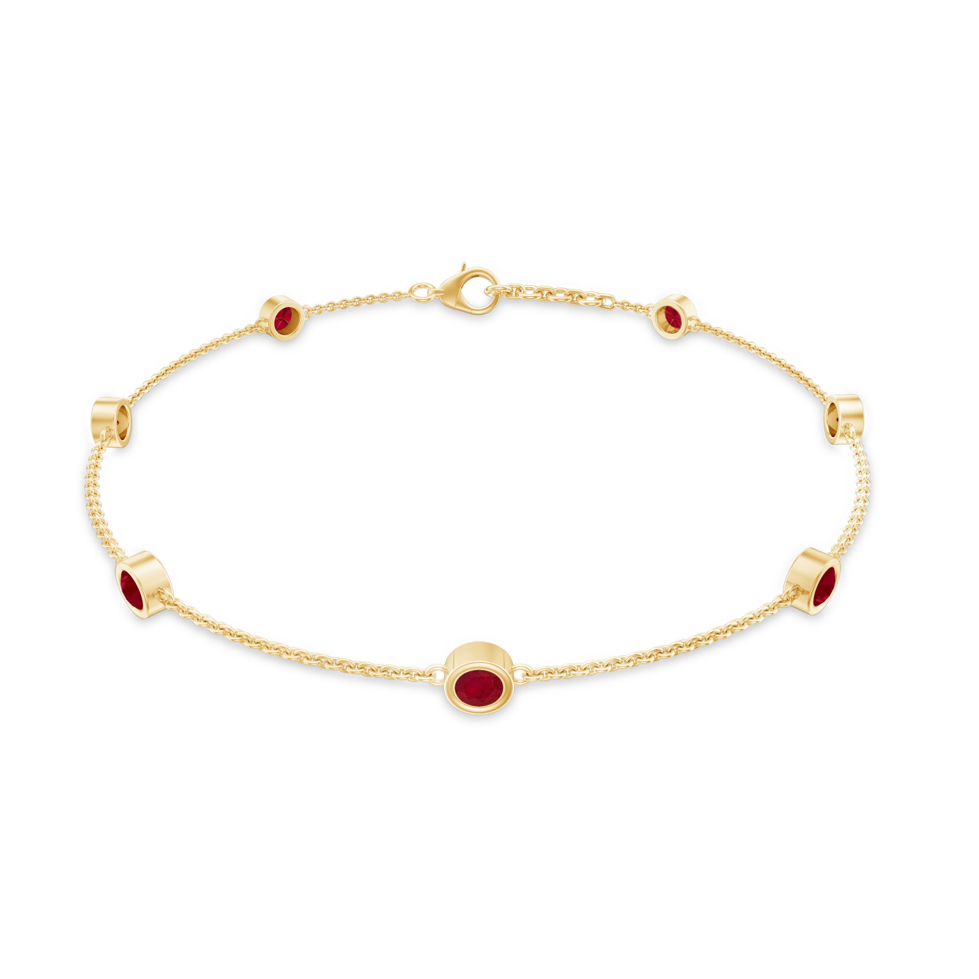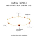 This minimal yet striking Ruby Bracelet is made for the woman who loves effortless elegance. Featuring seven Bezel Set 3 mm Round Shape Ruby stones placed evenly along a fine chain, this Station Bracelet brings a vibrant splash of deep red that feels both bold and refined. The rich glow of AAA Quality Ruby stones adds warmth, making the Ruby Birthstone Bracelet a beautiful piece that stands out without being overwhelming. Its sleek station design gives it a modern touch, while still keeping a timeless appeal that never goes out of style. This Womens Ruby Bracelet is perfect for daily wear and easy to layer with other favorites for a chic stacked look. The secure Lobster Clasp Closure ensures a snug and reliable fit, so she can wear it with confidence all day long. Whether styled with casual outfits, office wear or evening dresses, this Chain Bracelet adds just the right hint of color and sophistication. Arriving in a lovely jewelry box, this July Birthstone Bracelet is ready to gift for birthdays, anniversaries, special milestones or simply to celebrate her unique sparkle.