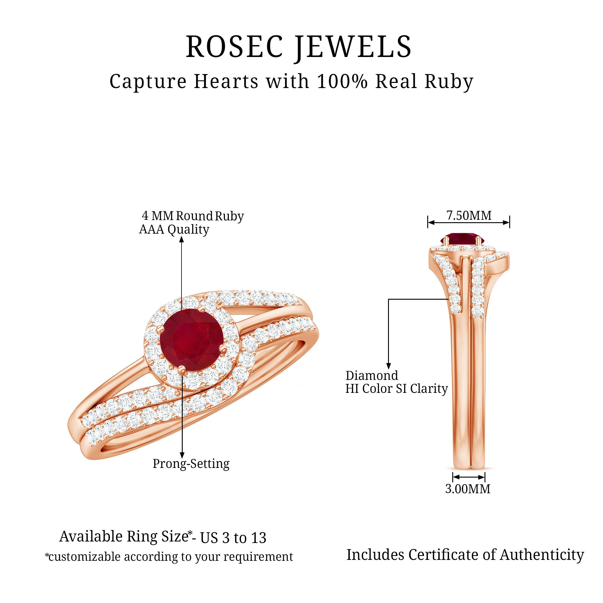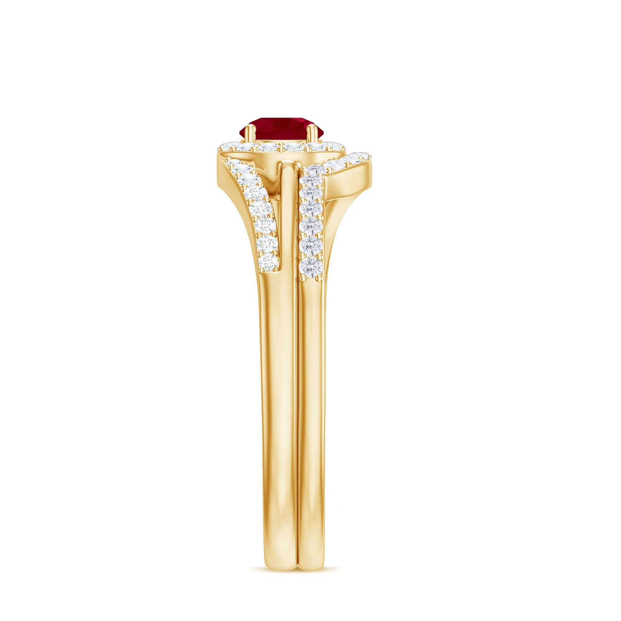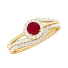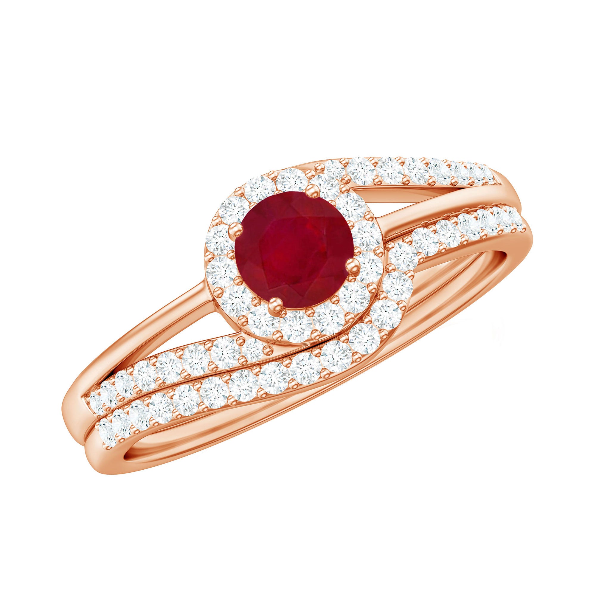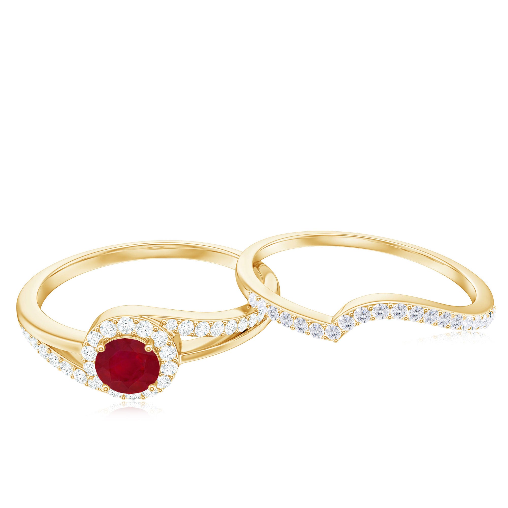 Make your special day even more memorable with our glorious Minimal Wedding Ring set. This stunning Bridal Ring Set features a Round Shape Ruby at the center, adorned with Diamond Accents, and crafted with high-quality Gold for an opulent appeal. With its elegant and timeless design, this ring set is perfect for any special occasion, adding a touch of sophistication and beauty to your look.