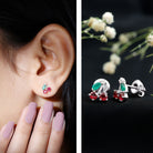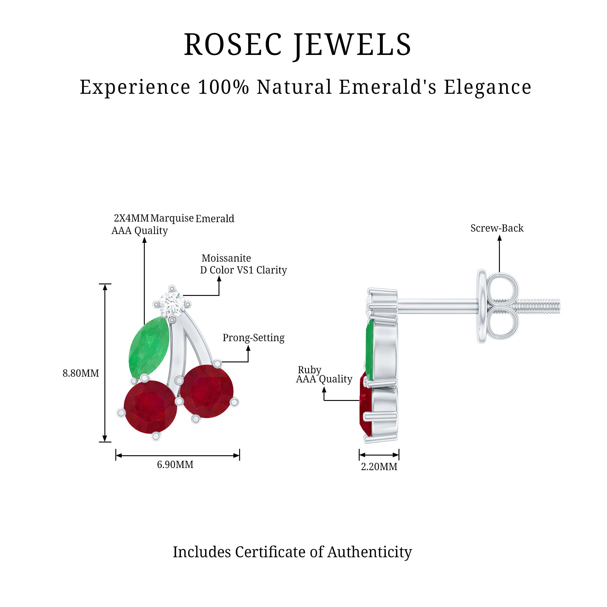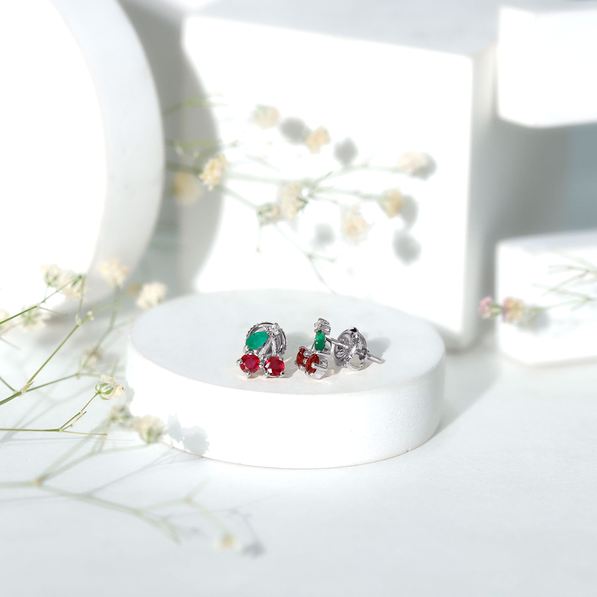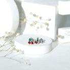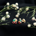 Brighten your style with a pair of playful earrings that bring a fun pop of color to any day. These cute Cherry Studs are designed for anyone who loves jewelry with charm. Each earring features a lively mix of round rubies forming the cherry shape, paired with marquise shaped emeralds that sit gently to create a leaf. A small touch of moissanite and sleek metal bars adds a little sparkle, giving the design a cheerful shine. The prong setting keeps each stone secure while allowing plenty of light to shine through. The result is a playful yet polished look that can be worn with casual outfits, weekend styles, or even something dressy when you want a fun twist. The screw back closure makes these Ruby Stud Earrings safe and comfortable for daily wear. They stay in place, so you can enjoy the cute design without worrying about them slipping out. Whether you are adding a fresh touch to your jewelry collection or searching for a sweet gift for someone special, these Fruit Earrings make a delightful choice. They bring color, charm, and a hint of whimsy to any moment, perfect for someone who loves accessories that feel bright, joyful, and full of character.