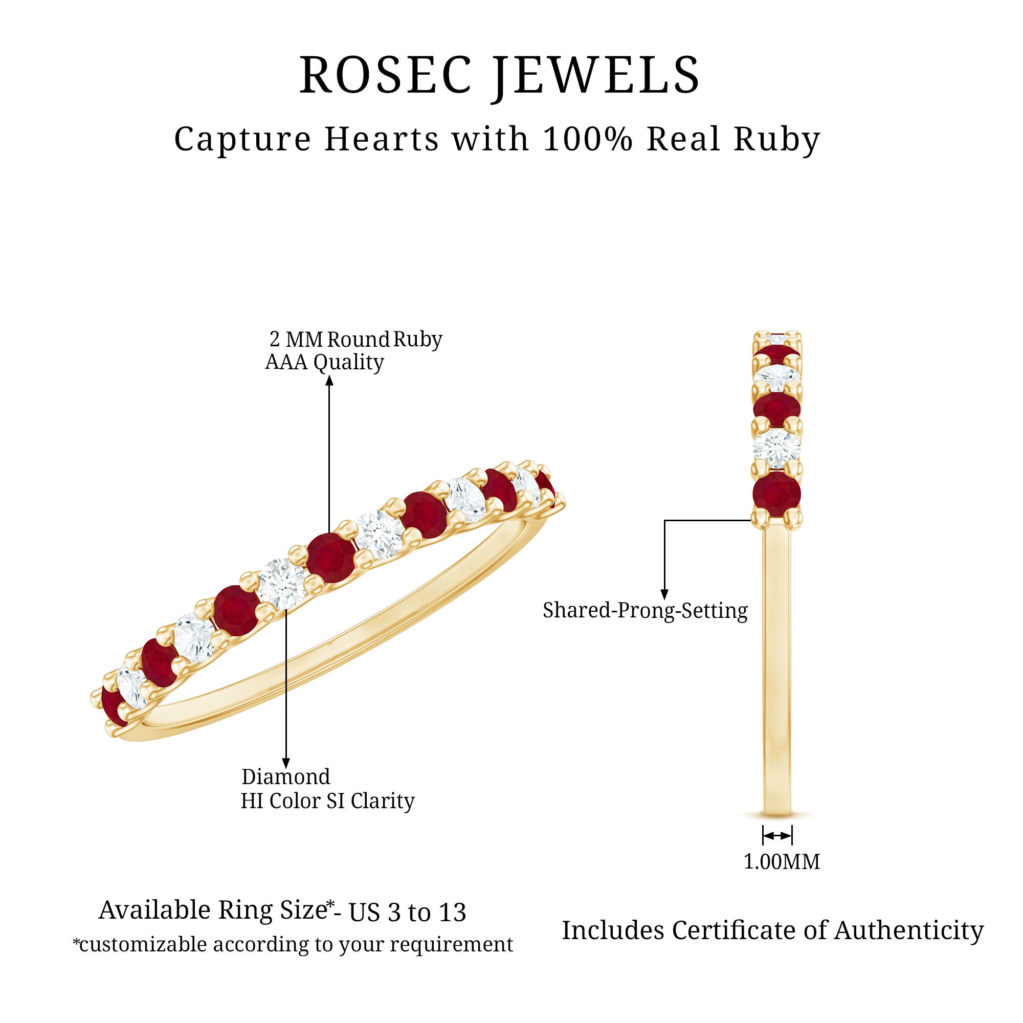 This sparkling Anniversary Eternity Ring is adorned with the Round Shape Rubies and Diamonds placed in Prong Setting that is a trendy choice for everyday styling. The Semi Eternity Ring is a beautiful choice for the celebration. This Ruby Band Ring can be worn solely to achieve a casual look or can be worn as an enhancer to achieve a statement look. This Stackable Ruby Ring beholds the shine of AAA quality Rubies and HI-SI quality Diamonds. This ruby ring is crafted for your special occasion and will be delivered in the signature jewelry box.