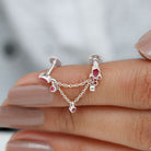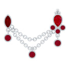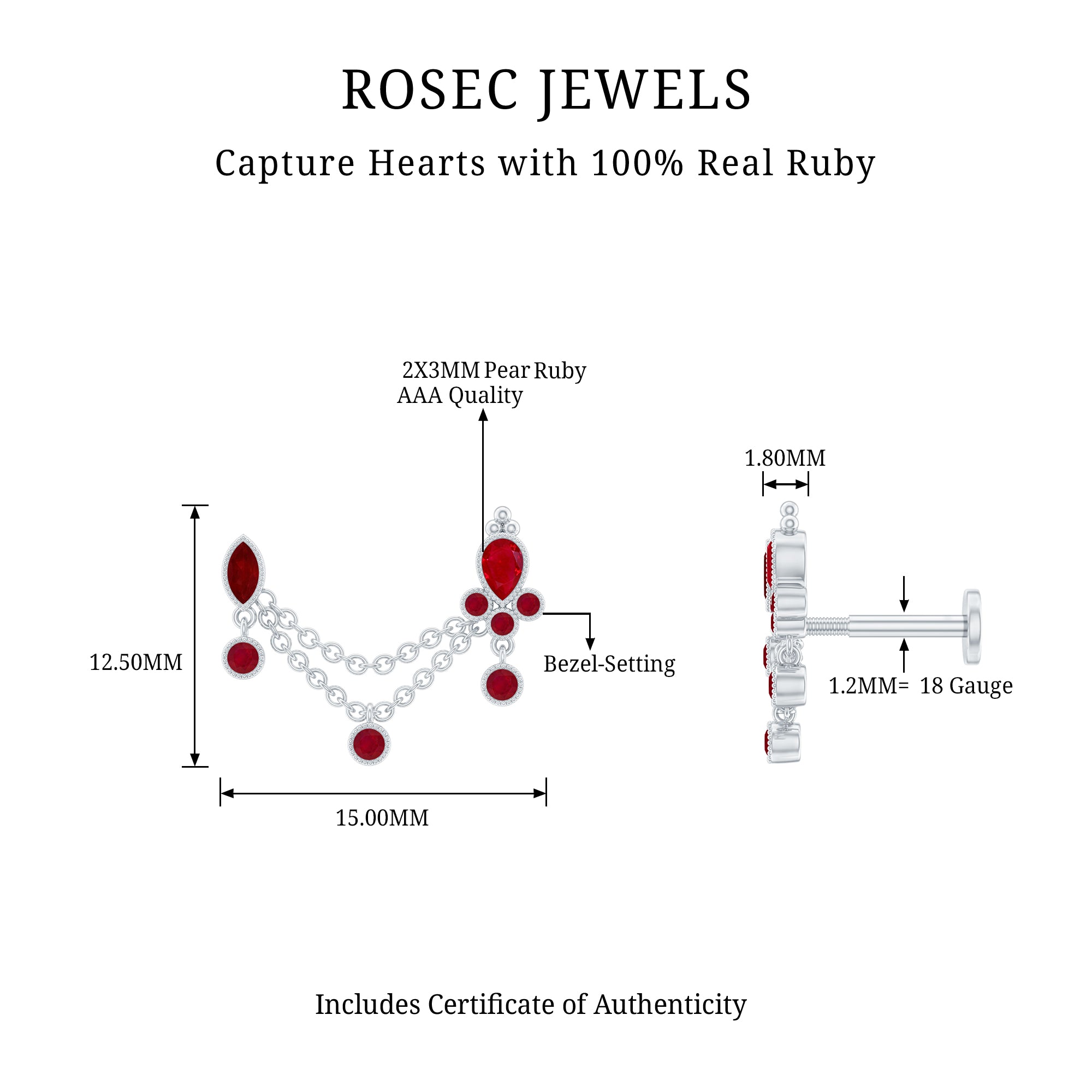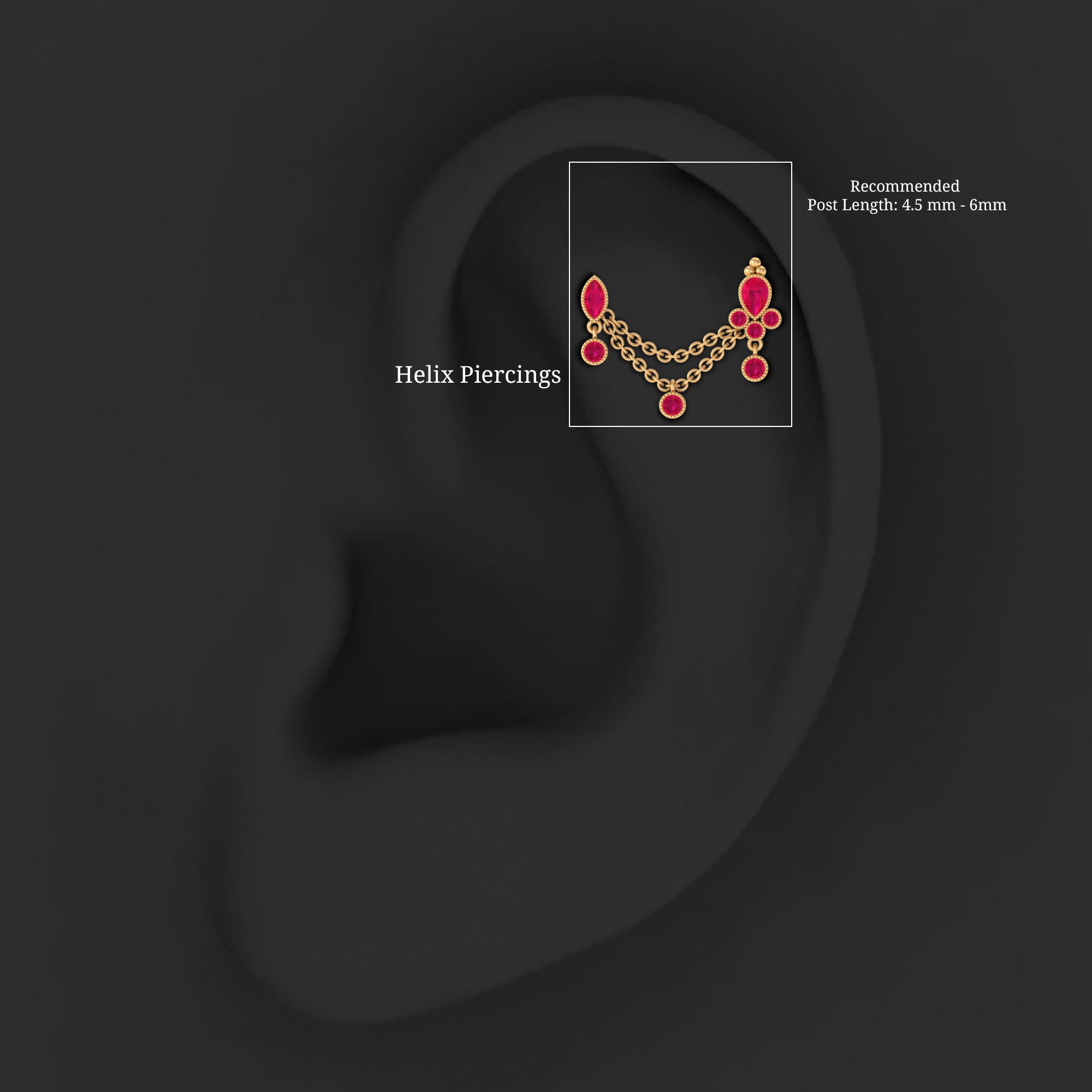 Enhance your ear piercing game with this Ruby Helix Earring by stacking it with the other statement earrings. This earring features a combination of pear, marquise, and round cut Rubies securely placed in Beaded Bezel Setting connected with two cable chain. This Double Piercing Earring can be worn on the Helix, Cartilage, or Upper Lobe. With this Helix Chain Earring, you are ready to slay with the bling. It is crafted for you and will be delivered in a premium quality jewelry box for safe storage in the future. Available in various metal options, you can select the finish that best matches your personal style. The combination of rich ruby color, vintage detailing, and dangling chain makes this Double Piercing Chain Earring a standout accessory that complements both casual and formal outfits. Classic and elegant, it is a piece that adds timeless beauty and a hint of romance to any jewelry collection.