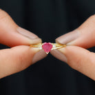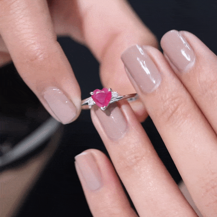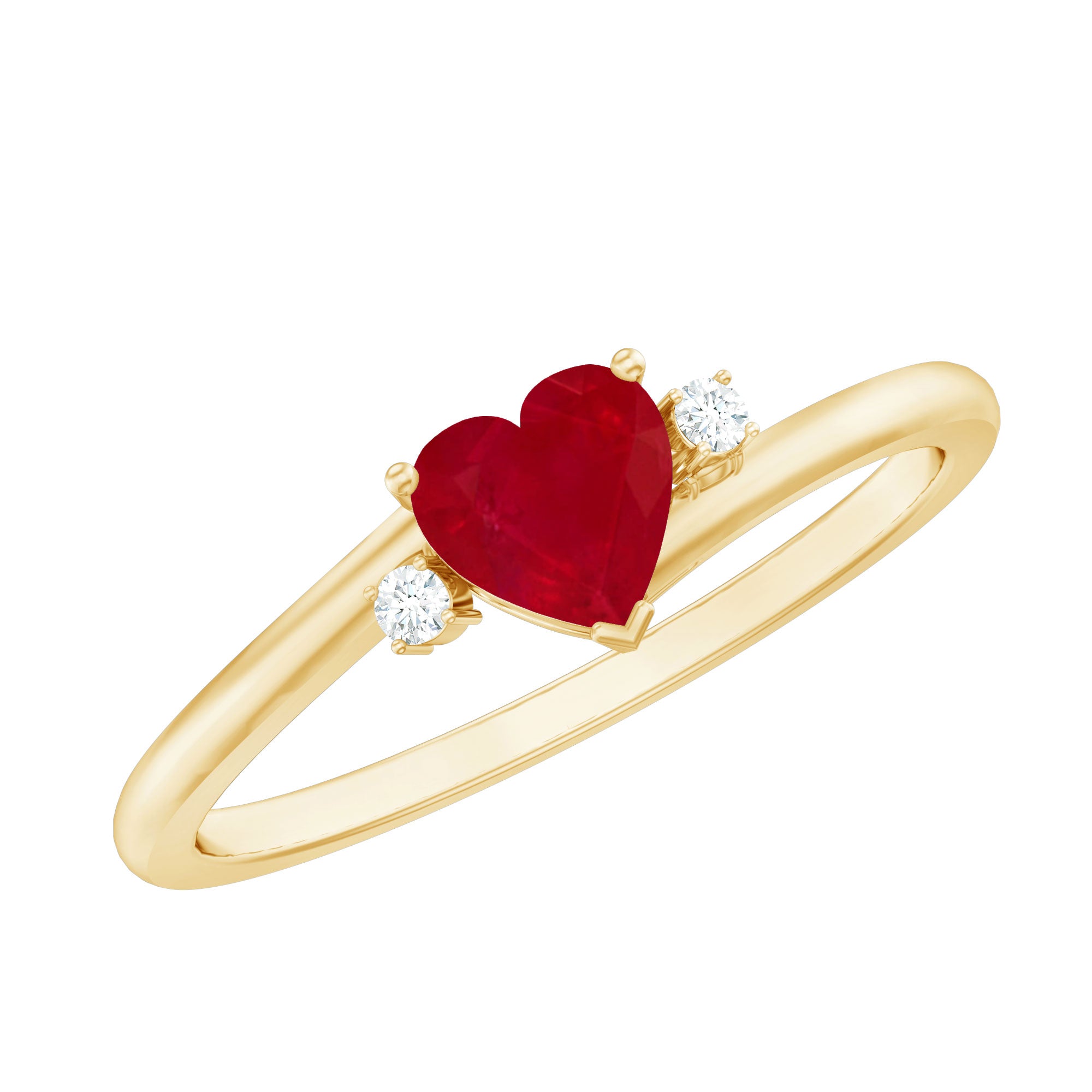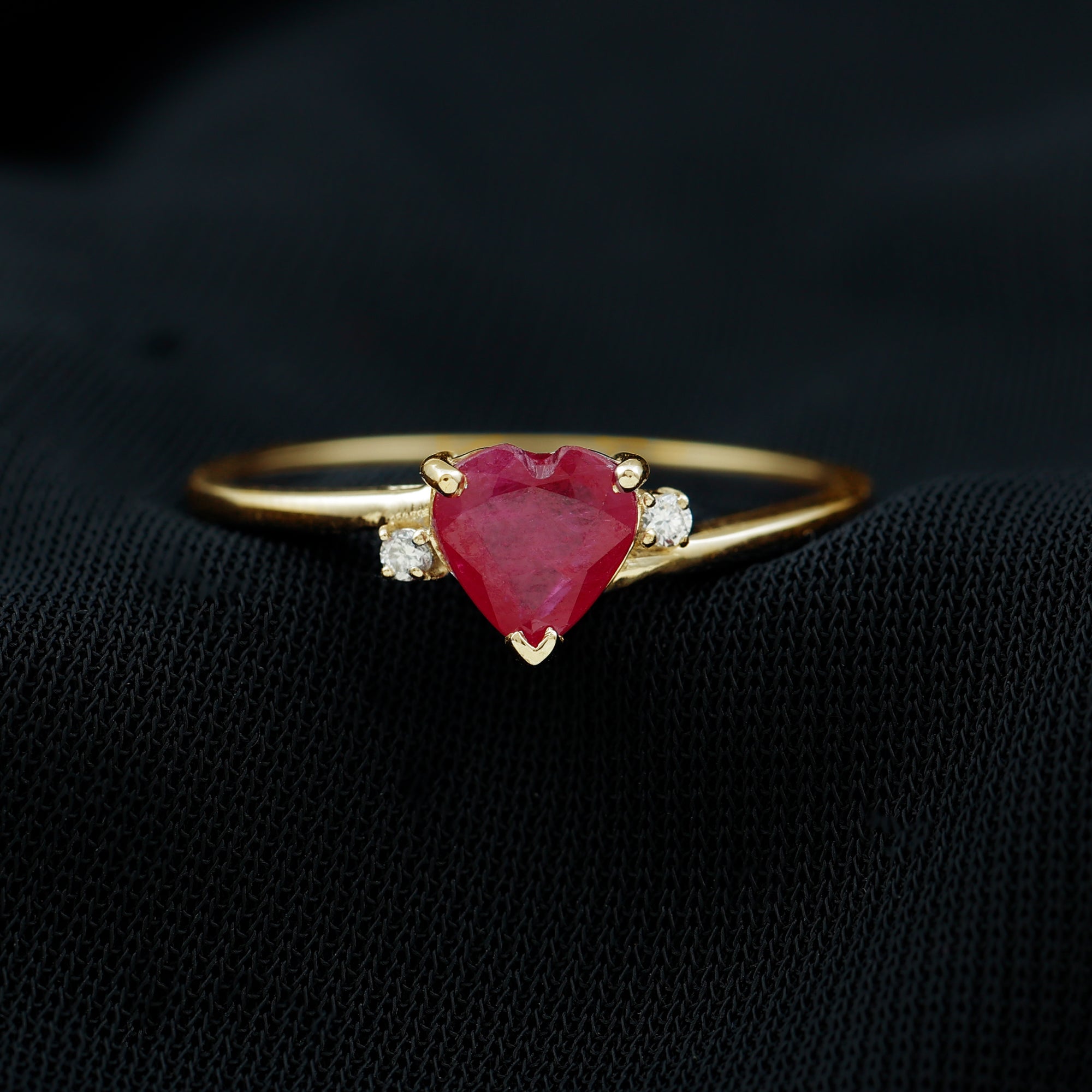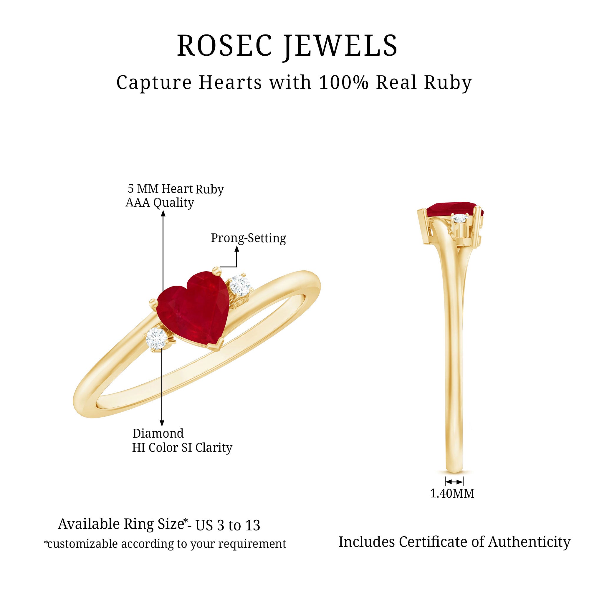 As an eye-catching statement of love, this Heart Shaped Ruby Ring creates a radiant effect inspired by the love that connect the two hearts symbolizing harmony and unwavering between two souls. Celebrate your new and growing love with this meaningful Heart Promise Ring. It is adorned with 5 MM Heart Shaped Ruby in Prong Setting with HI-SI Diamond on the either side giving a thoughtful look of romantic warmth. Charm and delight with this elegant Ruby Diamond Promise Ring that has a gorgeous and elegant design generating a stunning sparkle that adds a touch of color to your look. Capture the essence of affection and heartfelt gesture with this romantic ring that is perfect for Valentines Day present, a promise ring, a minimalist engagement ring or a stunning July birthstone present.