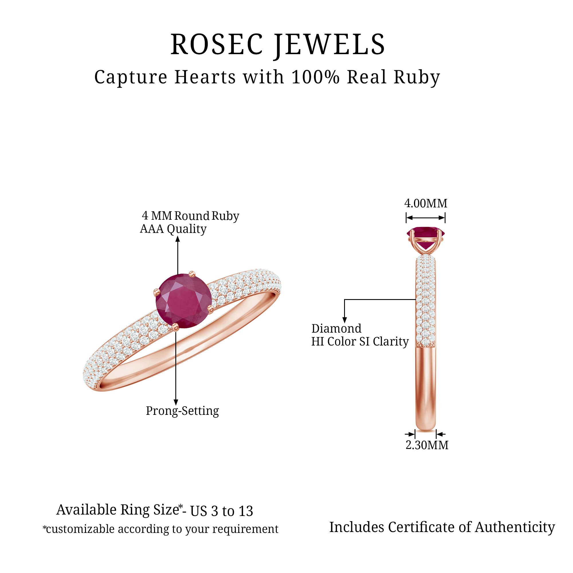 A gorgeous Ruby Cluster Ring that is sure to make a statement. Featuring a stunning round solitaire ruby at the center surrounded by small round Diamond stones in a pave setting, this party wear ring is crafted in gold. An ideal gift for weddings and anniversaries, it is a timeless piece that will be treasured for years to come.