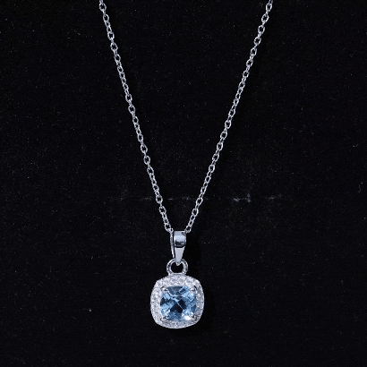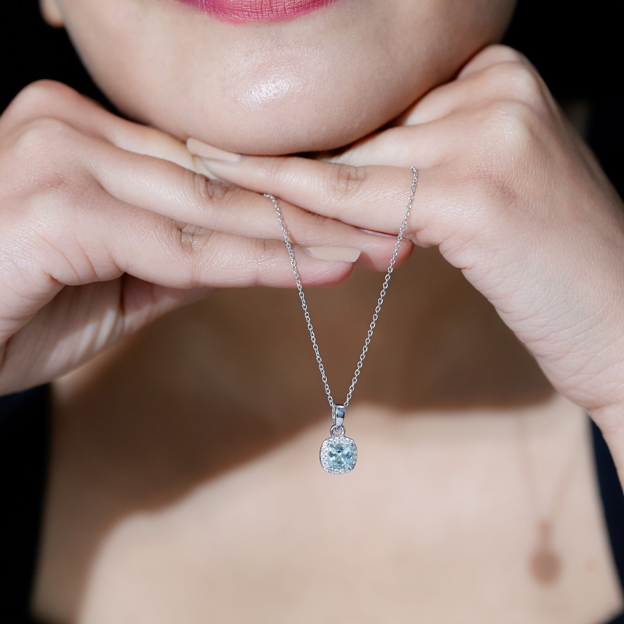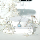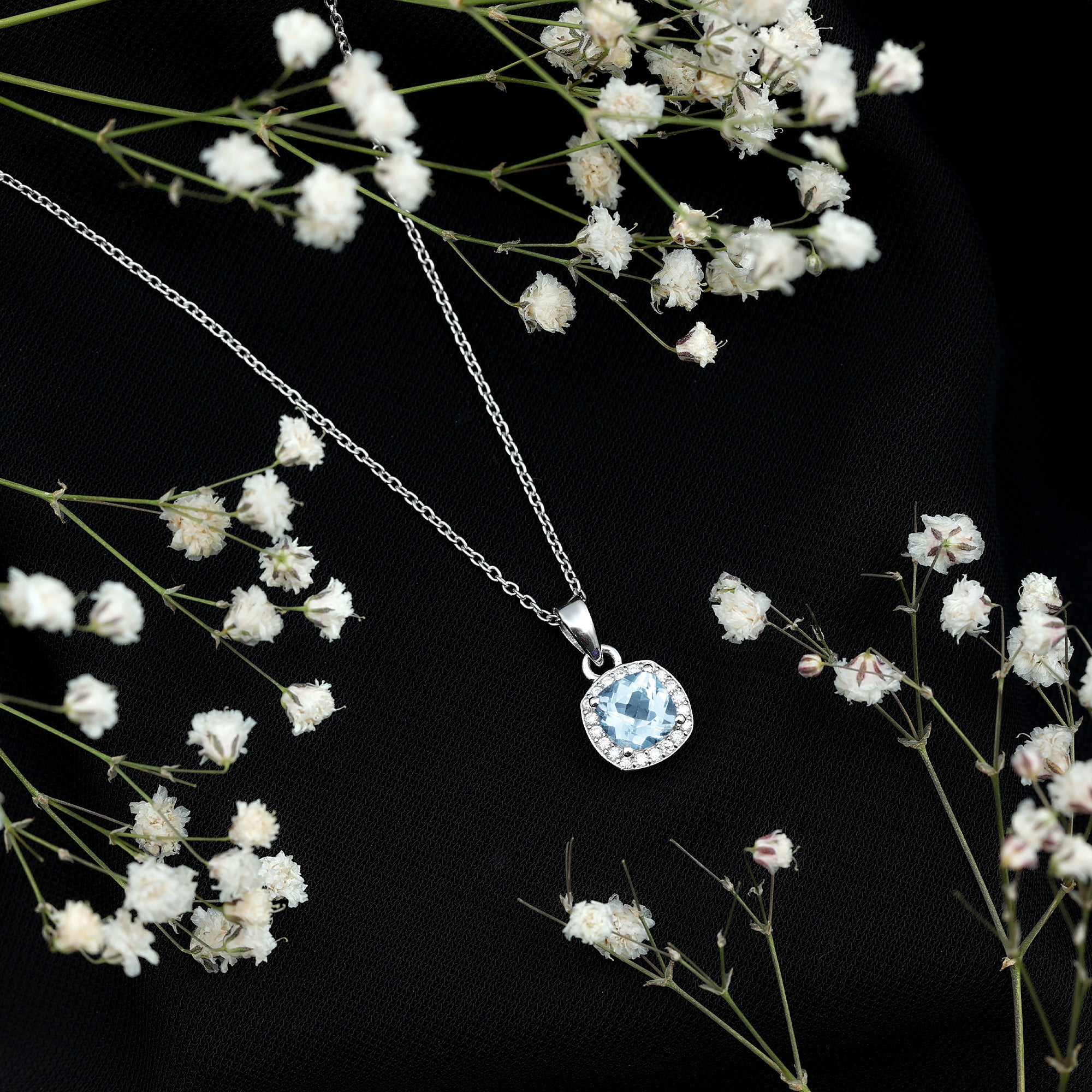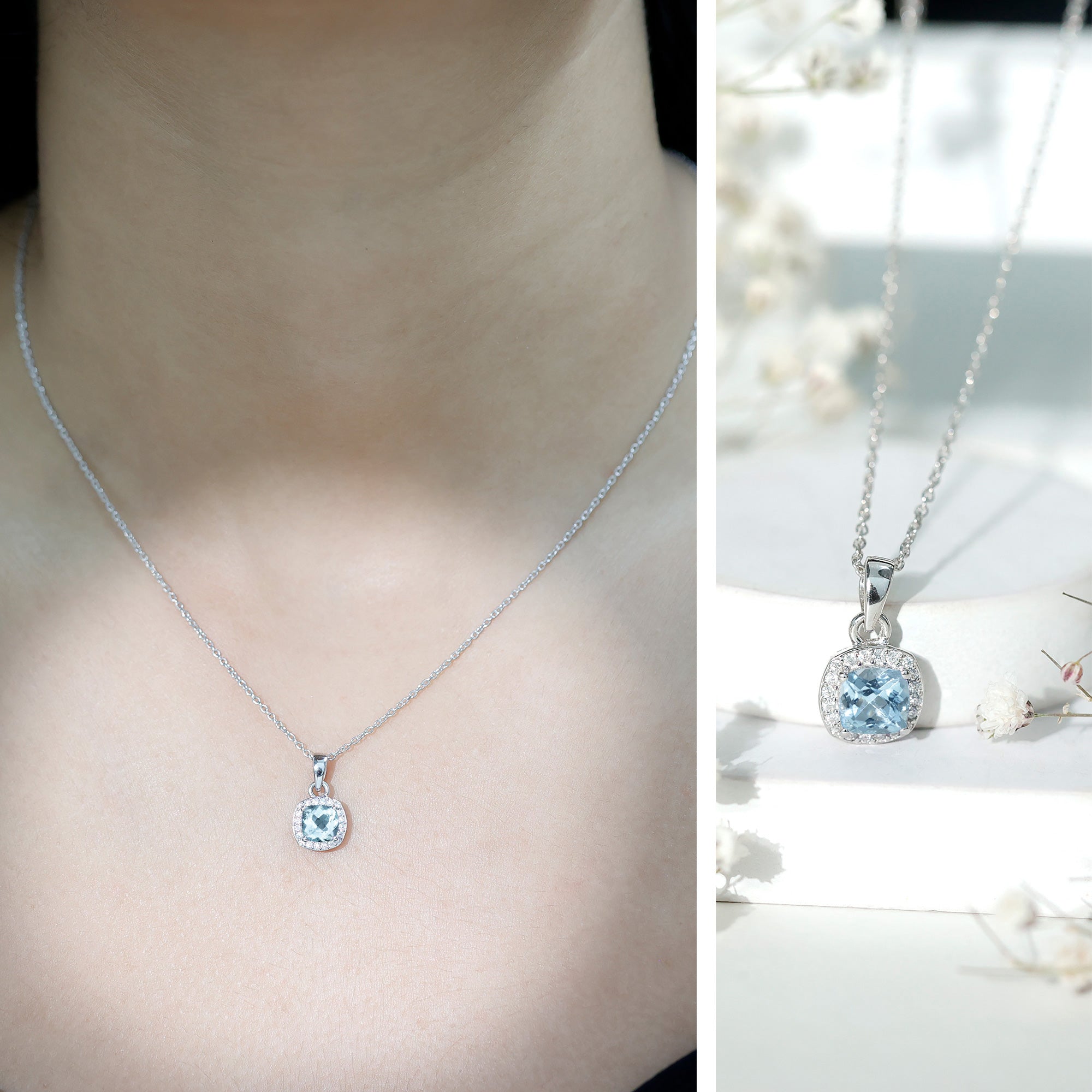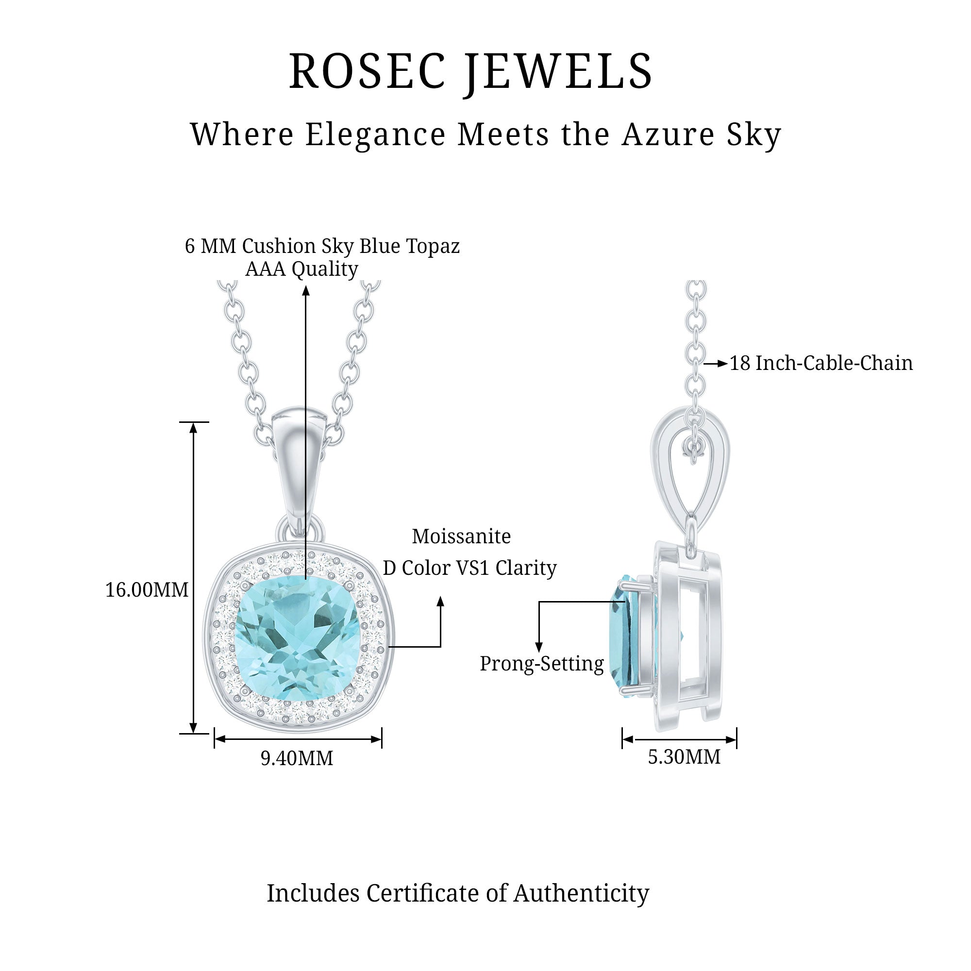 Our Sky Blue Topaz Pendant is a showstopper, a piece that does not just complement your look but completes it with brilliance. Crafted from white gold plated silver, this pendant showcases a breathtaking 6 MM cushion-shaped sky blue topaz set in a prong setting, encircled by a halo of round brilliant cut Moissanite that elevates its captivating color. This Topaz and Moissanite Pendant represents a fusion of romance and sophistication, reflecting a cool, sky hue that embodies tranquility, calmness, and harmony, making it a perfect gift for a loved one. With its chic halo design, this necklace is not only stylish but also adaptable, exuding love and charm. Symbolizing courage and communication, this Silver Topaz Necklace radiates a refined, regal presence. Its unparalleled versatility makes it an ideal vibrant accessory for women, adding a touch of color to any outfit during special occasions.