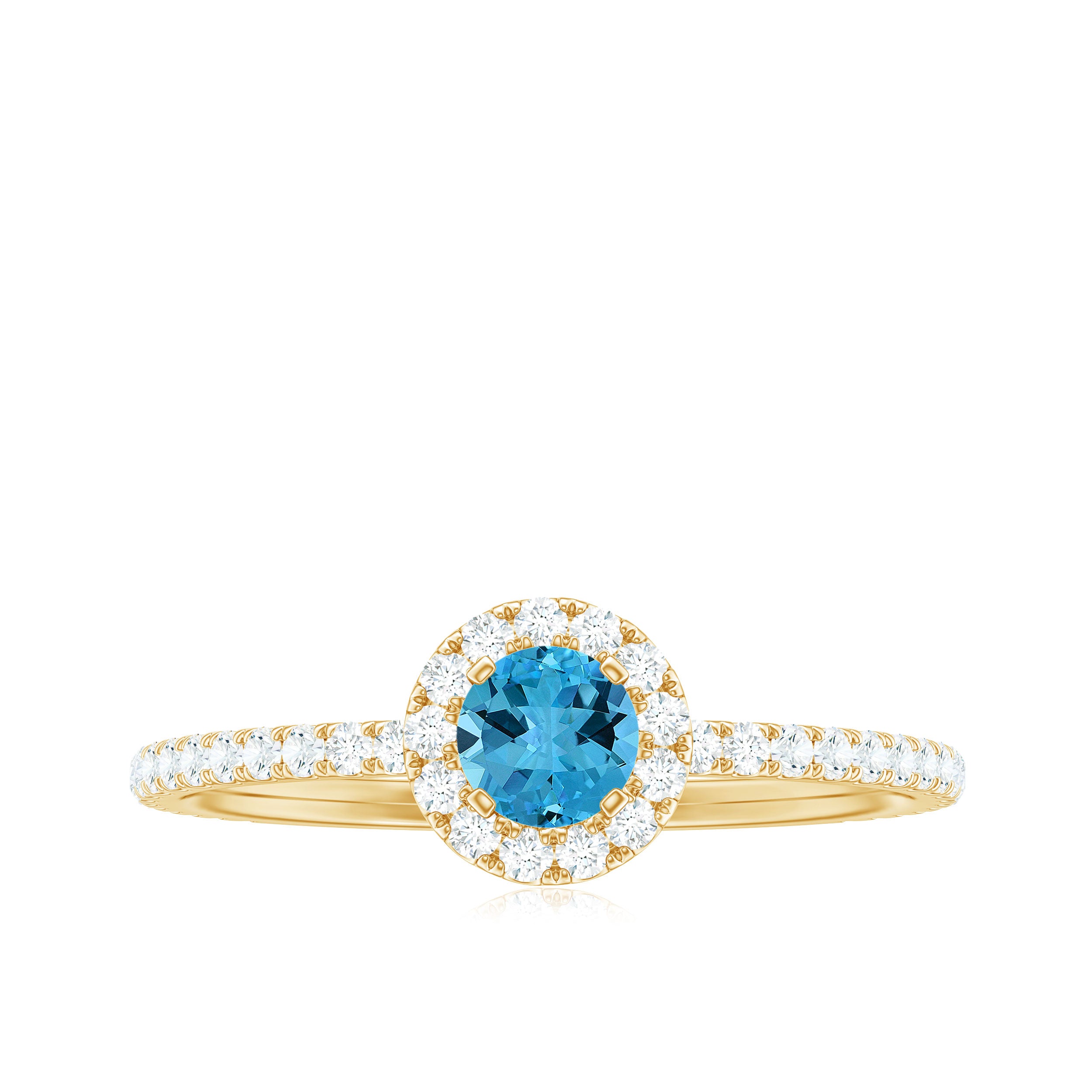 She is going to fall in love all over again when she sees this stunning London Blue Topaz and Diamond Ring. Designed for the one who lights up your world, this Blue Topaz Engagement Ring is the perfect mix of color, sparkle, and meaningful style. At the center sits a 5 MM round London Blue Topaz of AAA quality, set in secure and string prong setting. Surrounding the topaz is a halo of shimmering round diamonds that catch the light from every angle. More diamonds are set along the band, giving it that extra sparkle without being too over the top. This Minimal Engagement Ring feels special without trying too hard. It is simple, elegant, and eye-catching all at once. Whether you are planning a surprise proposal or picking it out for a birthday gift, it is a piece that will always remind her of this exciting chapter of your lives. It is also super comfortable to wear, with a smooth finish that makes it perfect for everyday wear and not just special occasions. Whether she loves classic styles or prefers something with a bit of color, this Round Blue Topaz Ring fits right in. Made with love and crafted to last, this December Birthstone Ring is a promise, a memory, and a whole lot of joy wrapped into one.