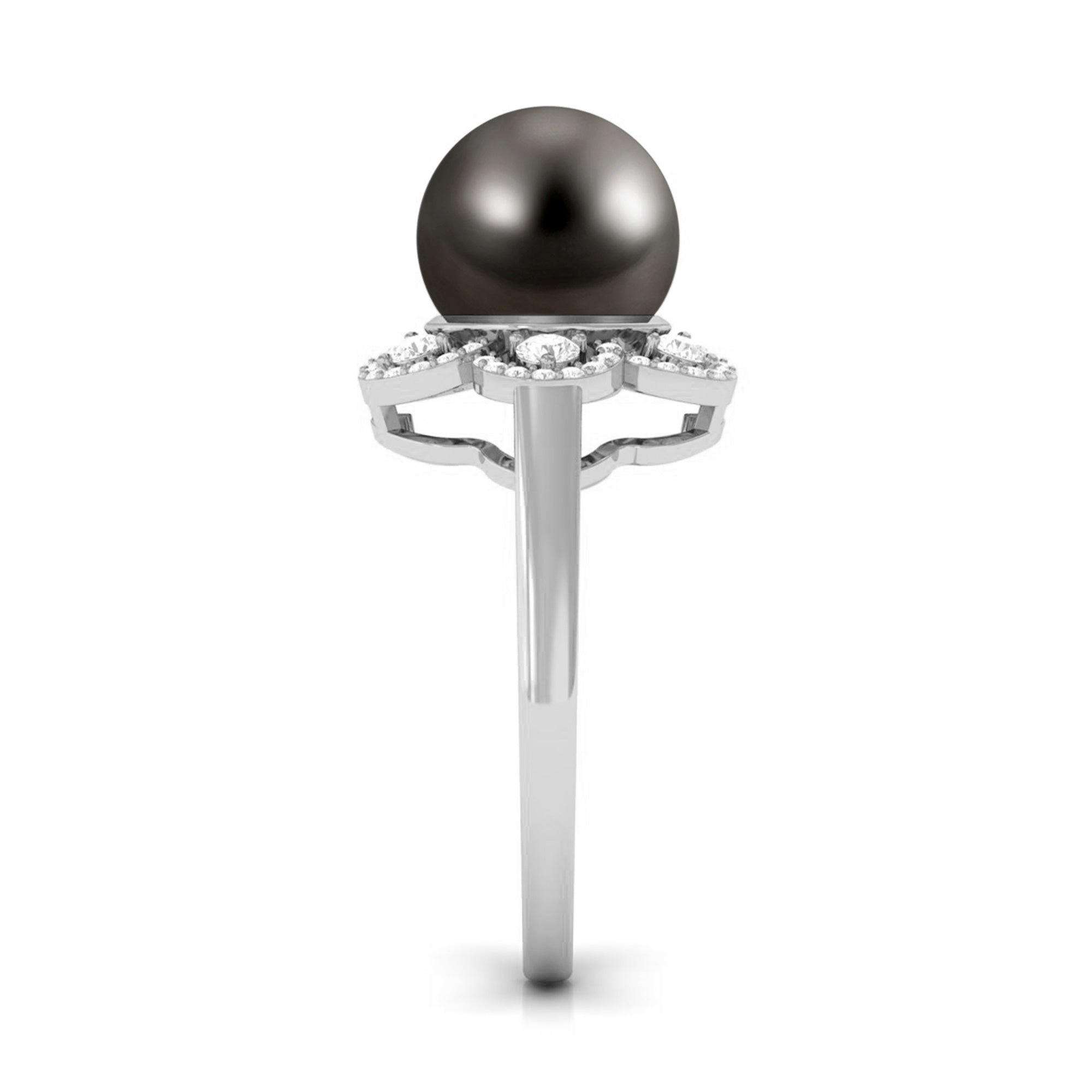Bloom with beauty and brilliance with this breathtaking Natural Tahitian Pearl Flower Cocktail Ring with Diamond. The centerpiece of this stunning ring is a magnificent Tahitian pearl, renowned for its exotic allure and luminous glow. Its deep, lustrous hue, reminiscent of the Tahitian lagoon, is accentuated by a sparkling halo of Diamond, adding a touch of glamour and sophistication. The rings intricate design evokes the delicate beauty of a flower, with each petal carefully crafted to capture the natural elegance of the pearl. It is the perfect ring that fits in any occasion.