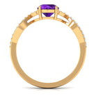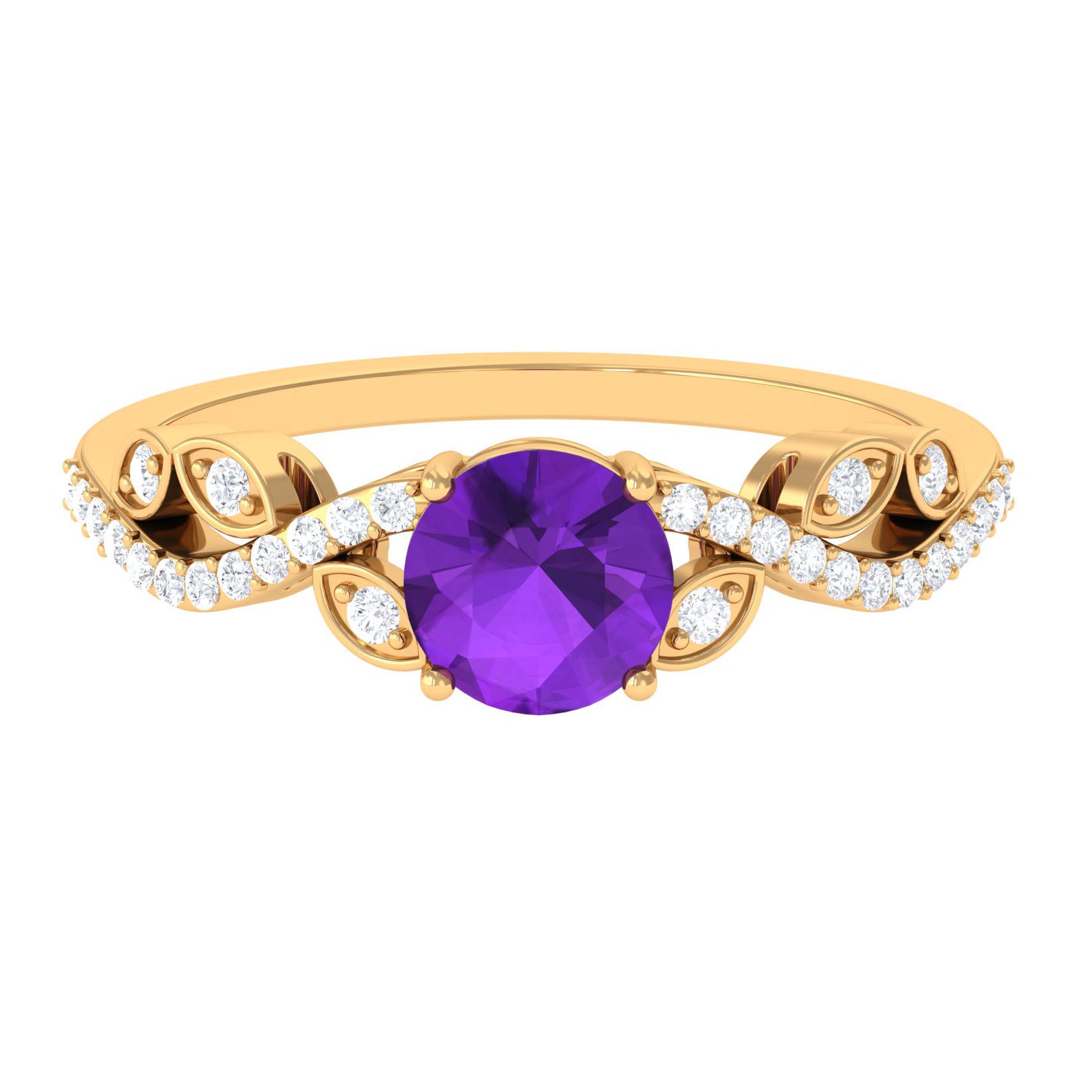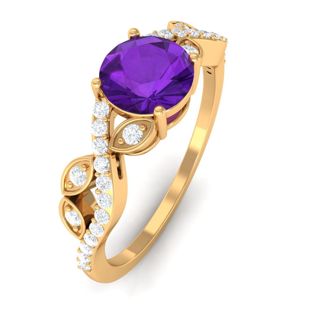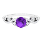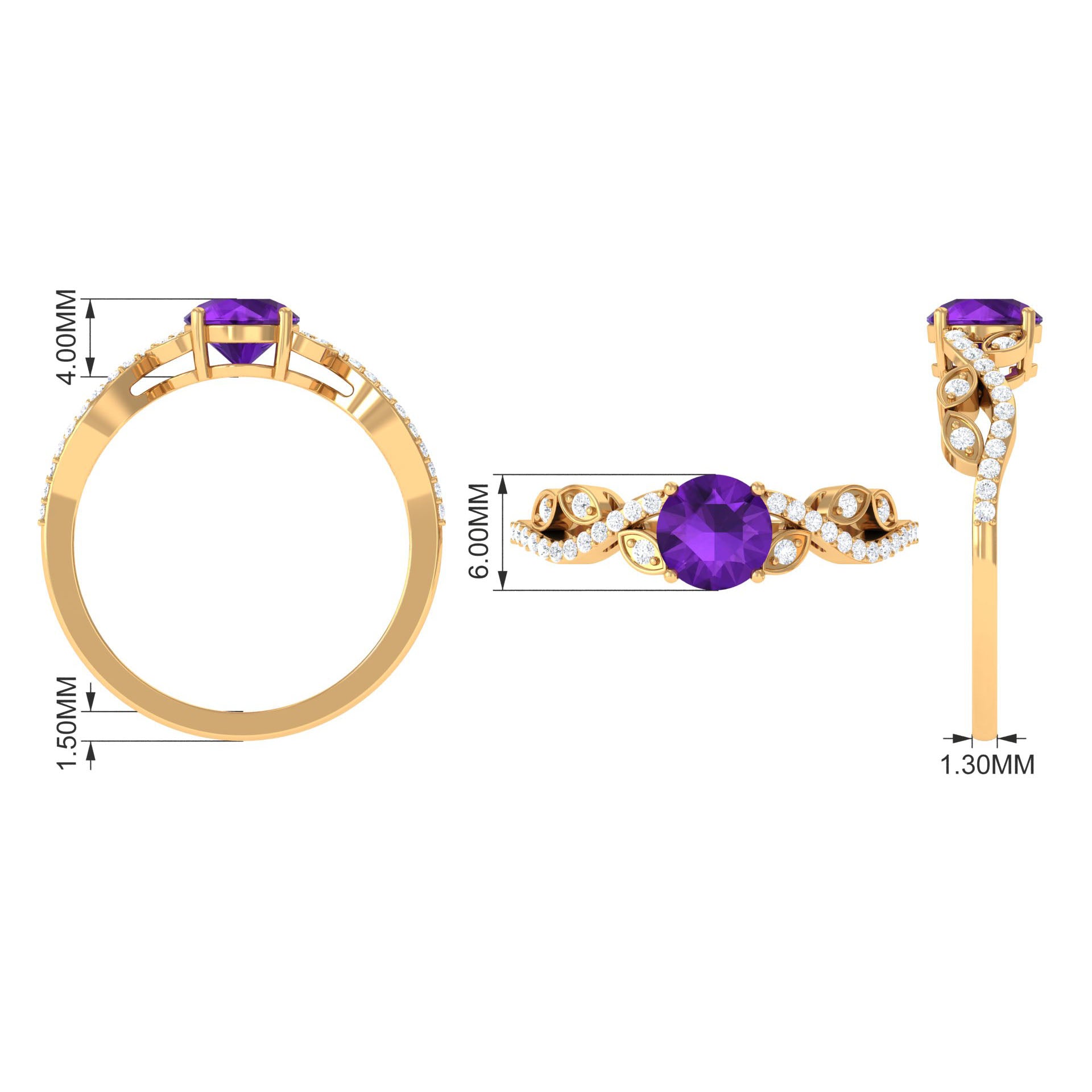 Pop the question with an Amethyst Engagement Ring as elegant as her! It displays the grand center stone of 7 MM Round Shape Amethyst secured by Prong Setting that very effortlessly manages to steal the limelight with its royal pop of purple. It is nestled atop a band inspired by the lush flora of nature, the beauty of which is best brought out by the embellishment of Round Shape Diamond over it. Let this Certified Amethyst Engagement Ring forever serve as the true testament of your timeless love.