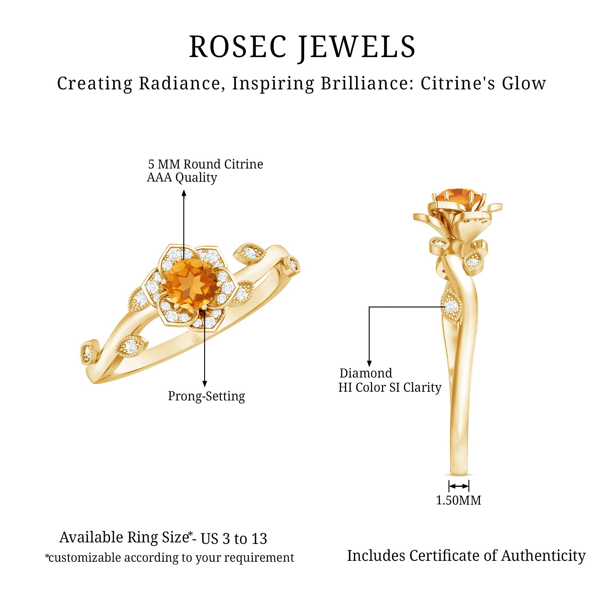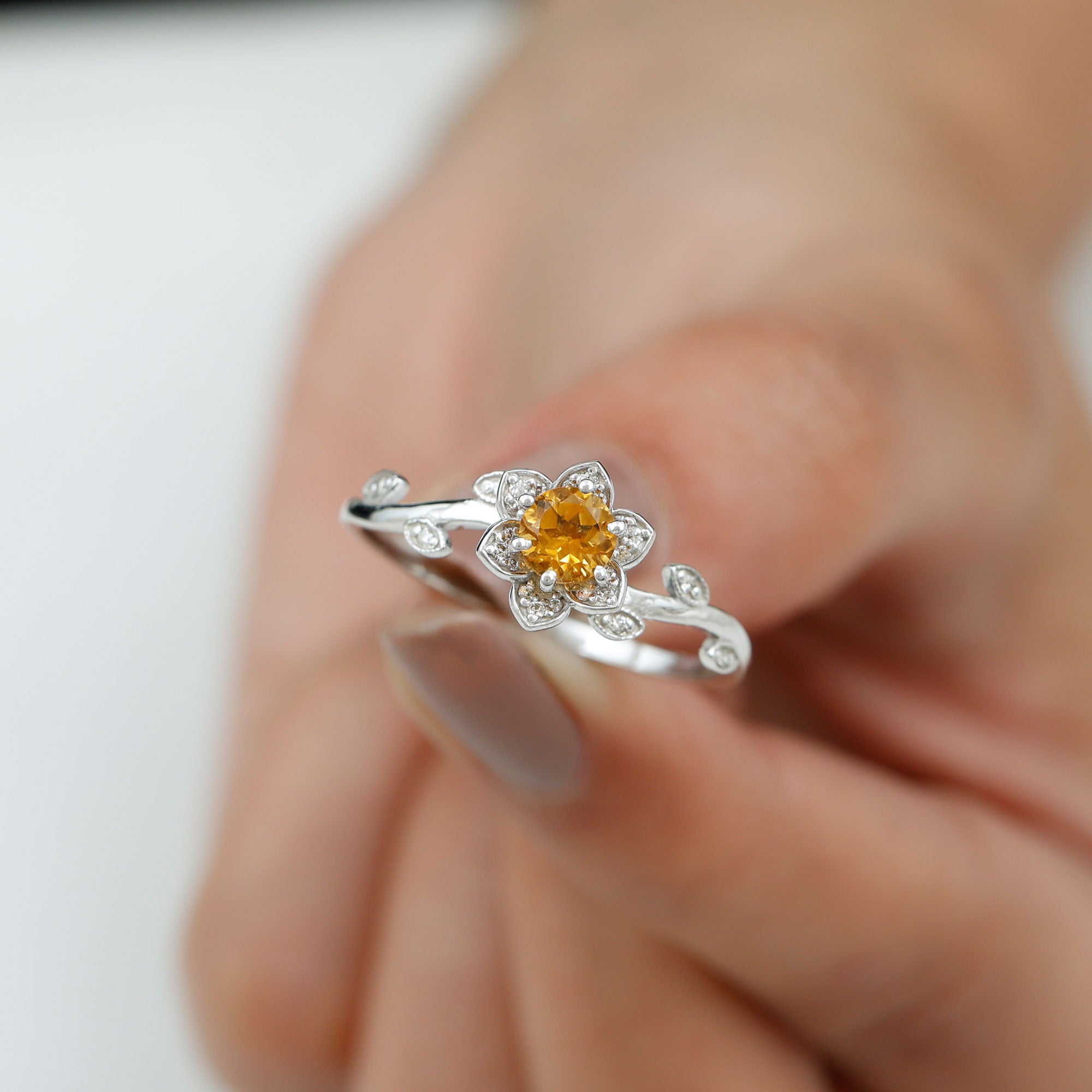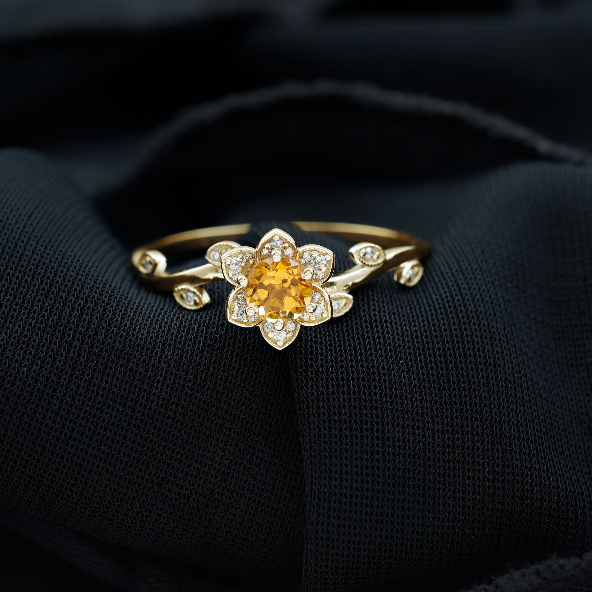Experience the beauty of nature with this enchanting Nature Inspired Ring. A Round Shape Citrine Solitaire sits at the center, surrounded by petals adorned with Round Shape Diamond, creating a stunning floral design. The Metal Leaf design is further accentuated with additional Diamond, adding to its allure. Embrace the elegance and charm of this exquisite ring, a perfect choice for nature lovers and those who appreciate unique and captivating designs.