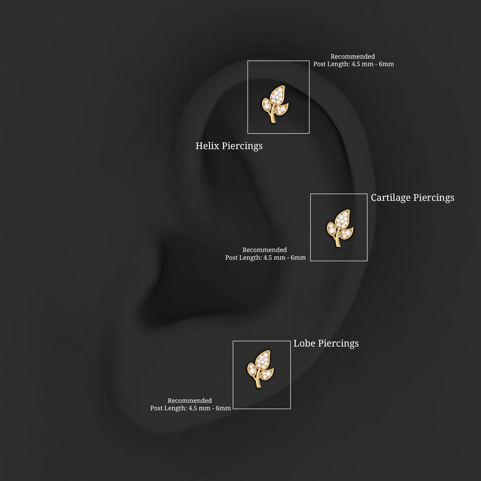 Embrace the beauty of nature wherever you venture with these stunning Diamond Leaf Earrings, which represent the pinnacle of elegance and style. The earring showcases certified round brilliant cut diamonds set in a leaf design, radiating beauty that echoes the treasures of nature. Perfect for Helix, Cartilage, Tragus, or Upper lobe piercings, this Nature Inspired Earring allows you to express your unique personality. This diamond cartilage earring is a symbol of love and sophistication, featuring a flat back closure that keeps it securely in place. Crafted from Hallmarked Metal, the Cartilage Stud Earring provides a unique and delightful way to display your style in the city. Make any occasion special with this Diamond Ear Piercing, whether its a birthday, graduation, anniversary, or just a gesture to show you care. Whether worn alone as a standout piece or layered with other earrings for a curated ear aesthetic, it effortlessly complements both minimalist and bold fashion choices.