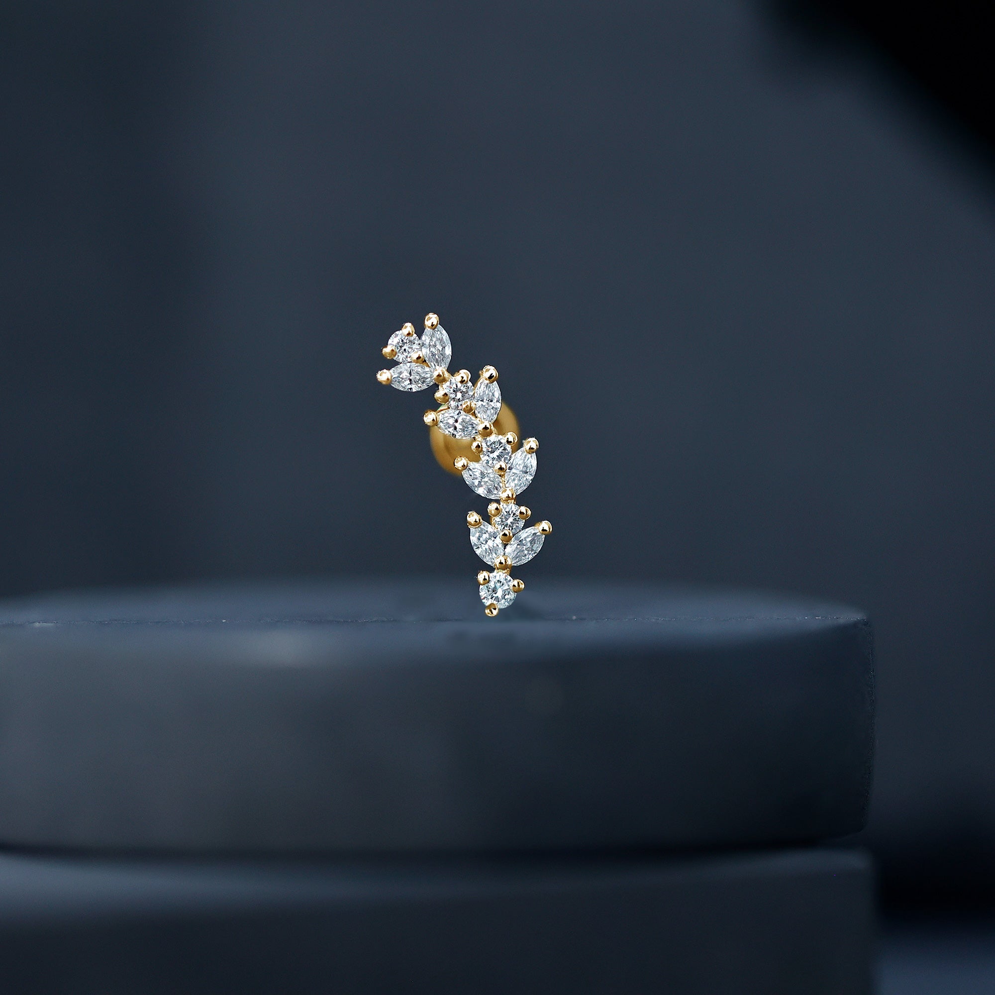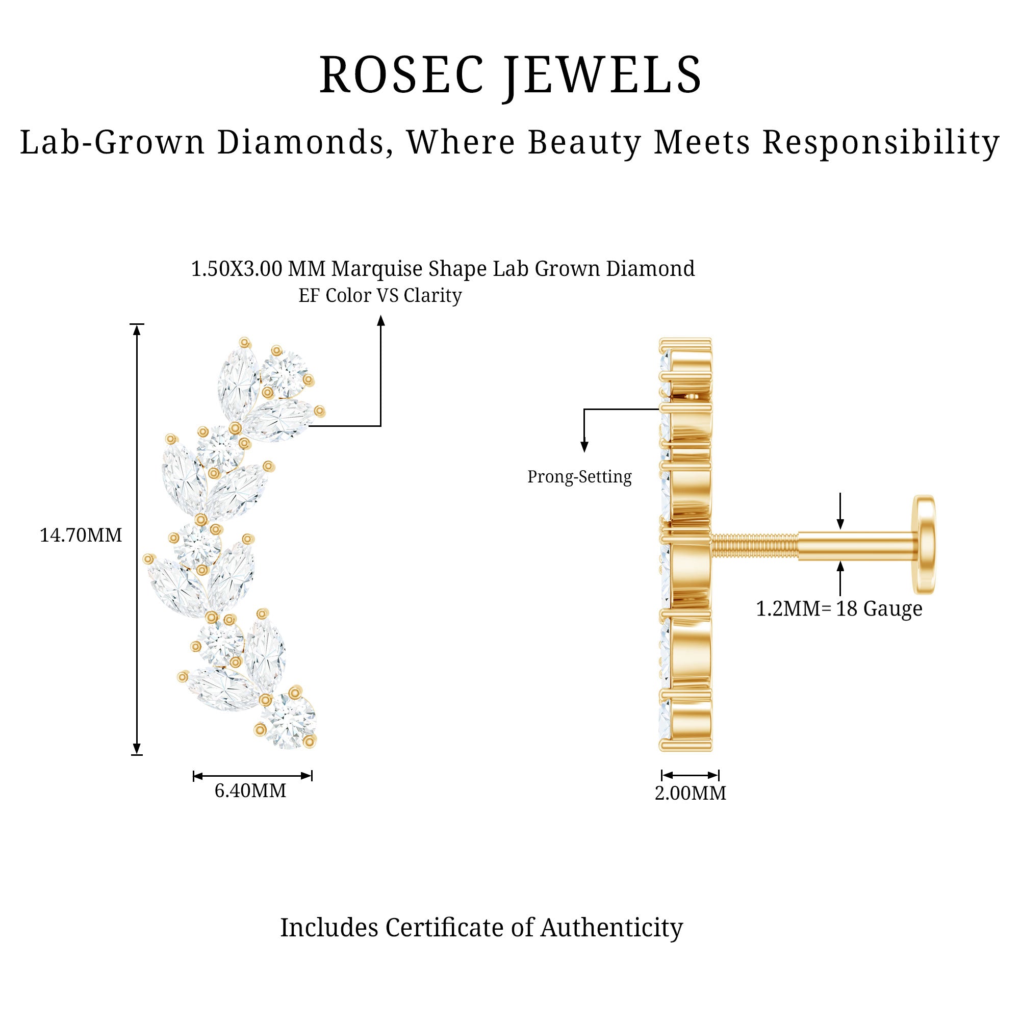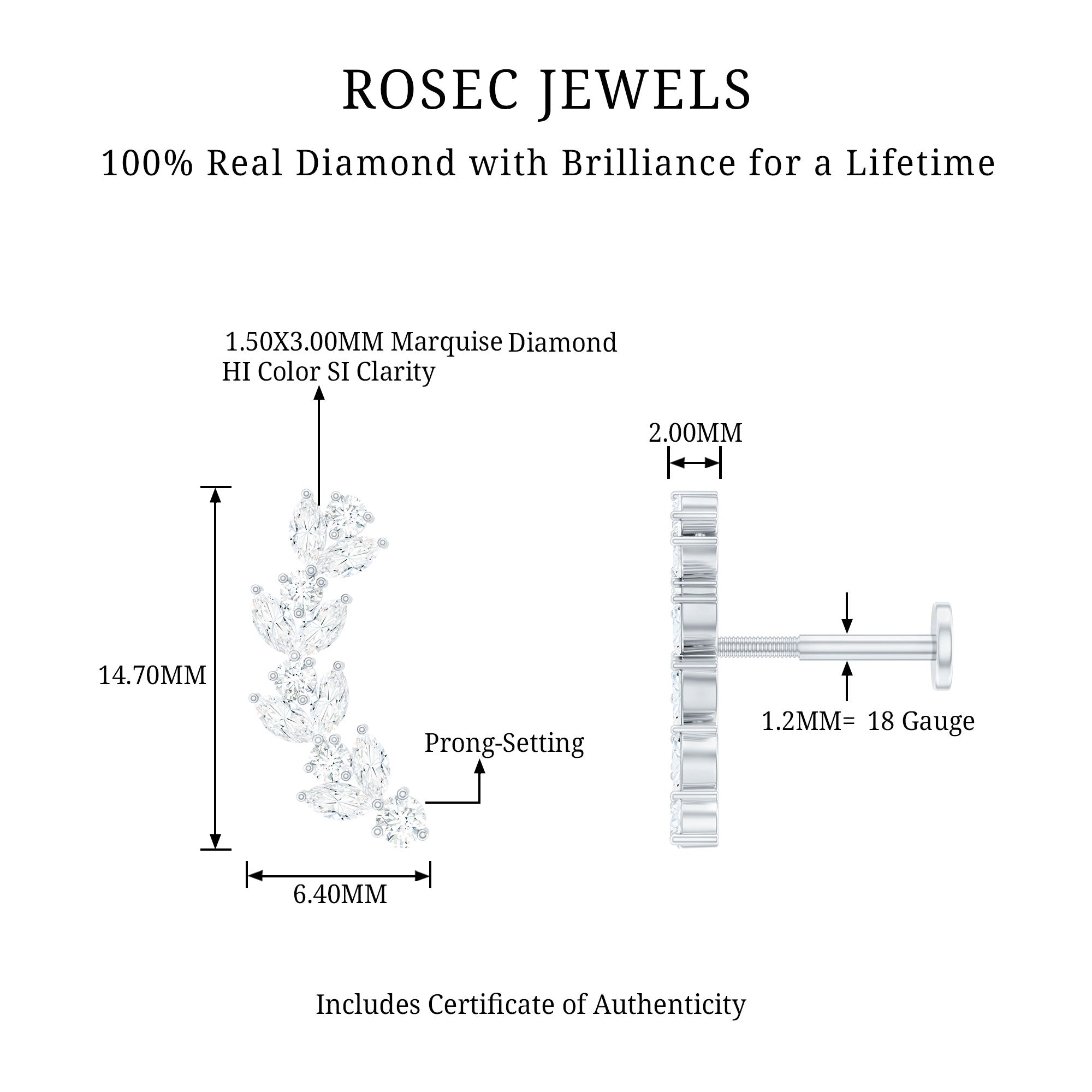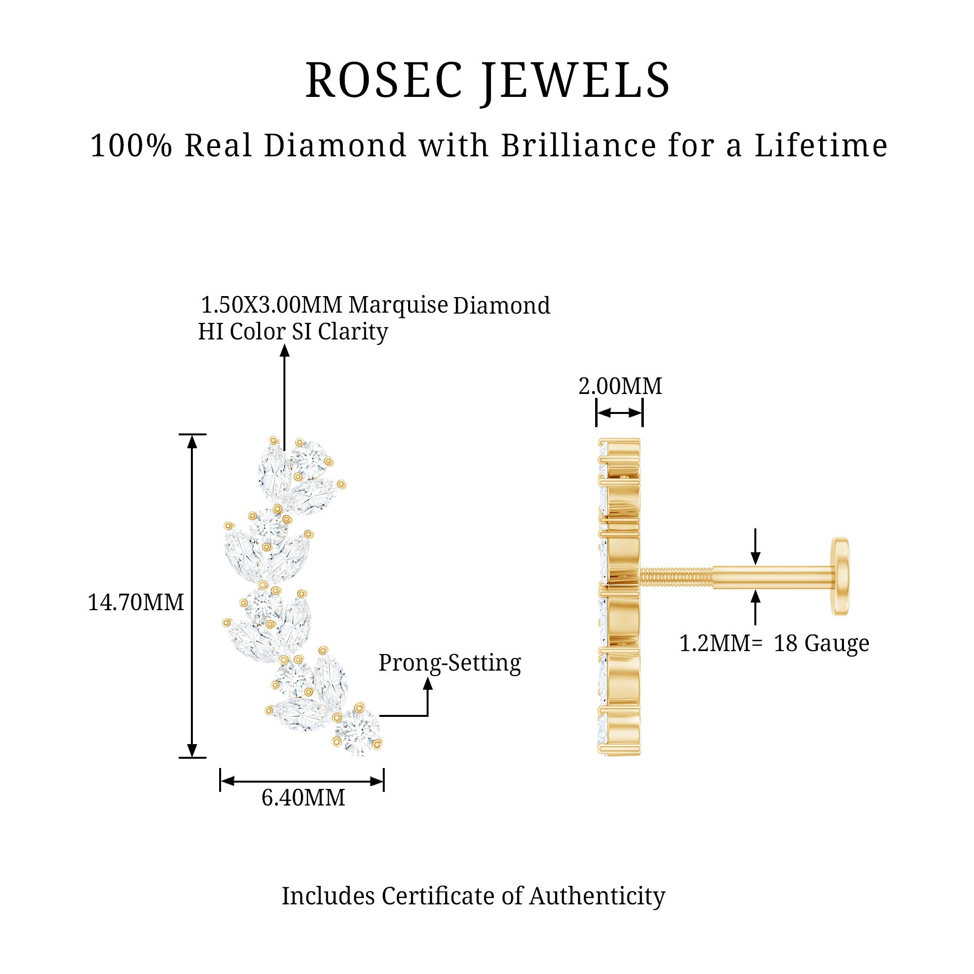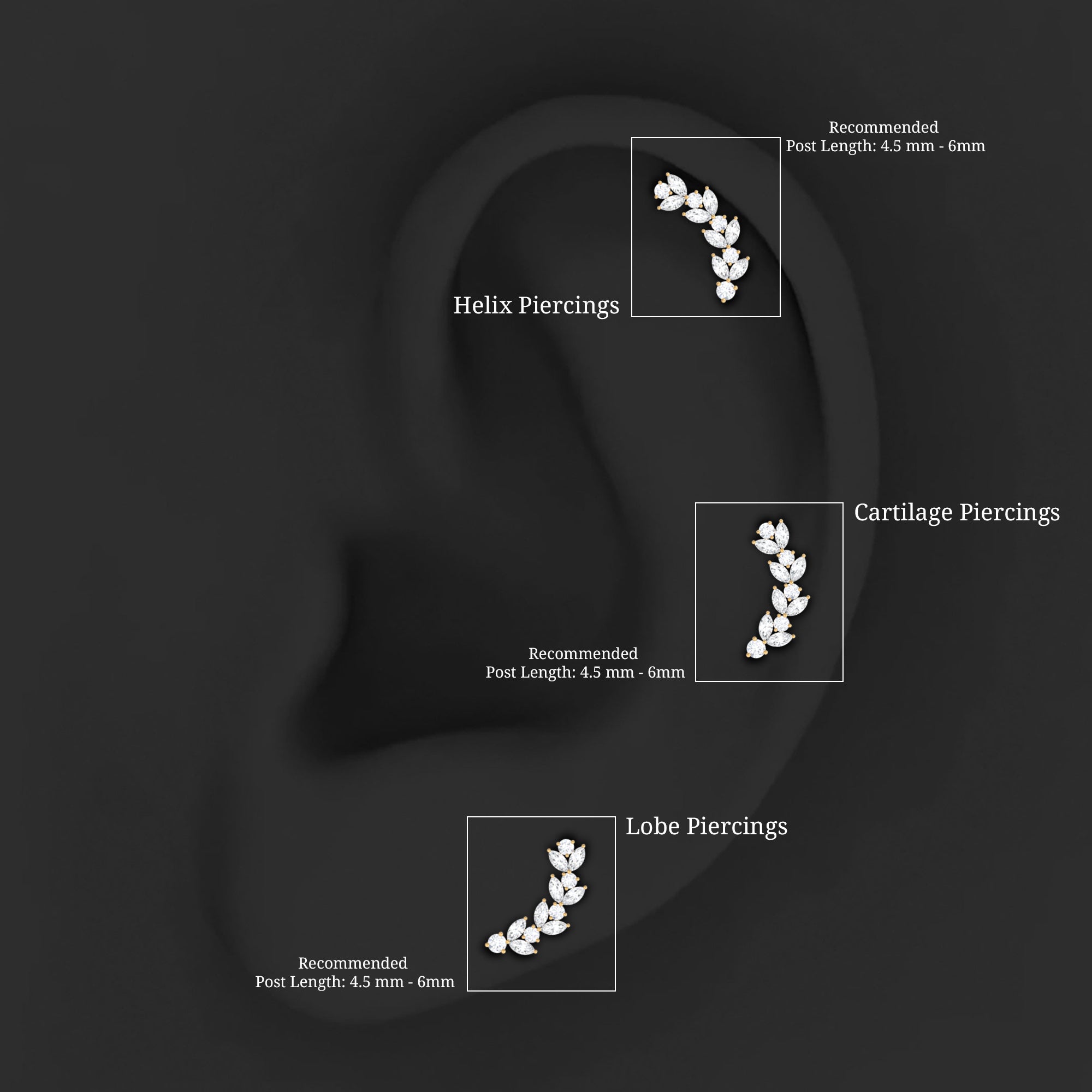 This cluster of leaves emits a divine glow. This leaf crawler earring features marquise and round diamonds secured in prong setting. Secures comfortably with a flat back closure. This diamond leaf earring effortlessly adds some nature-inspired flair to your ensemble, without straying too far from that lavish style you adore. There are endless ways to style this piercing earring, pair this marquise diamond earring with studs, hoops, or any bold, statement pieces of jewelry. You can wear it on your multiple piercings like Helix, Cartilage, or Upper Lobe Piercing. Its sleek and modern look makes it versatile enough to pair with casual outfits, evening wear, or a more sophisticated and layered ear stack. Perfect for trendsetters and jewelry lovers, this Diamond Helix Earring adds a bold yet elegant accent to your style. Crafted with care, the Curved Earring is designed to combine sparkle, comfort, and durability. Gift this earring to your special one and wait for her priceless reaction!