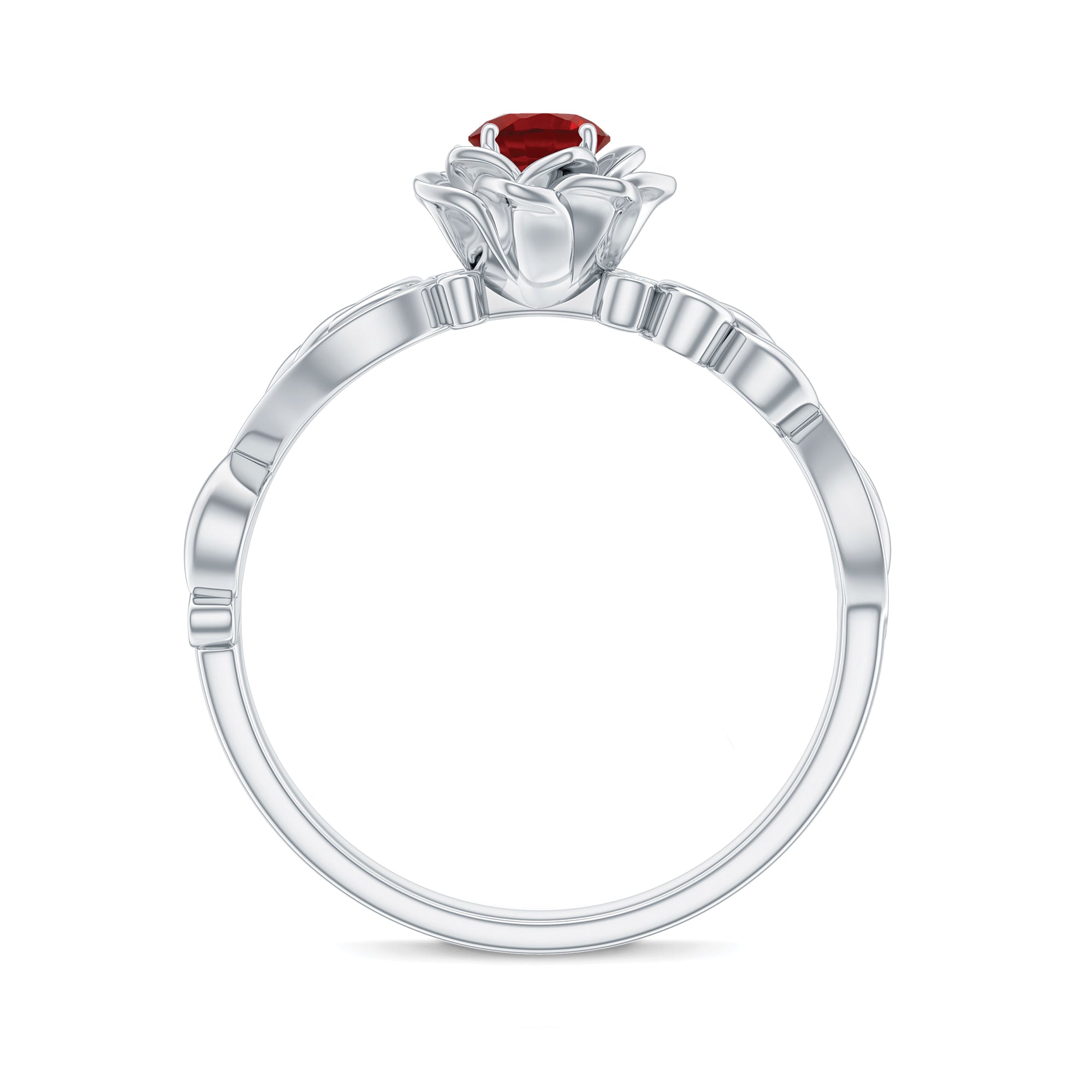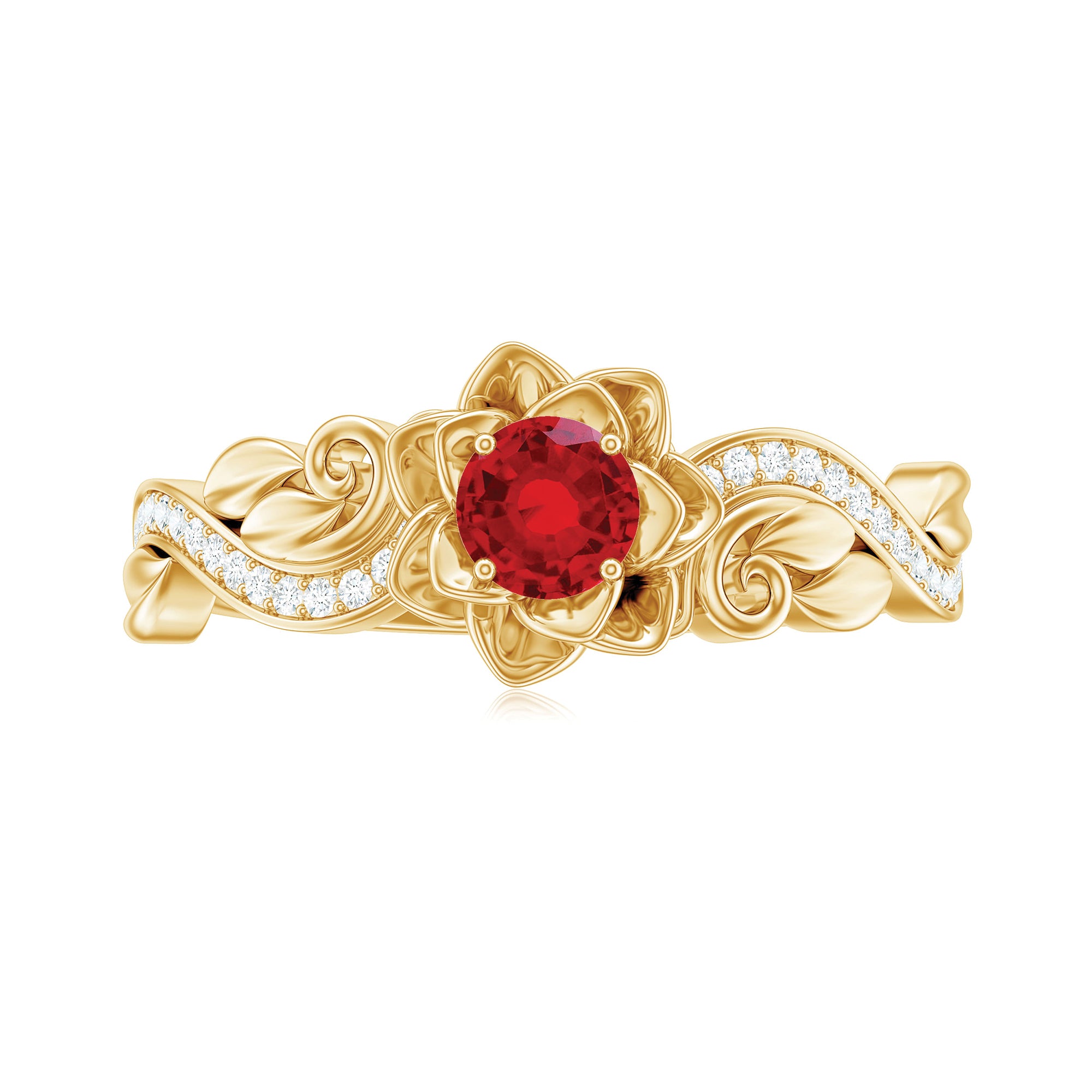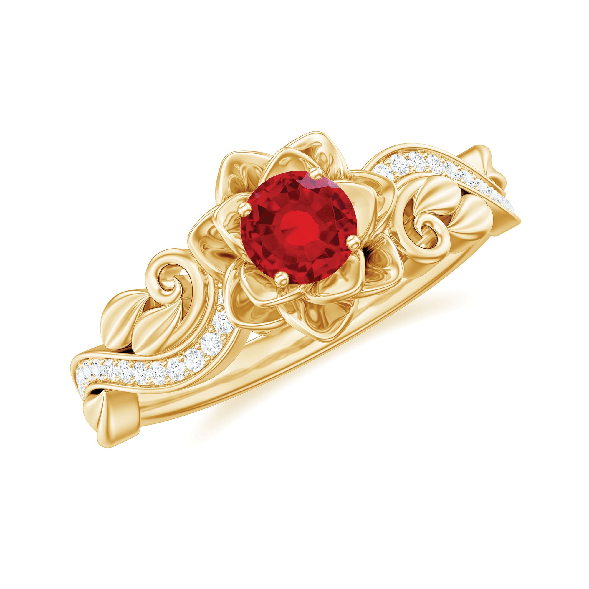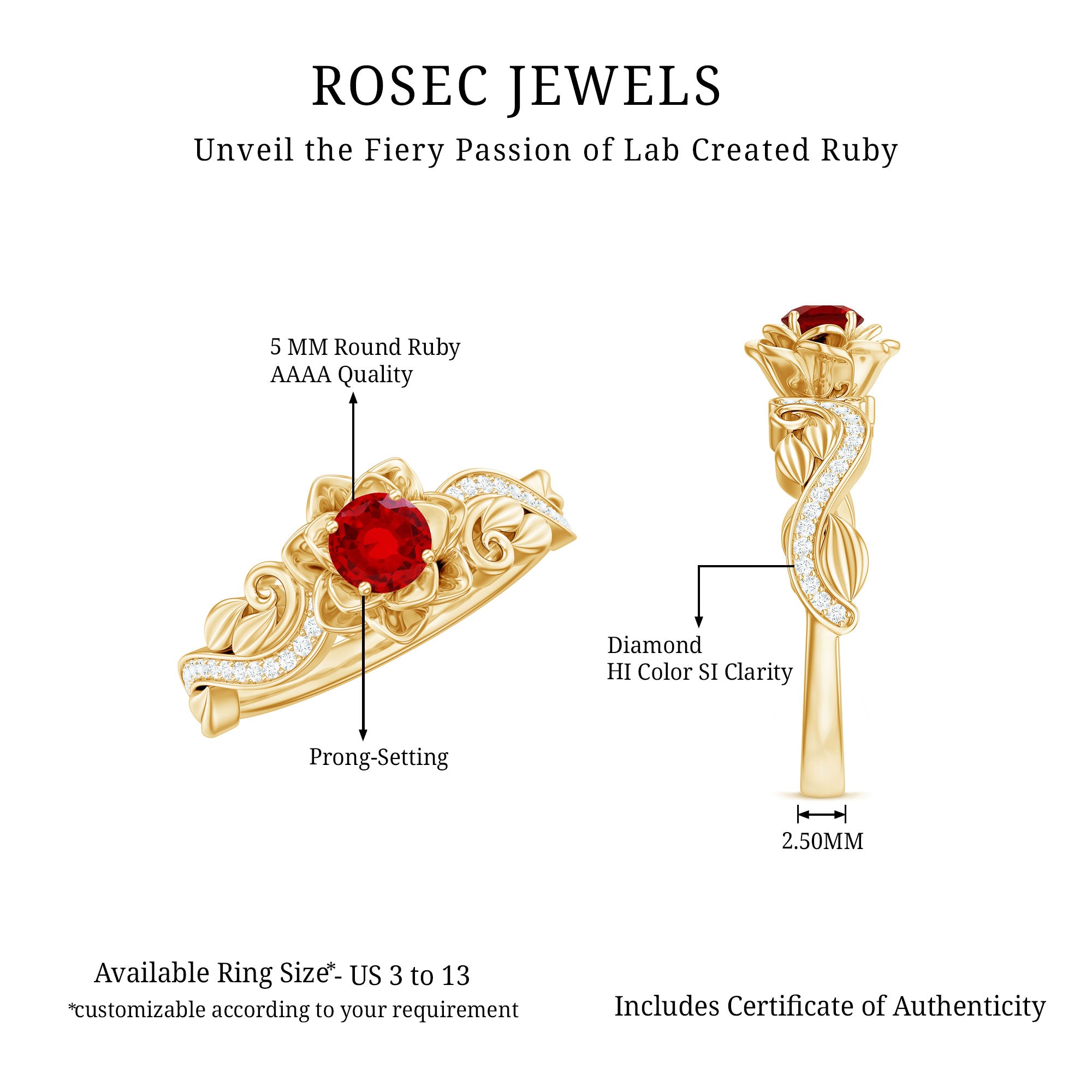 There is something truly special about our Ruby Flower Ring, it feels like it was made just for your love story. This Lab Grown Ruby Engagement Ring takes inspiration from nature, with soft floral details and a rich red center stone that catches the eye and warms the heart. At the center sits a 5 MM round lab created ruby, carefully held in prong setting that rests gently on a detailed rose flower design. The shape of the petals adds a soft and graceful touch, making the ruby look like it is blooming right from the band. Along the sides, delicate leaves and tiny engravings give the Flower Engagement Ring a natural look. Small round diamonds are set into the leaves, adding just the right amount of sparkle without taking away from the beauty of the ruby. The design feels romantic and full of meaning, like a quiet promise that lasts through every season. It is a ring made to mark something important, whether it is an engagement, anniversary, or simply a moment you want to remember forever. Comfortable for everyday wear but still striking enough for special occasions, this Ruby and Diamond Ring brings together charm, elegance, and a thoughtful design. It is available in a range of sizes and arrives in a lovely box, ready to be worn or gifted.