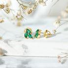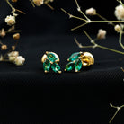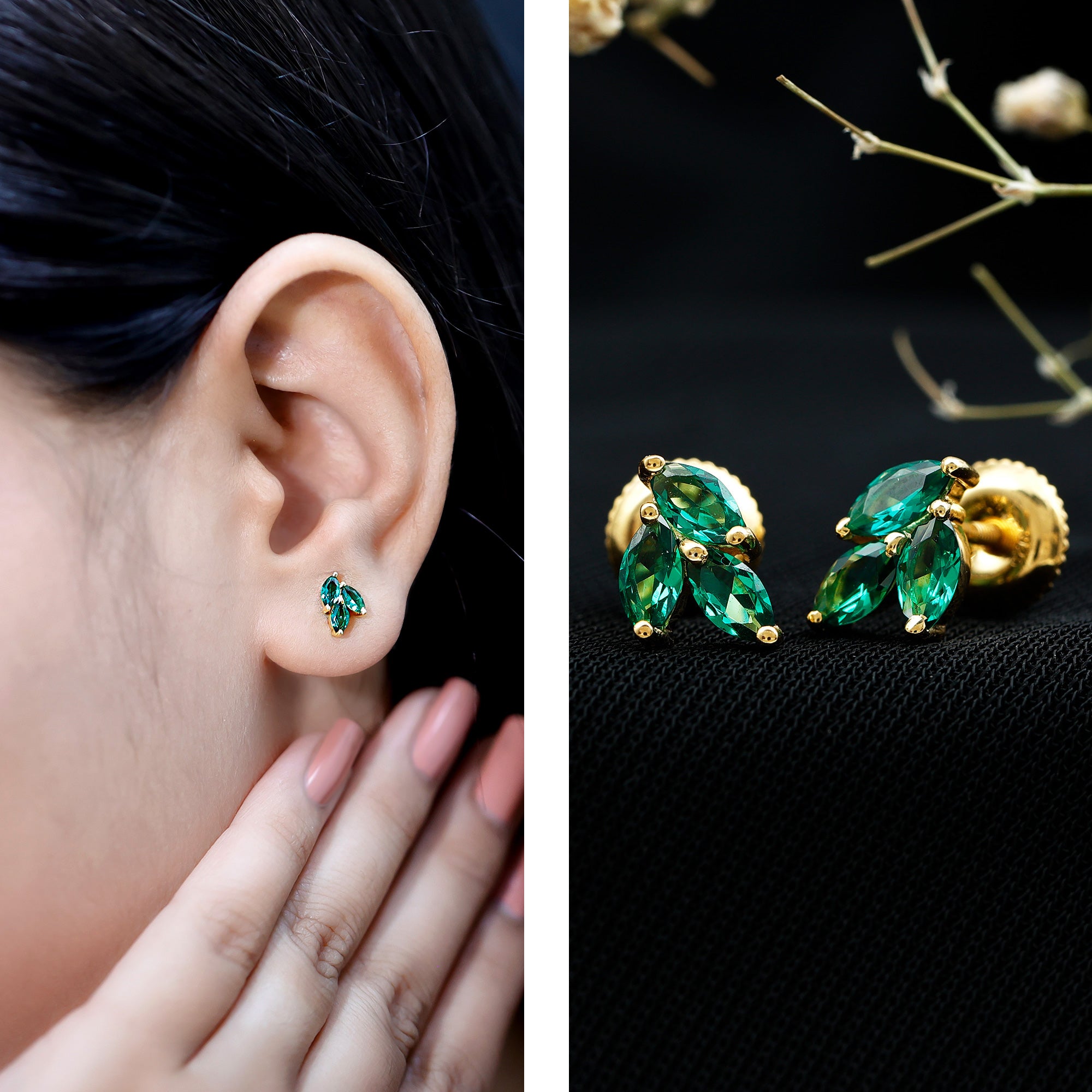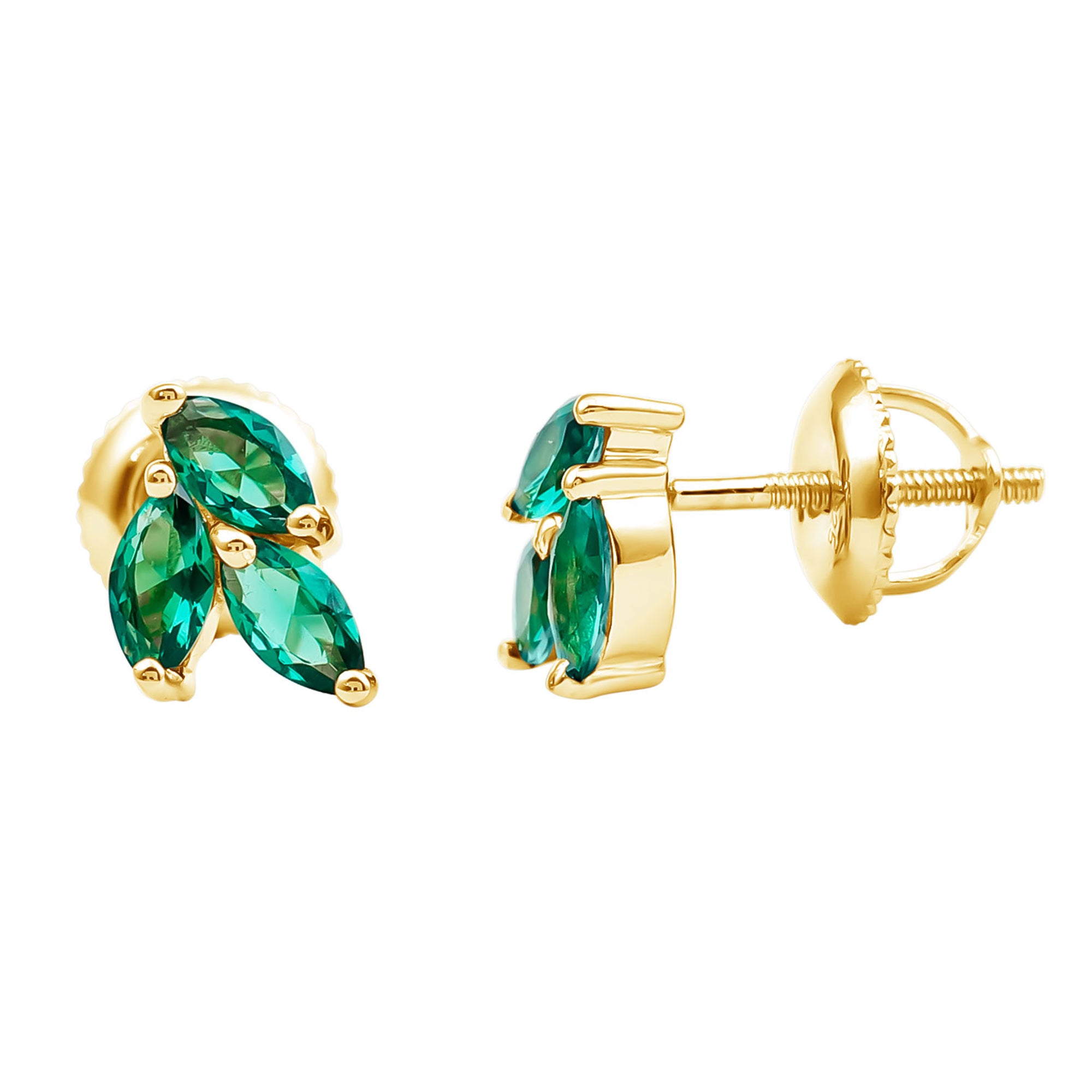 Add a touch of natures elegance to your style with these beautiful Lab Grown Emerald Stud Earrings. Inspired by the beauty of nature, the design of these Cluster Earrings resembles delicate leaves, making them a perfect piece for anyone who loves graceful jewelry. Each stud features three AAAA quality marquise shaped lab grown emeralds arranged in a stunning cluster that captures light beautifully and adds a natural, leafy charm to your ears. Crafted in yellow gold plated silver, these Leaf Stud Earrings combine a luxurious shine with a lightweight, comfortable feel. The secure screw-back closures ensure they stay in place all day, so you can wear them confidently on any occasion, be it a wedding, family gathering, festive event, or even a romantic dinner. Their simple yet unique design makes them versatile enough to pair with casual outfits or formal attire. The emeralds used are lab grown, making them a 100% ethical and environmentally friendly choice. These gemstones offer all the beauty and brilliance of natural emeralds while supporting a sustainable and responsible approach to jewelry. You will receive these Green Emerald Earrings in a signature jewelry box, along with a gemstone certificate to ensure quality and authenticity. Whether you are looking for a thoughtful gift or a treat for yourself, these Silver Leaf Earrings make a meaningful addition to any jewelry collection.