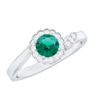 Elevate your promise with our Nature Inspired Promise Ring, a vision of elegance with a brilliant 6 mm Round Shaped Lab Created Emerald as the centerpiece. Encircled by a sparkling Lab Grown Diamond Floral Halo and adorned with a subtle leaf motif on the bypass shank, this Emerald Diamond Ring seamlessly blends natures beauty with modern minimalism. Meticulously crafted by Rosec Jewels, it stands as a testament to eco-conscious luxury, offering a conflict-free alternative that symbolizes your commitment in a uniquely captivating way.