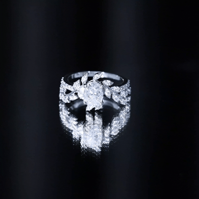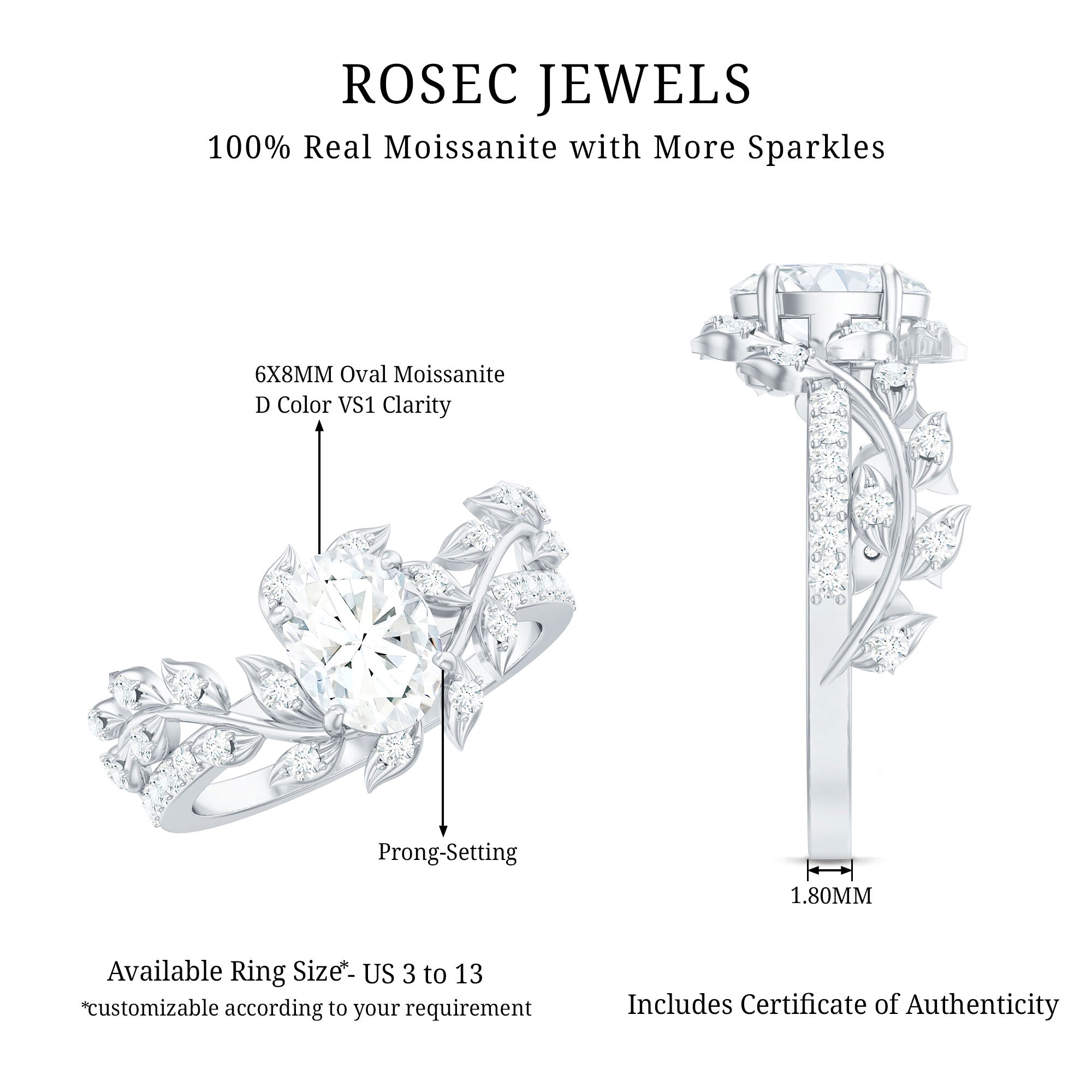 Directly picked from the garden of gemstones, this Moissanite Engagement Ring will definitely win her heart with its nature-inspired beauty. An Oval Shaped Moissanite is set in between floral leaf branch studded with petite round gemstones, seems like flower and leaves are covering the finger. The ring is crafted with 14K White Gold Plated Silver, featuring a 6X8 MM Oval Shape Moissanite securely placed in Prong Setting. This Flower Engagement Ring holds an adorable shine of D-VS1 Quality, which makes it perfect for the big day. This Nature Inspired Ring will be delivered to you in a velvet pouch with the certificate of authenticity.