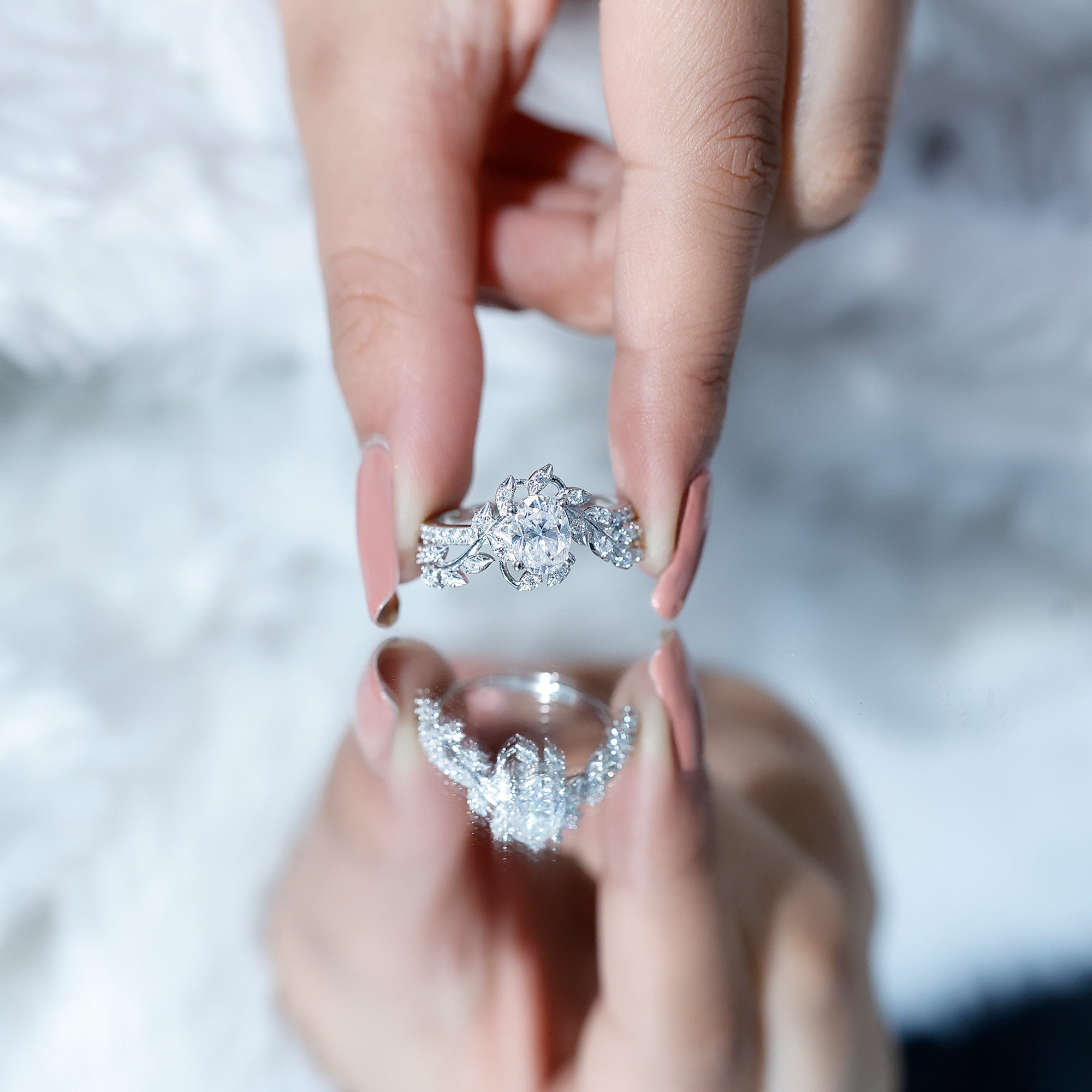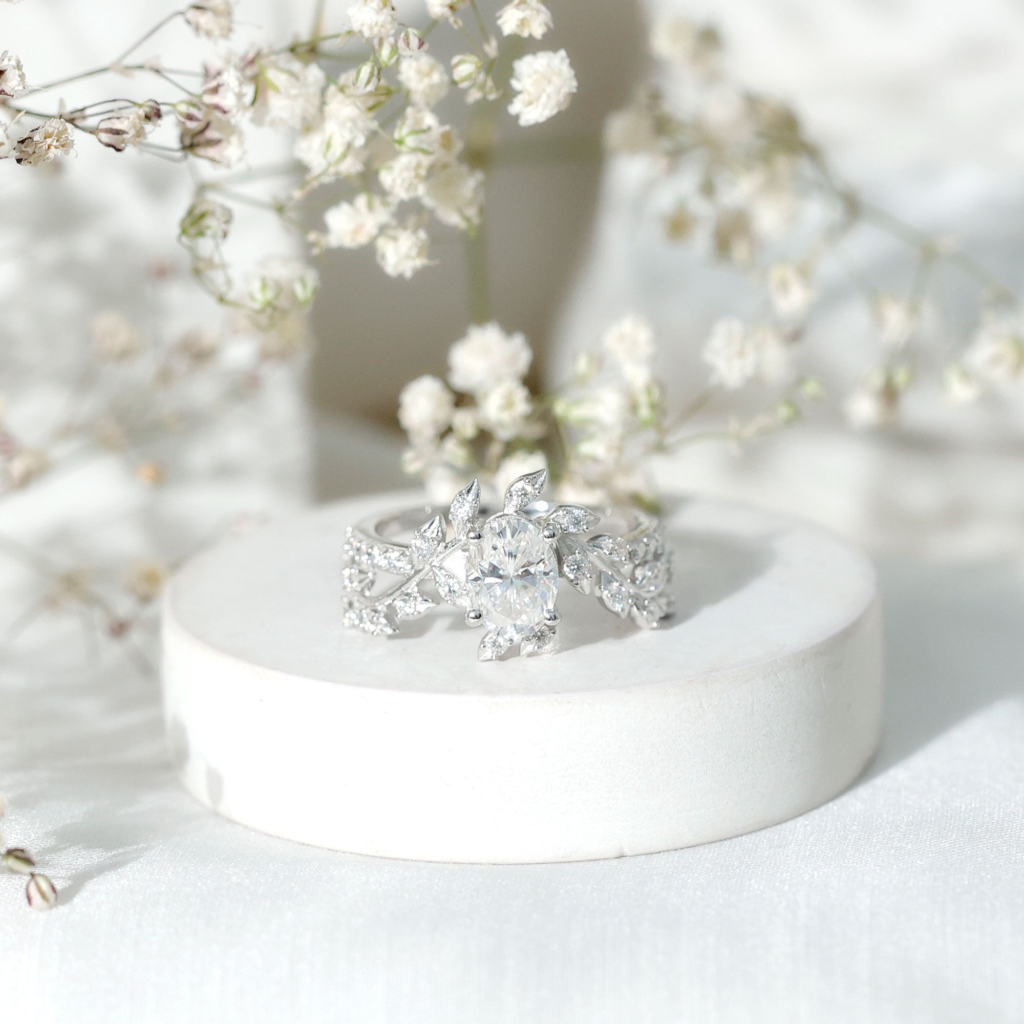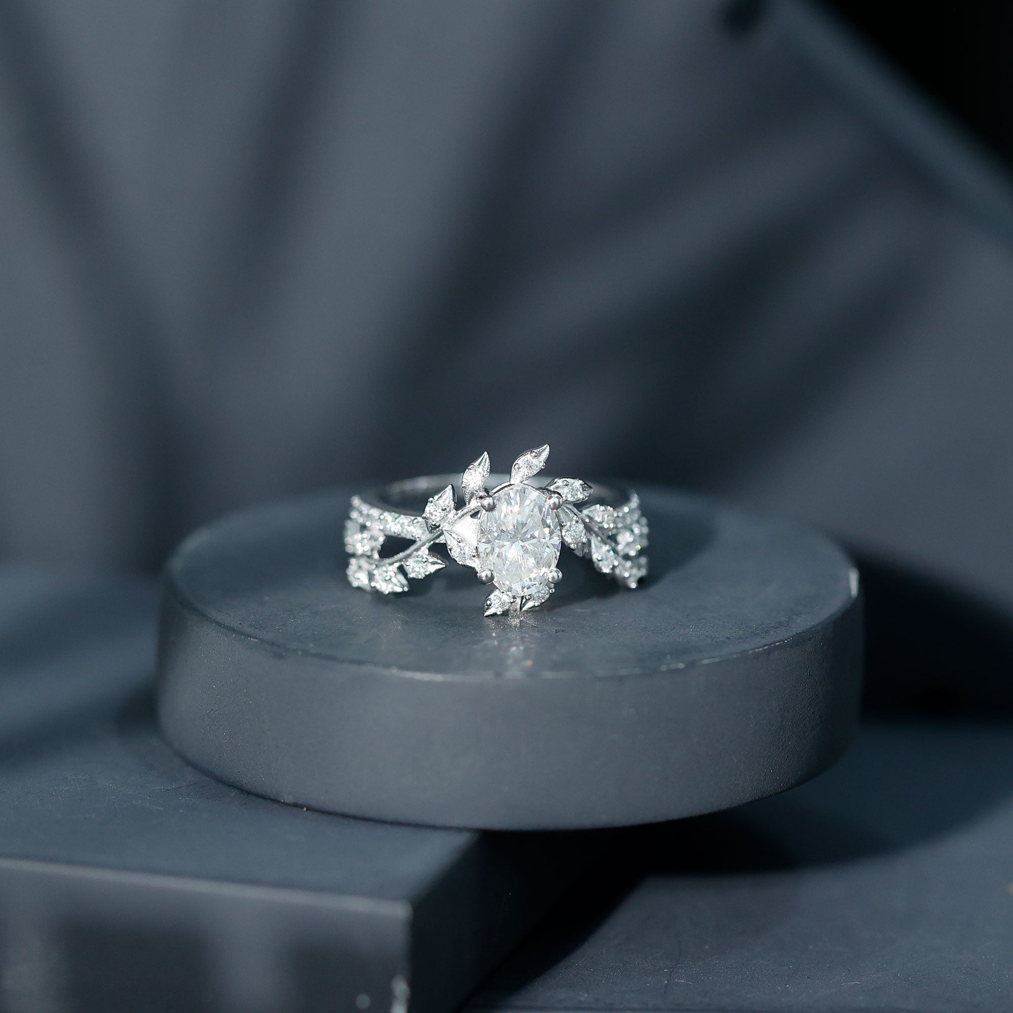 Nature Inspired Moissanite Oval Engagement Ring in Silver