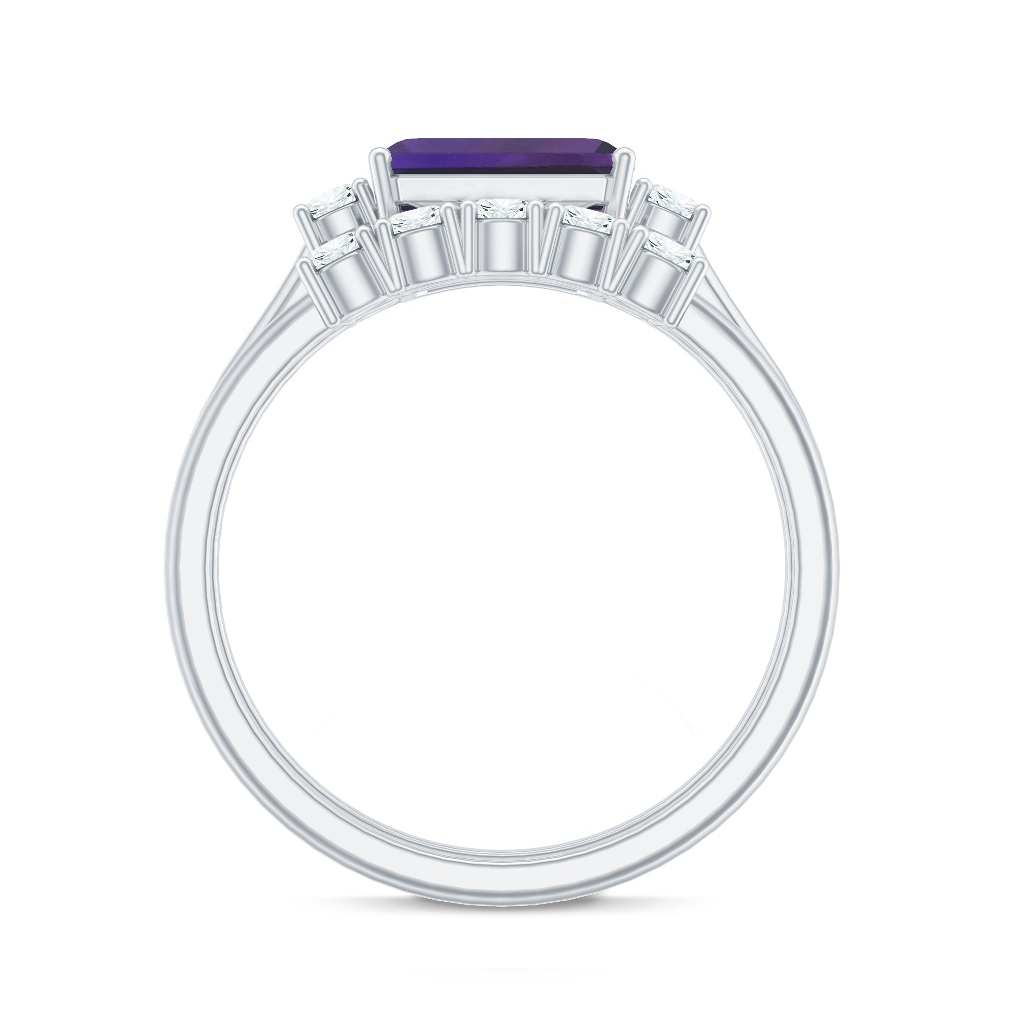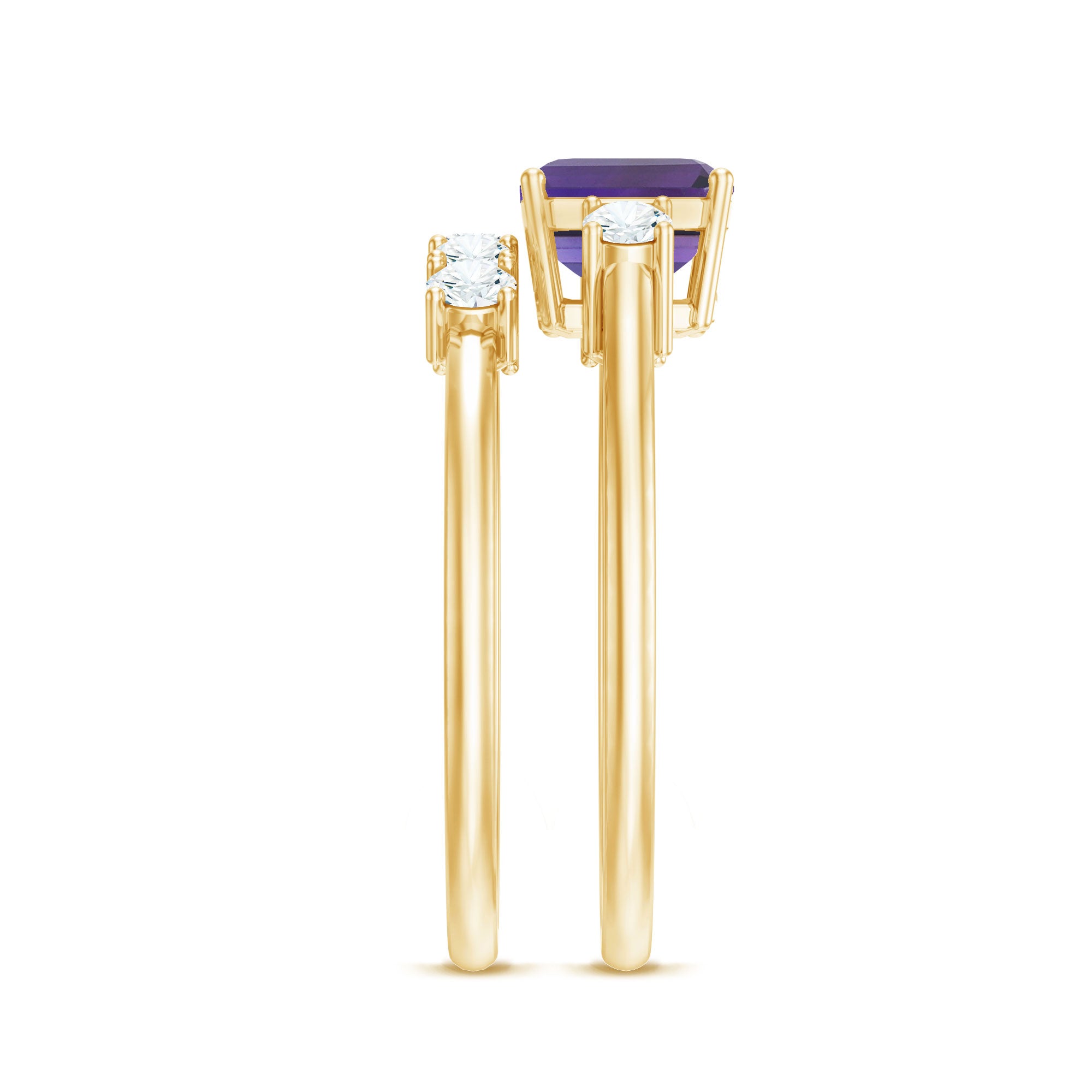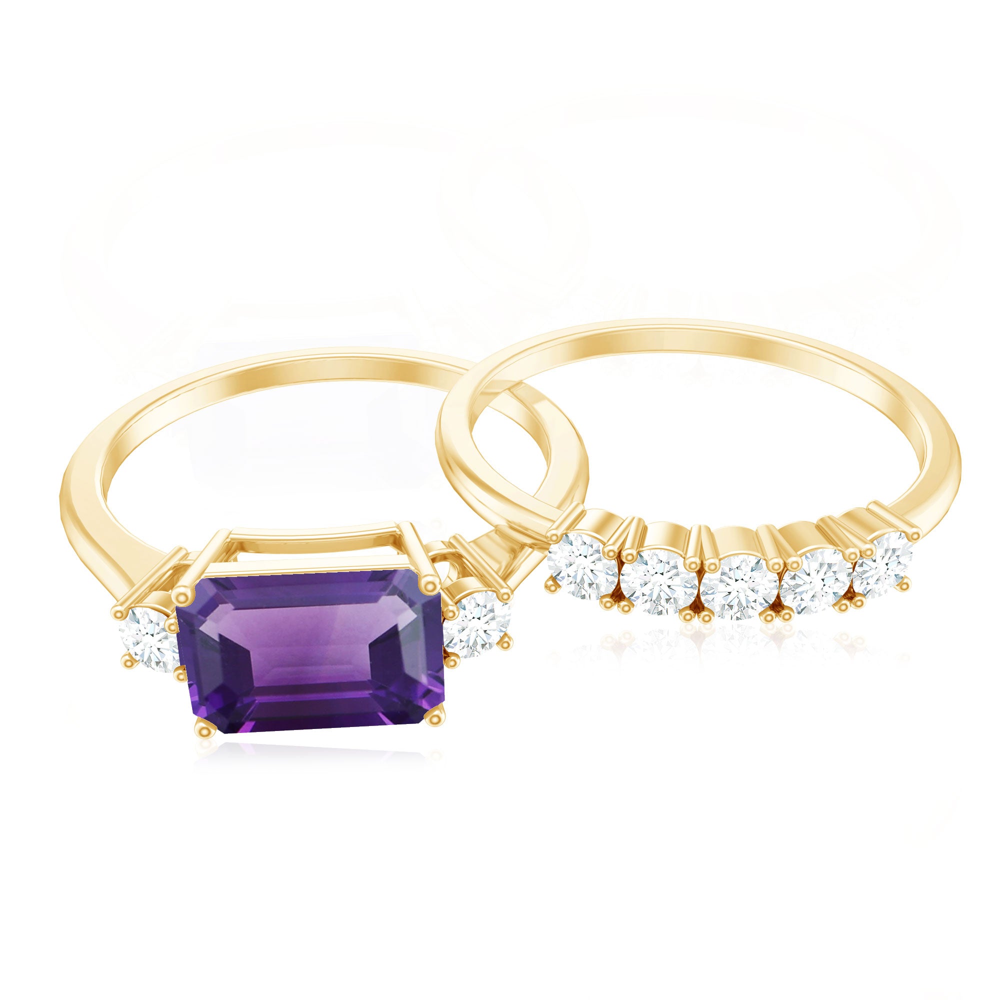 Say I do to a happily ever after with an Amethyst Bridal Ring Set, that promises just that! It comprises of a Classic Amethyst Ring with a matching wedding band. Sure to speak to the fashionista in her, the ring features a Single Center Stone of 6X8 MM Emerald Cut Amethyst that captivates with its vibrant purple hue. It is further complemented by Round Shape Diamond on either side for a subtle dash of sparkles. When teamed up with our matching Five Stone Diamond Band, it looks nothing less than a modern minimalists dream.