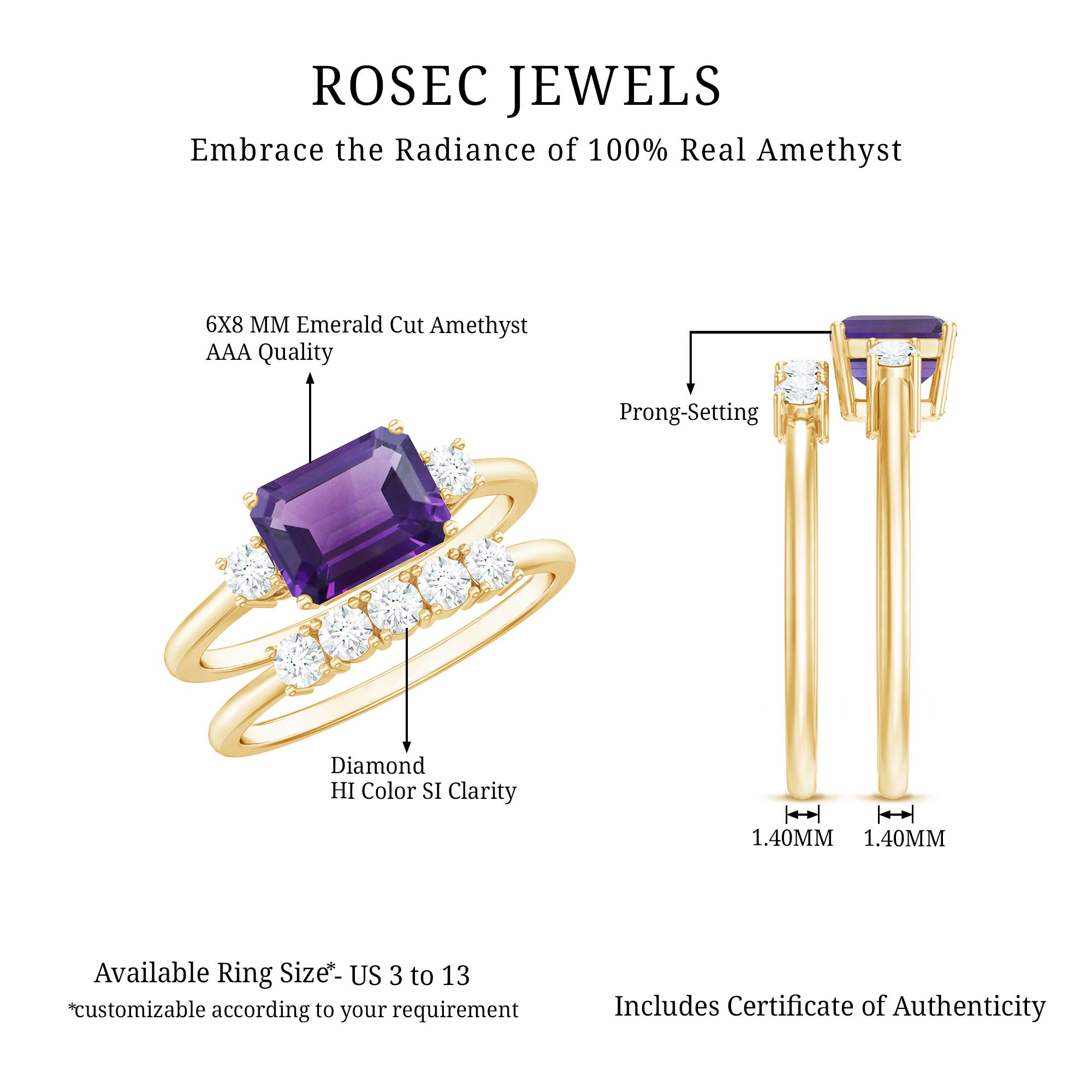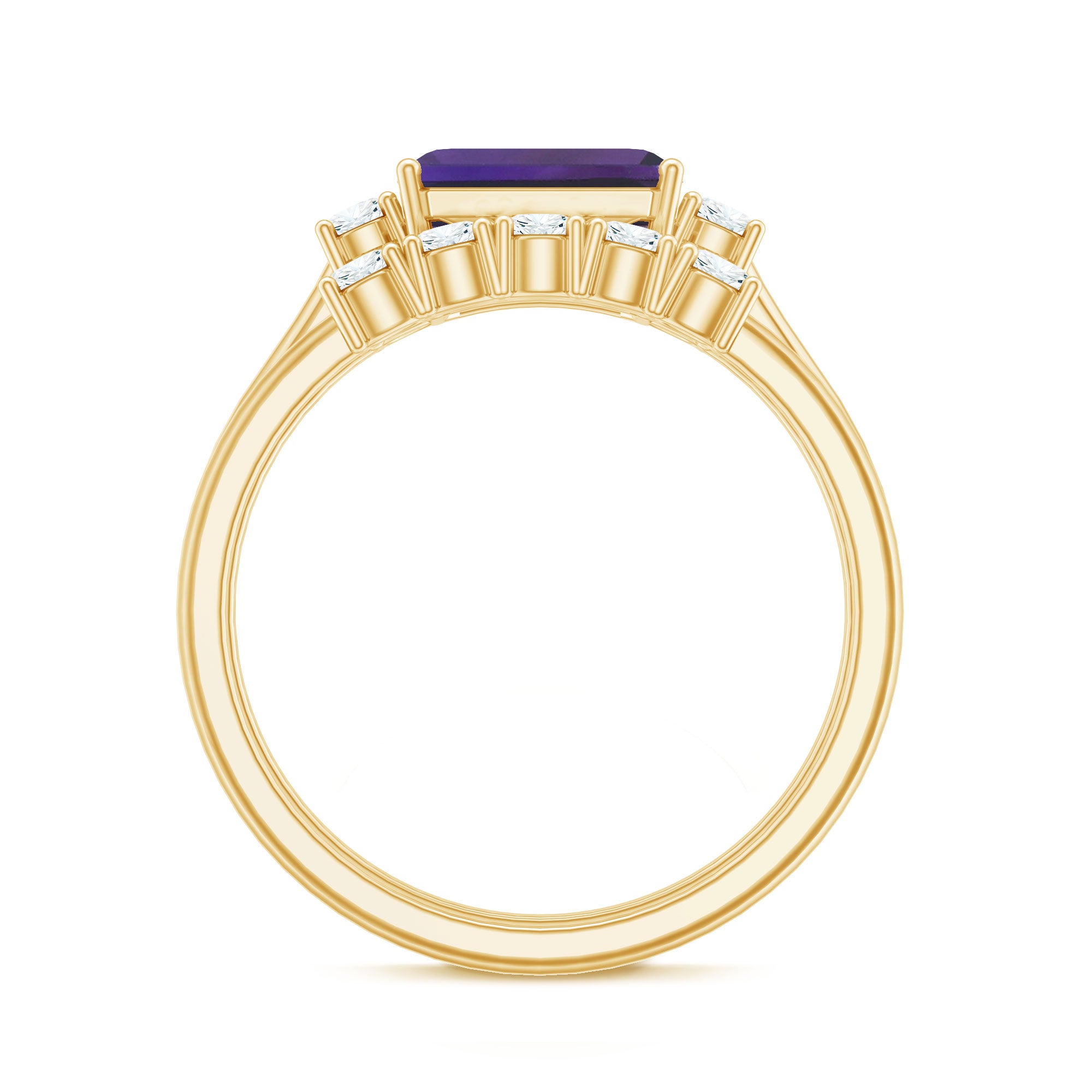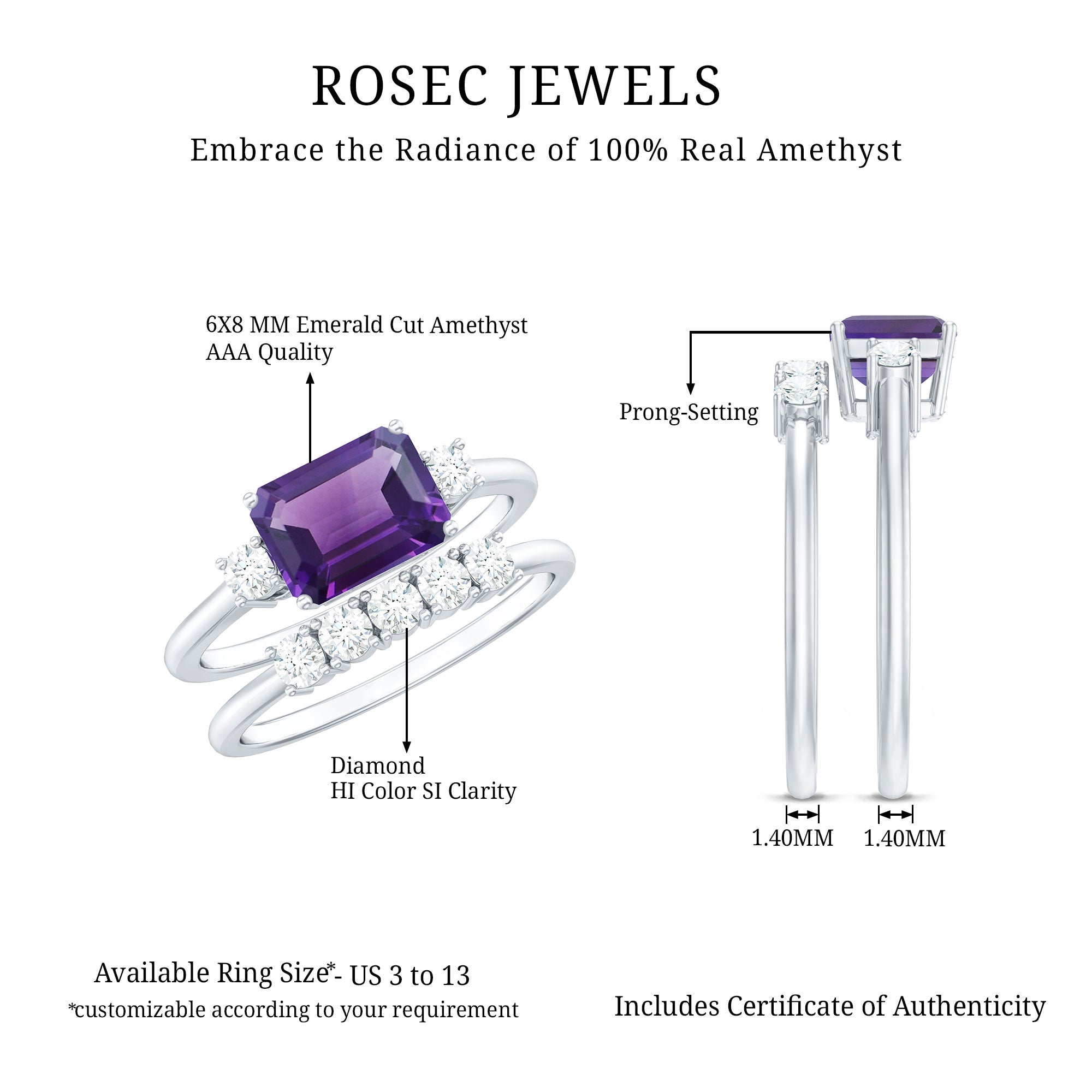 Say I do to a happily ever after with an Amethyst Bridal Ring Set, that promises just that! It comprises of a Classic Amethyst Ring with a matching wedding band. Sure to speak to the fashionista in her, the ring features a Single Center Stone of 6X8 MM Emerald Cut Amethyst that captivates with its vibrant purple hue. It is further complemented by Round Shape Diamond on either side for a subtle dash of sparkles. When teamed up with our matching Five Stone Diamond Band, it looks nothing less than a modern minimalists dream.